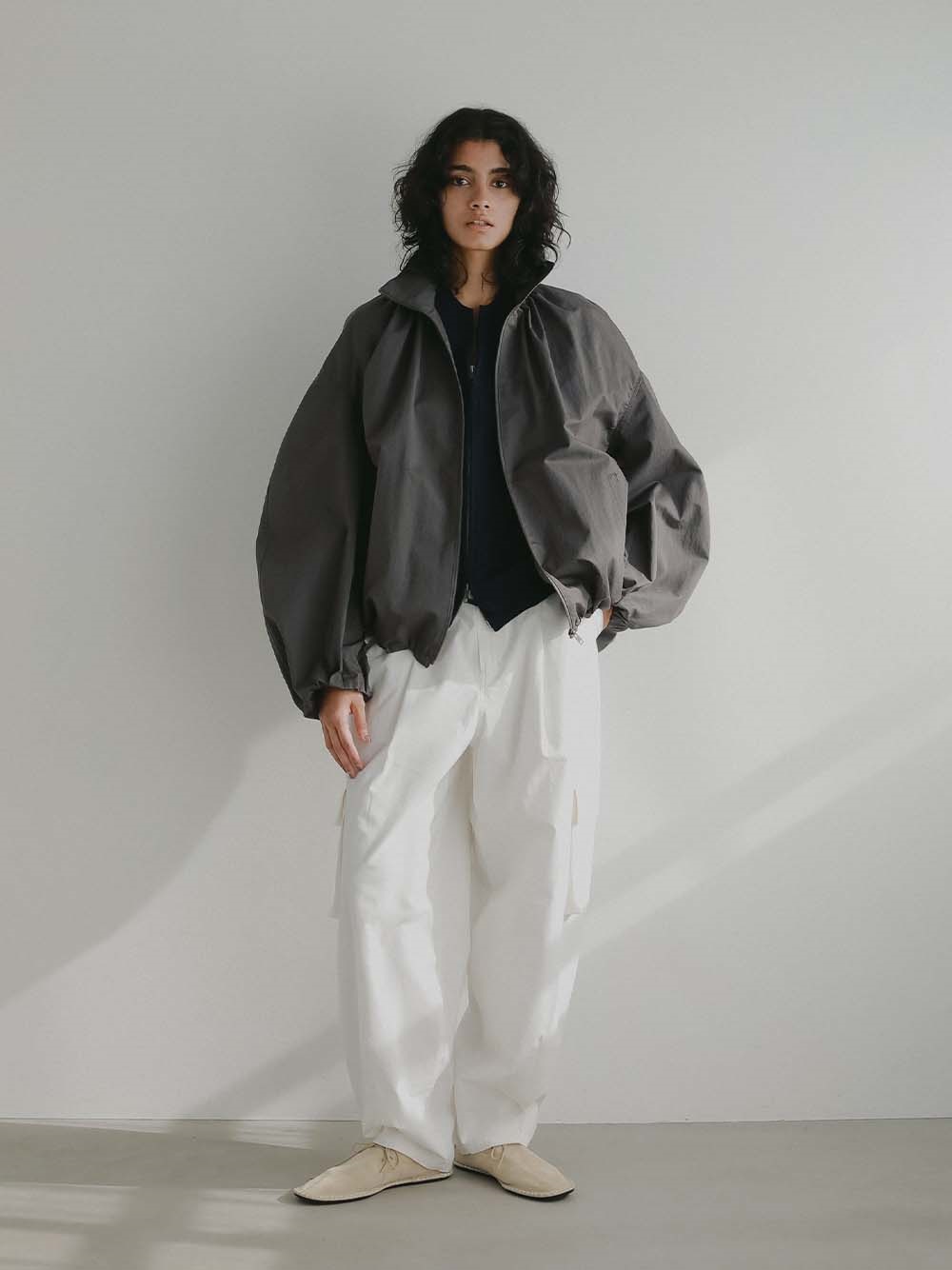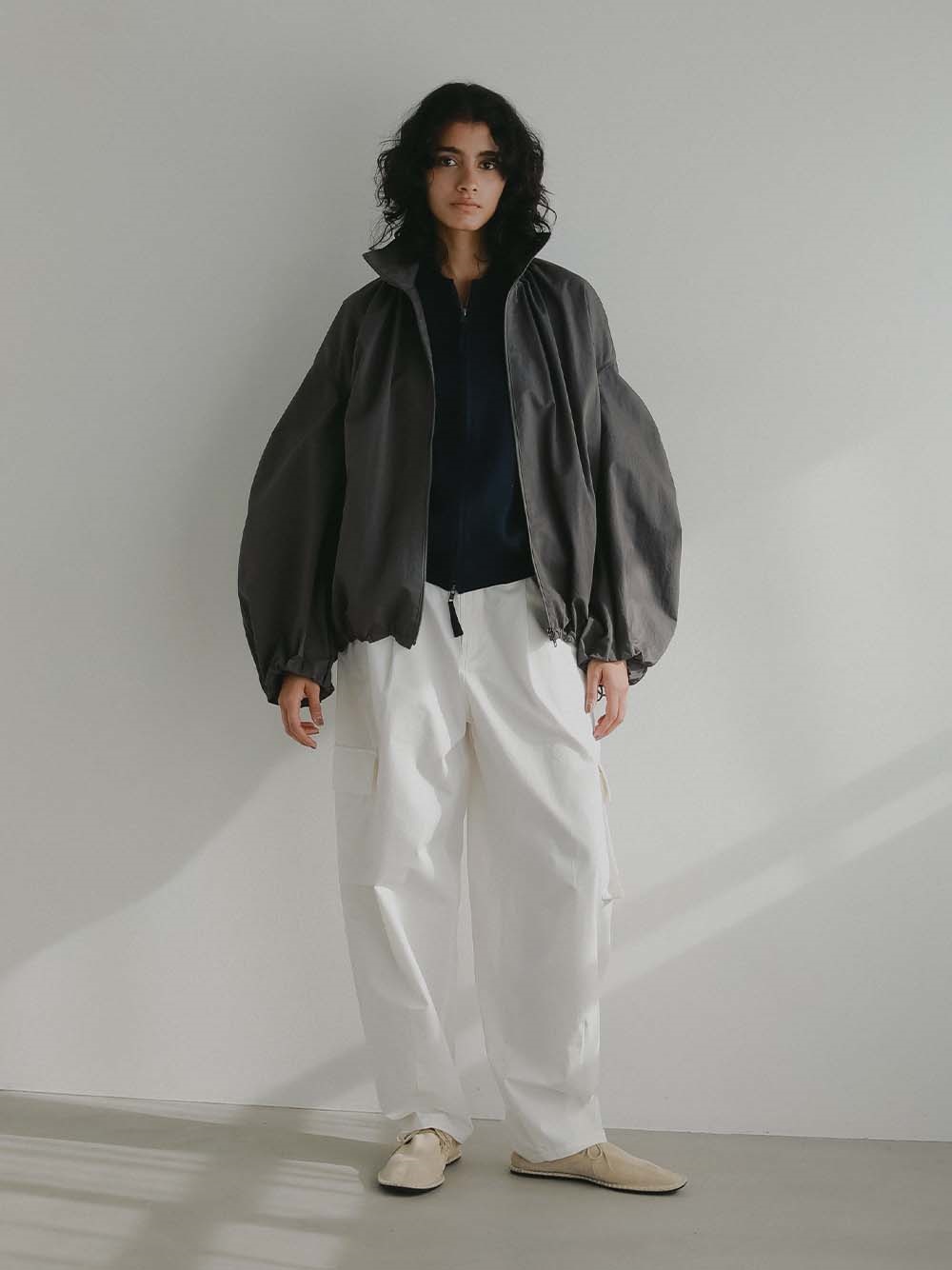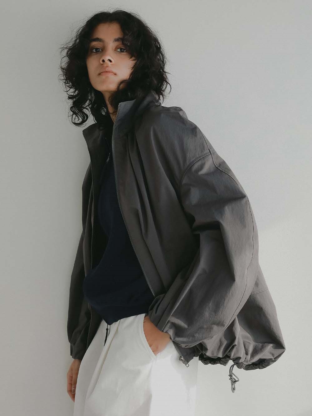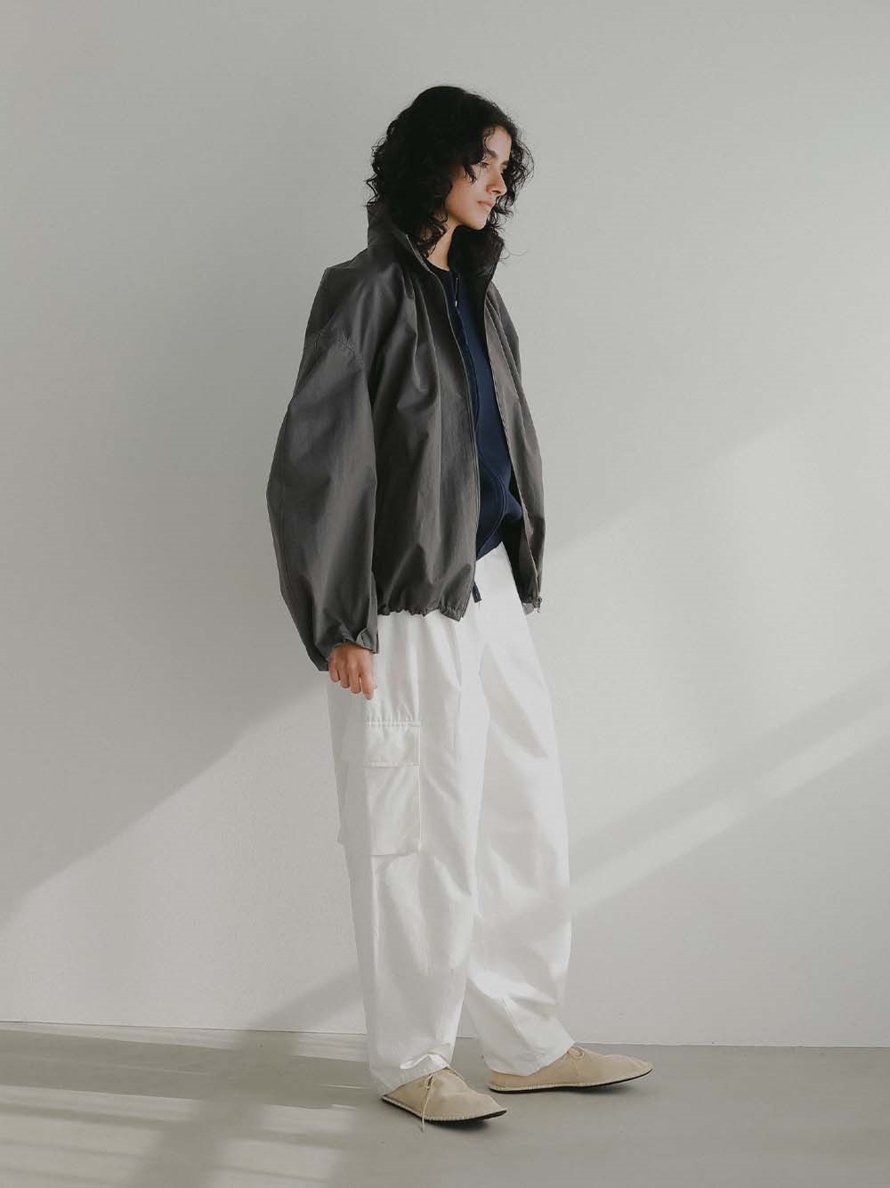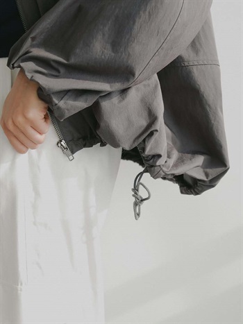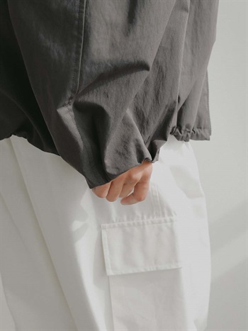 裾のゴムコードを絞ることでよりシルエットが際立つので絞って着用をおすすめします。