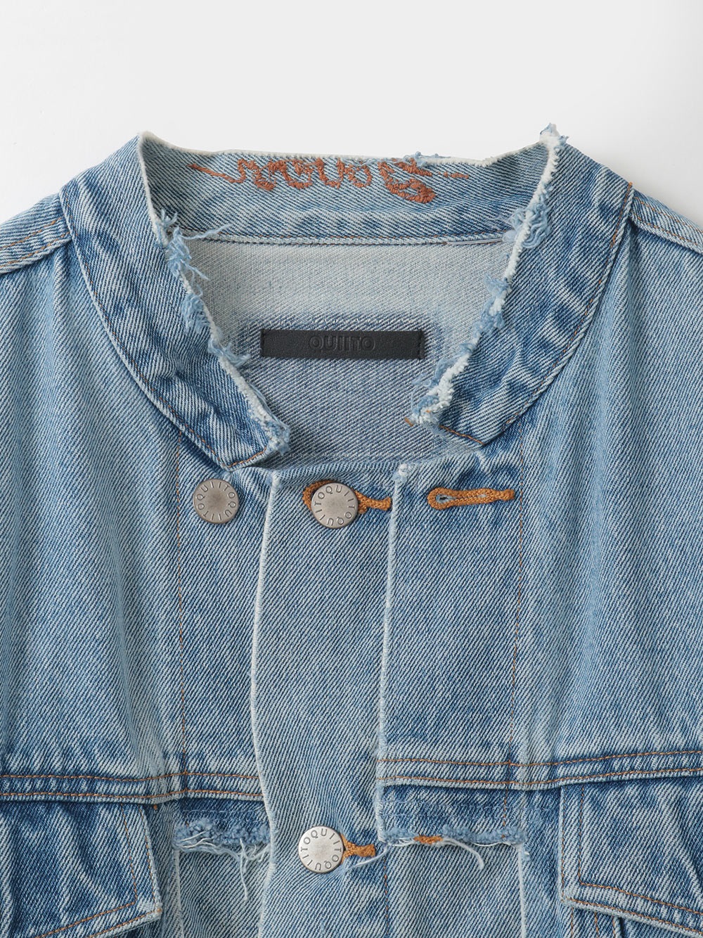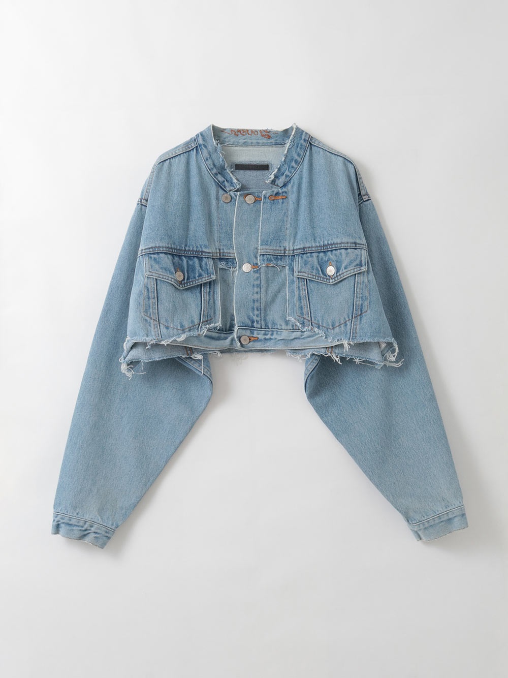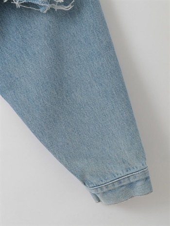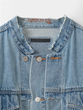 元々ややオーバーサイズのGジャンをベースにカットし、前立て部分にディテールを加えてリフォルムした、胸下丈の超ショートデニムジャケット。