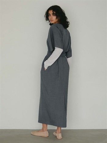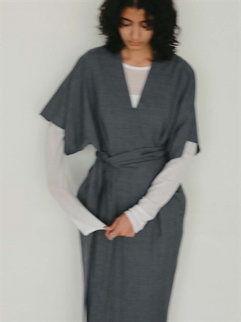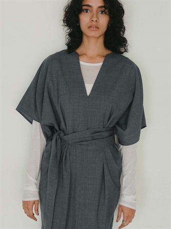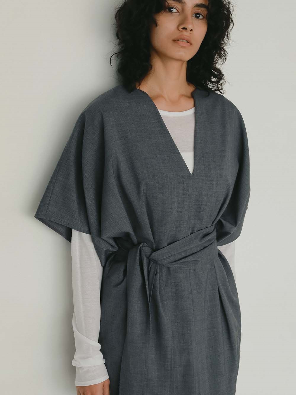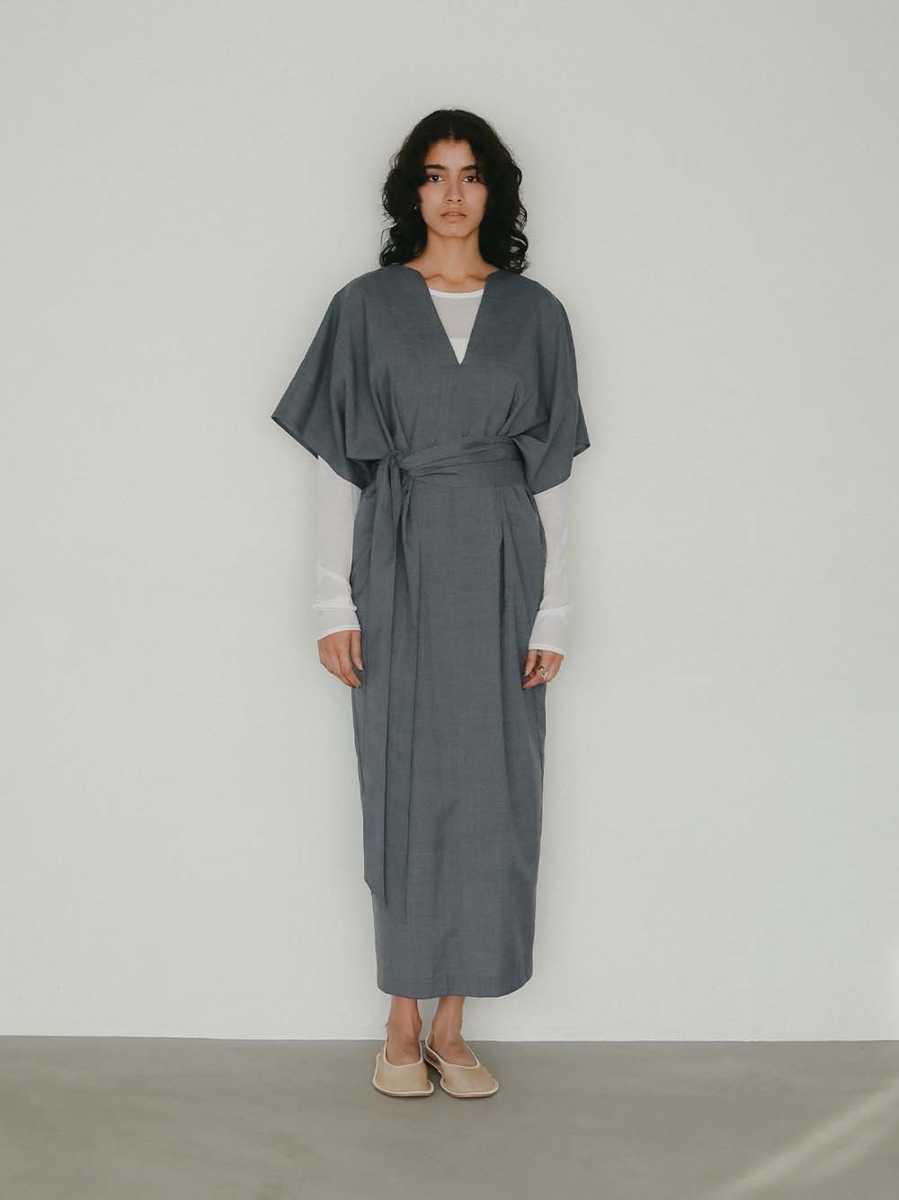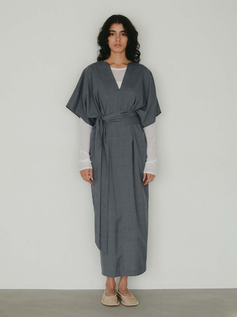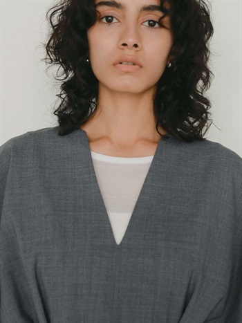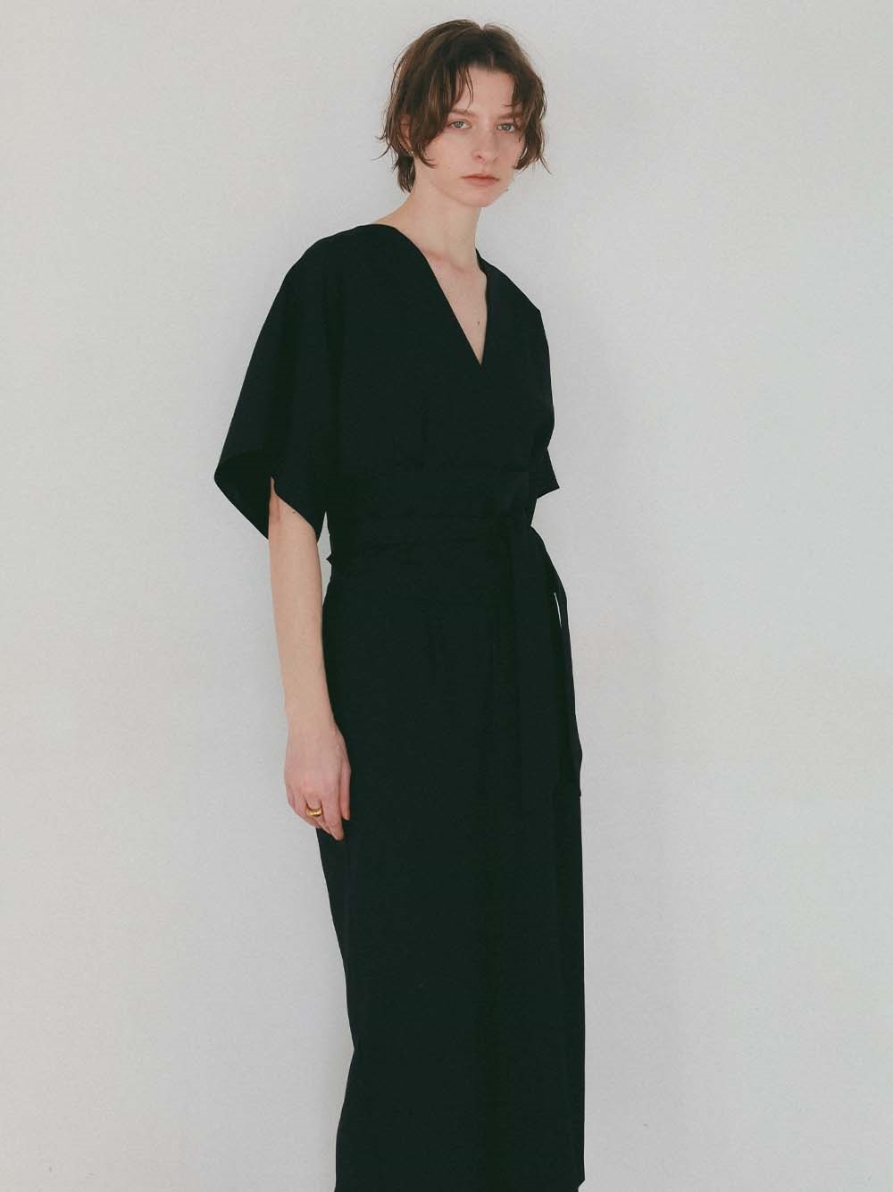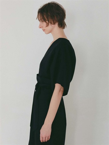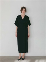 ウエストのタックと綺麗なVネックがスッキリ見せてくれる1枚。