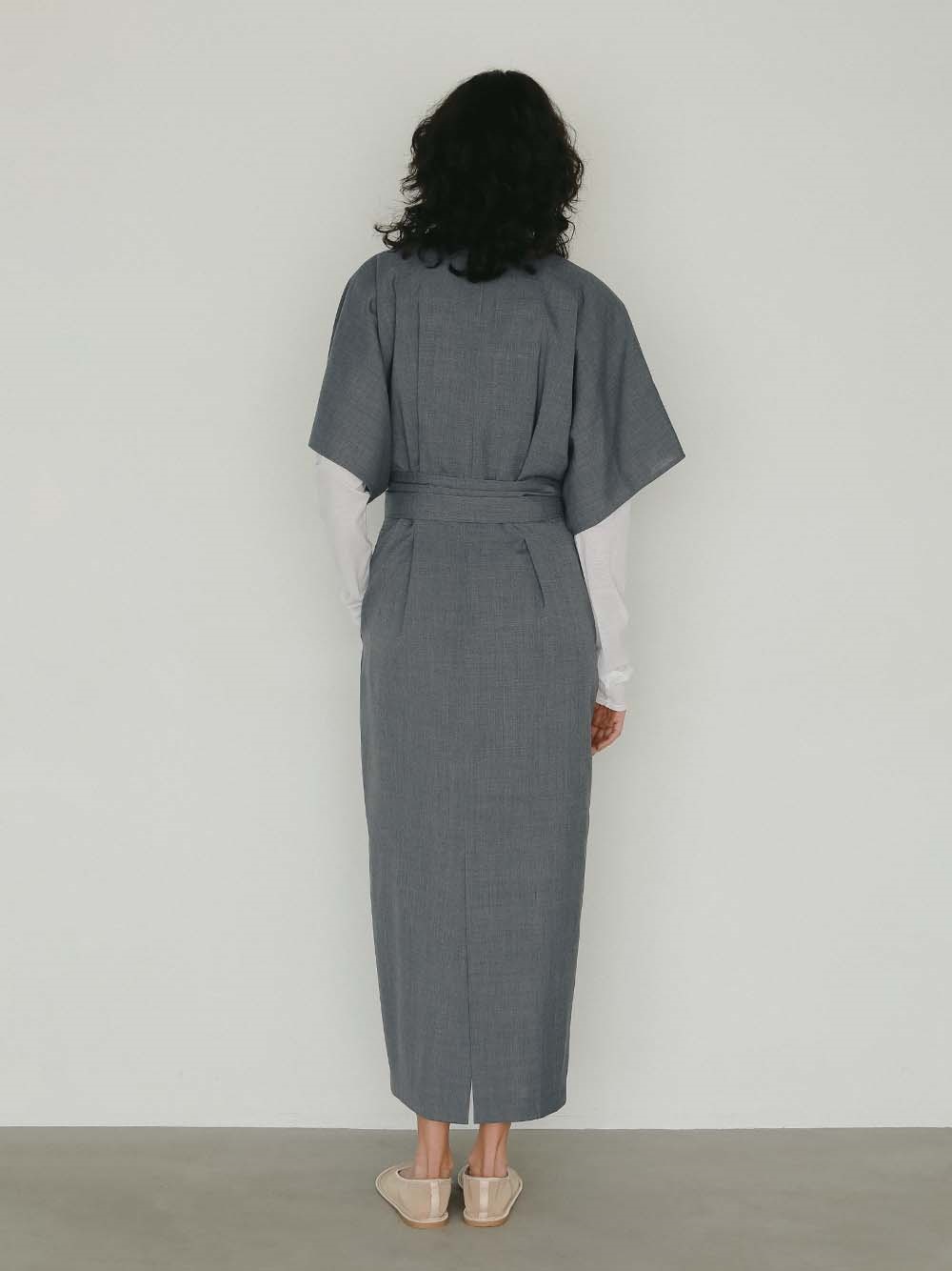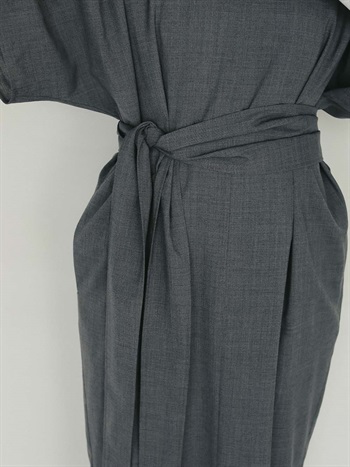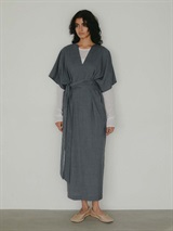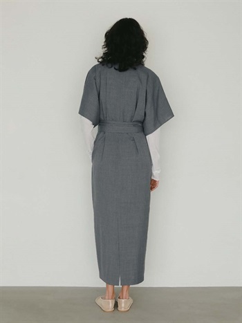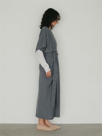 付属の共布ベルトは太さがイレギュラーなデザインでウエストマークした時にワンポイントになります。