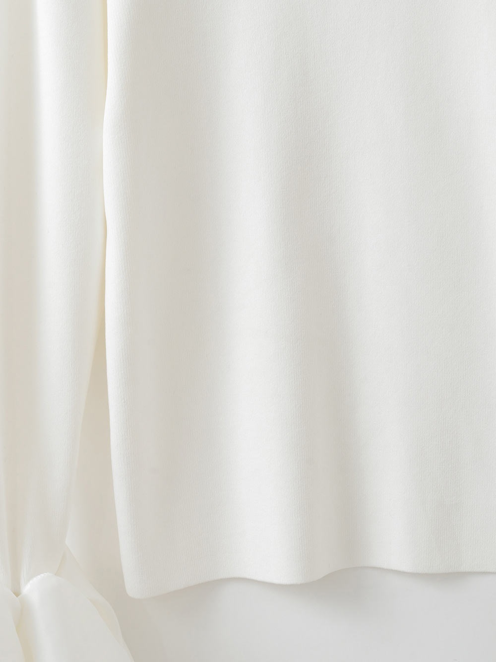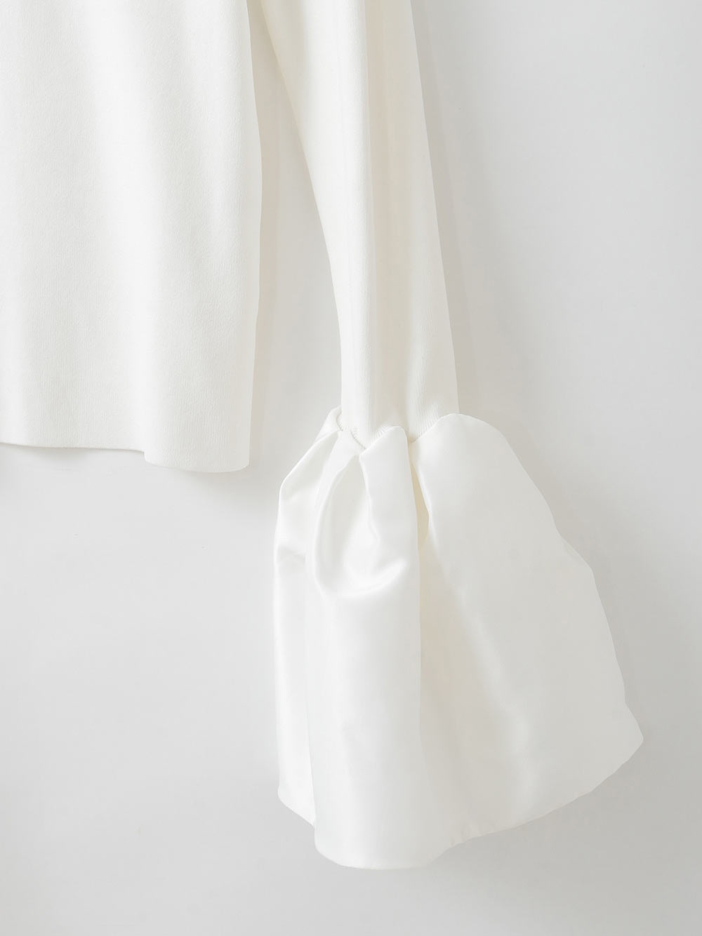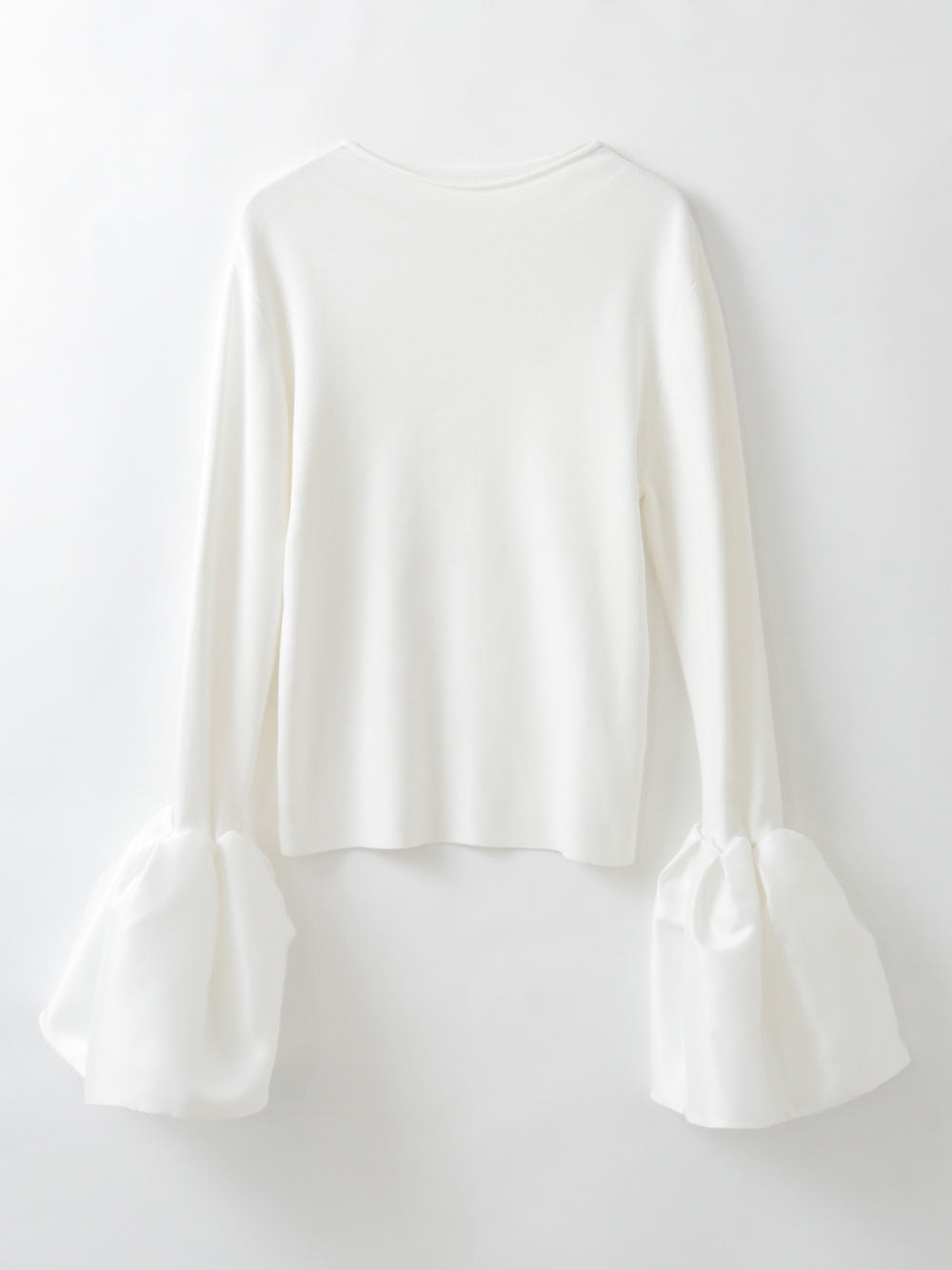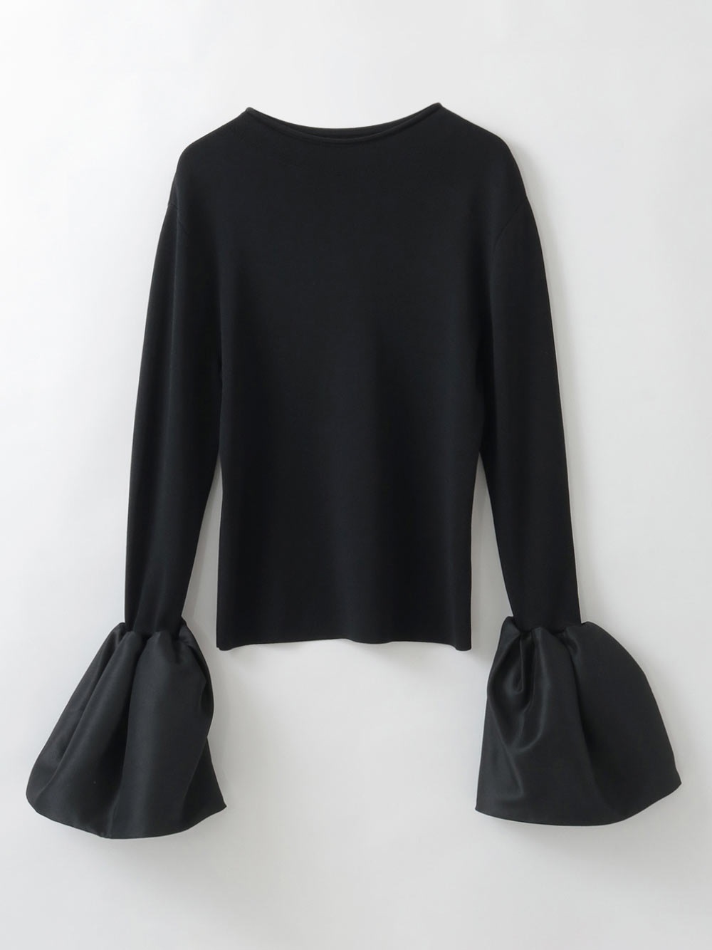 袖のボリューム切り替えが印象的なニットトップス。ハリ感のあるマットサテンにギャザーをいれて立体感を出した、シルエットにこだわった1枚です。身頃のニットは高密度に編みたてておりインナーのラインを拾いにくいよう仕上げております。ベーシックなパンツやデニムなどとあわせて華やかなスタイリングをお楽しみいただけるアイテムです。