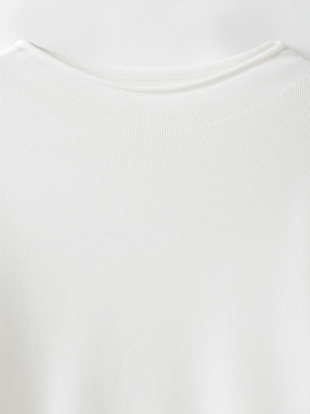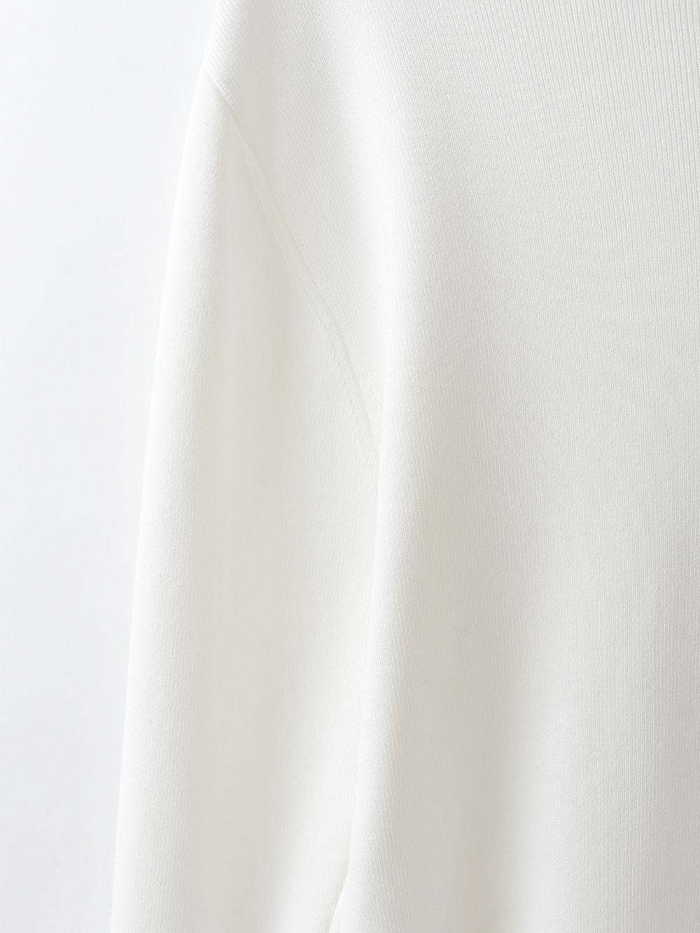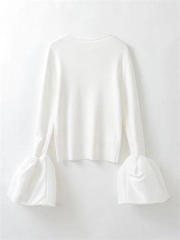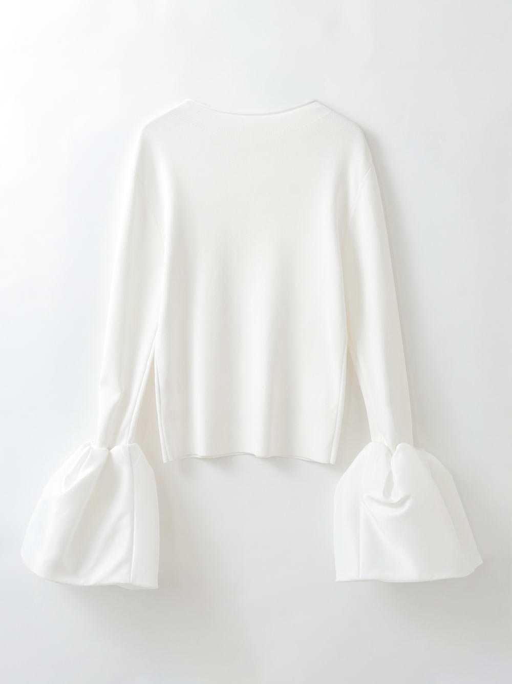 袖のボリューム切り替えが印象的なニットトップス。ハリ感のあるマットサテンにギャザーをいれて立体感を出した、シルエットにこだわった1枚です。身頃のニットは高密度に編みたてておりインナーのラインを拾いにくいよう仕上げております。ベーシックなパンツやデニムなどとあわせて華やかなスタイリングをお楽しみいただけるアイテムです。