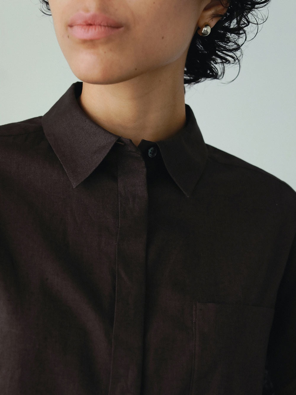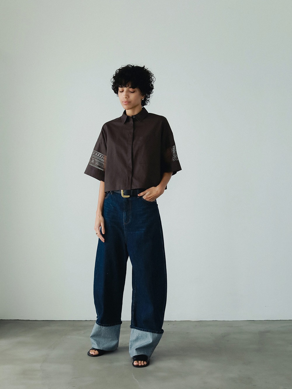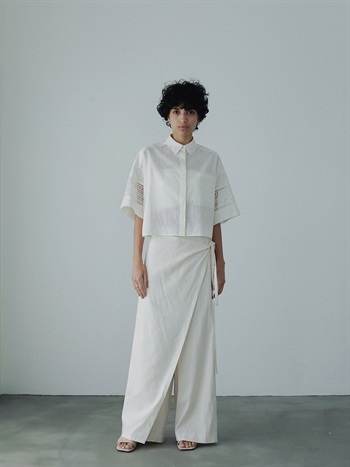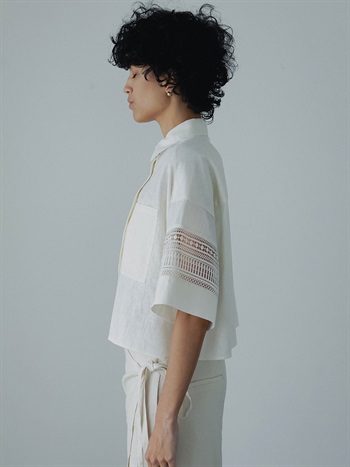 薄手のコットンリネンでショート丈のデザインシャツを作りました。ショート丈かつボディのワイドシルエットが今シーズンらしい1枚。袖の途中で太幅のレースが切り替えられていて涼やかで目を引くデザインです。レース使いのアイテムながら、迫力のある太めの袖やシャツディティールで甘くなりすぎずモードな雰囲気でお召しいただけます。
