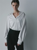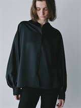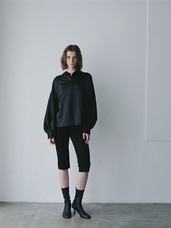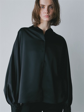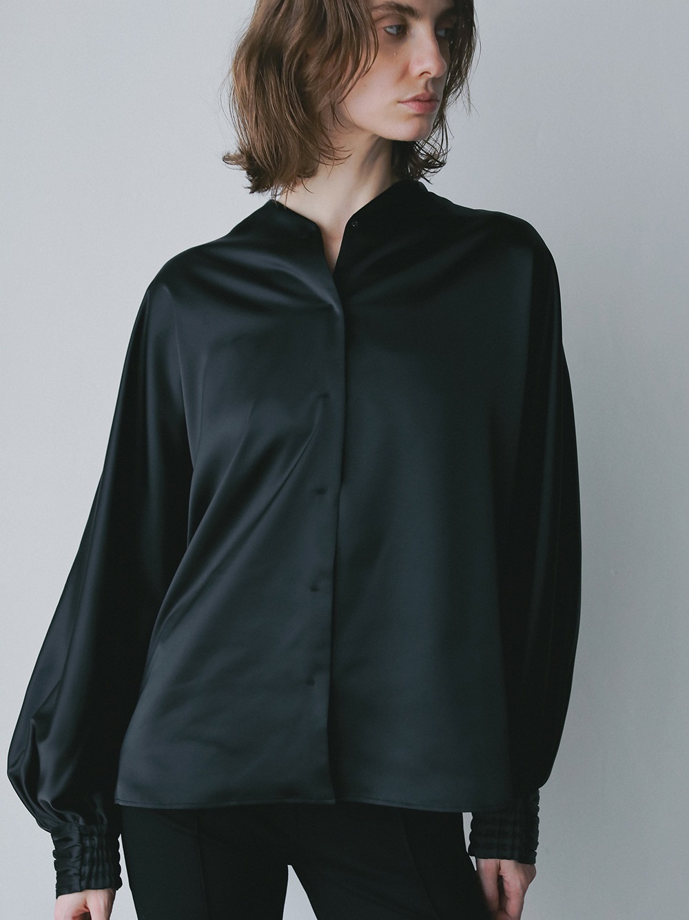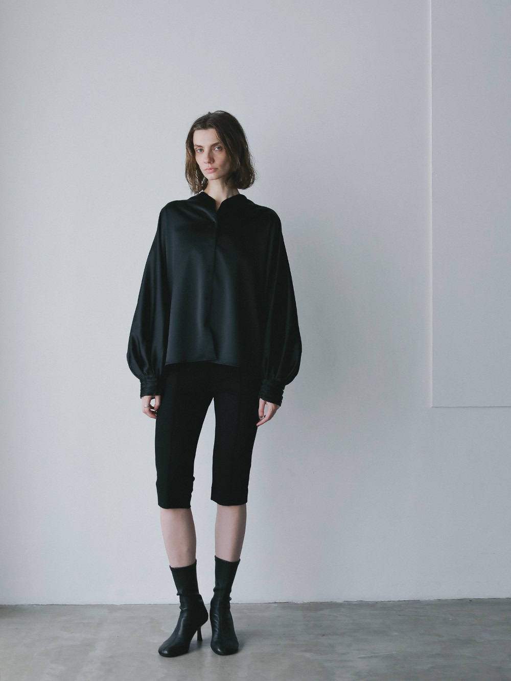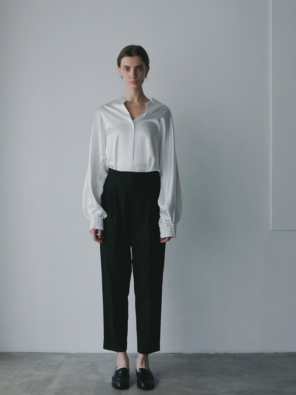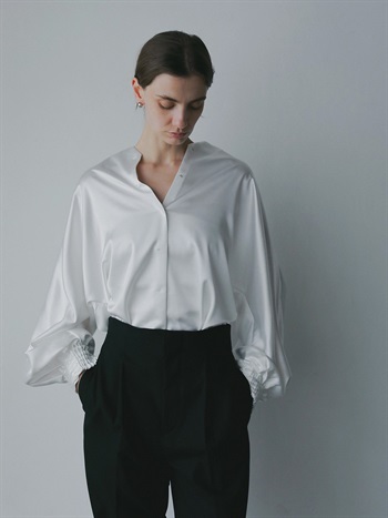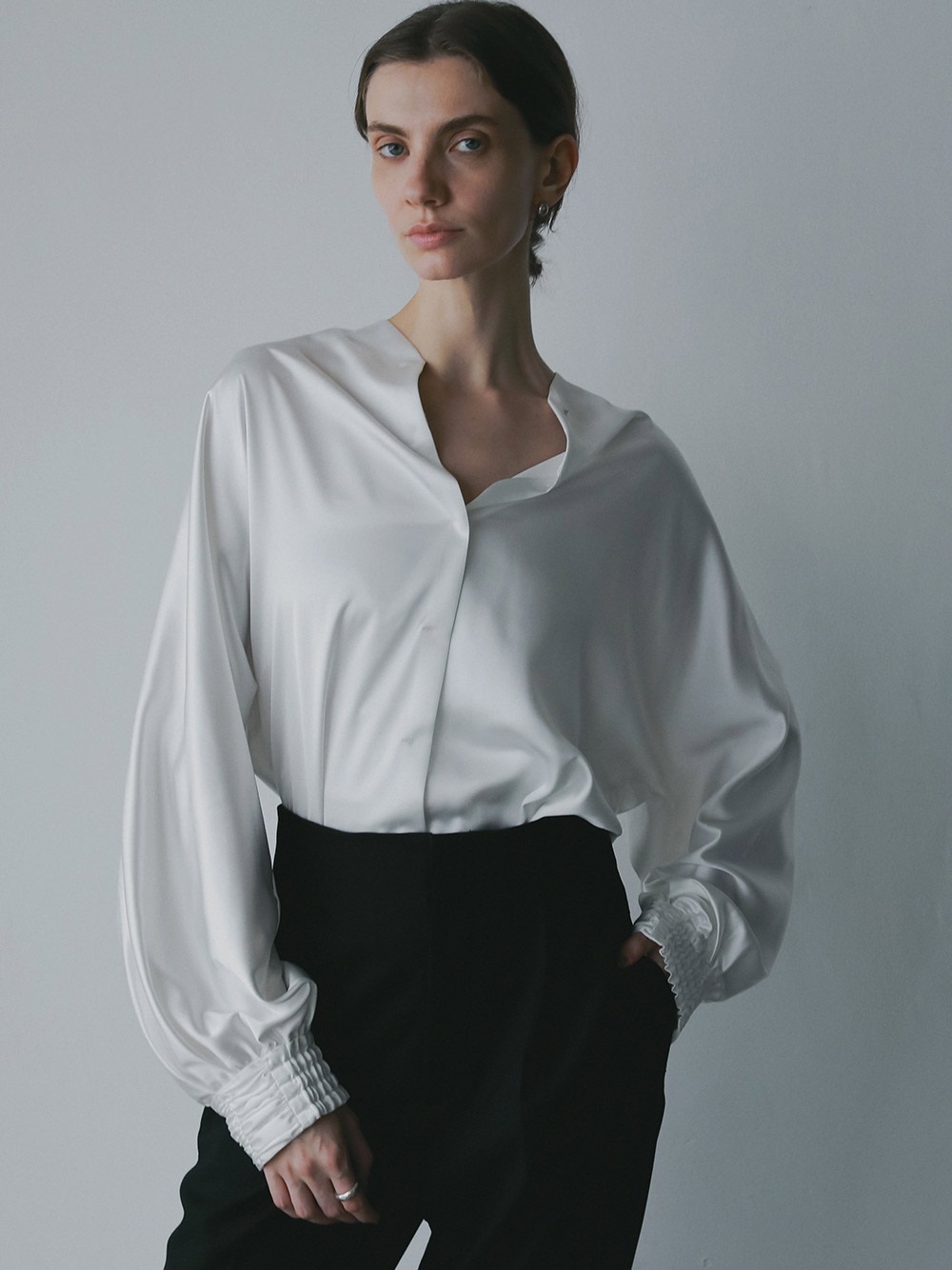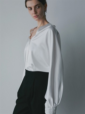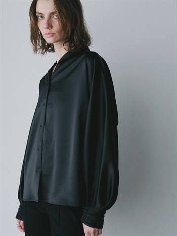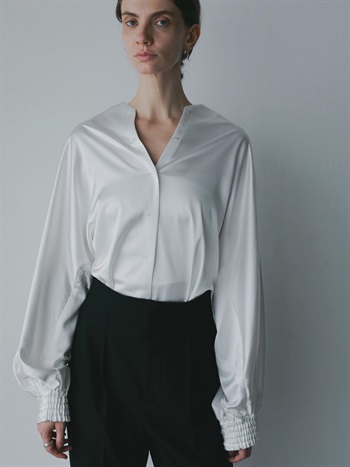 艶やかな中肉のサテンを使用したブラウス。適度に抜け感のあるVネックラインが鮮度のある1枚。適度なボリュームスリーブとすっきりとしたボディのデザインによりミニマルでこなれた印象でお召しいただけます。