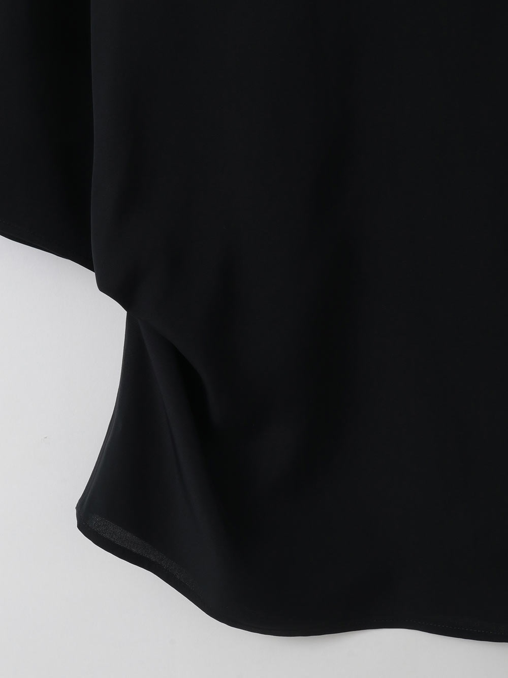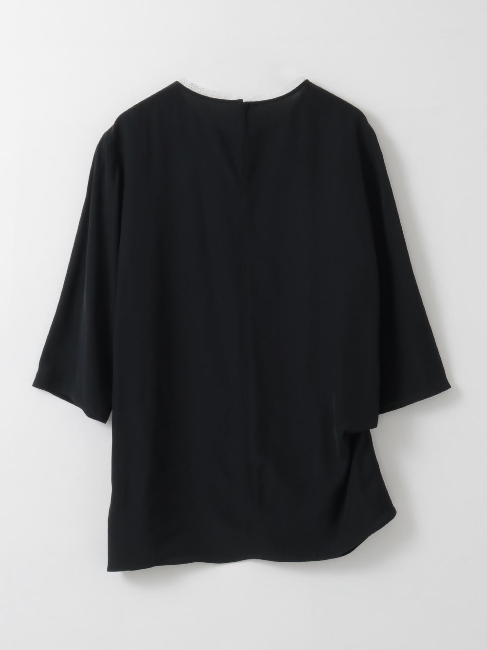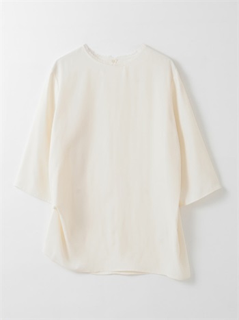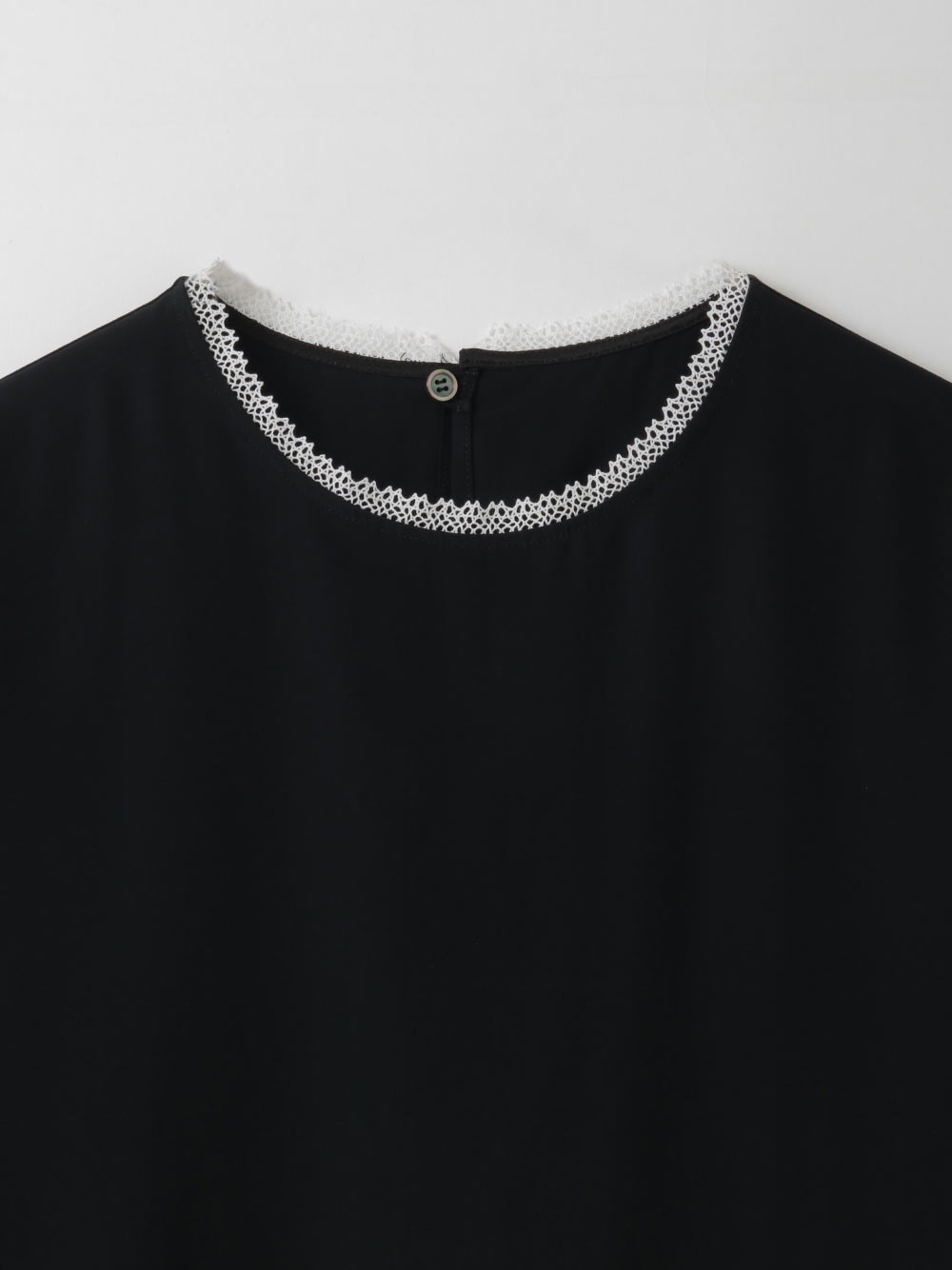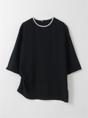 ヴィスコース100%の落ち感ととろみ感が特徴のレーストリミングブラウス。特殊な加工でドライタッチで軽量感のある1枚。ヴィスコース特有の落ち感が大人なブラウスとしてオケージョンシーンでも活躍してくれます。少しタイトにまとめた裾が腰にのりサイドのタックでニュアンスを足してくれます。オフカラーもブラックもどちらも万能に使えます。