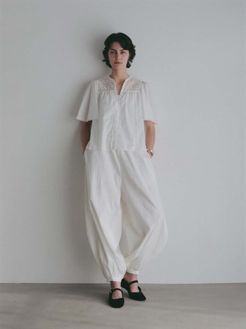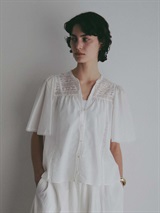 繊細なコットンのレーステープを何種類も組み合わせて胸元にあしらったデザインレースブラウス。