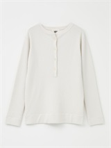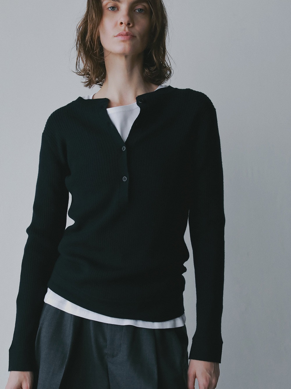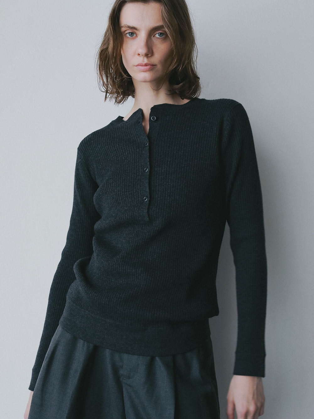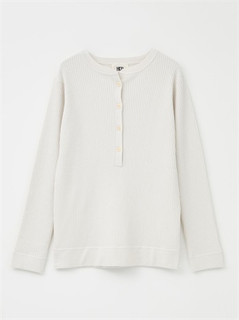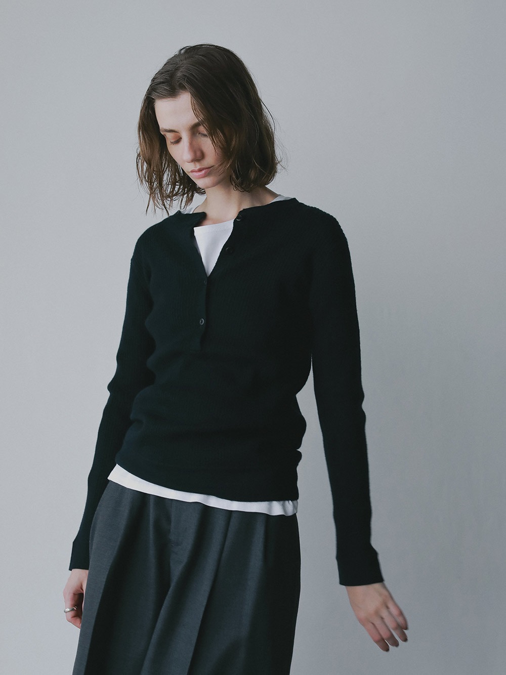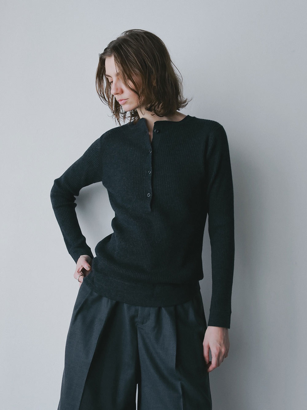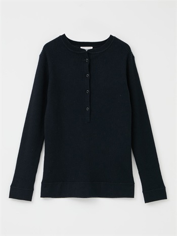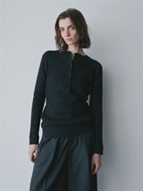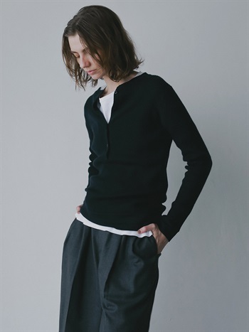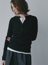 メリノウールのヘンリーネックニット。ウール100%のハイゲージ素材はなめらかな肌触りと上品な風合いが魅力的。細めのリブが着ぶくれせずスッキリ着ることができ温かさも兼ね備えています。カジュアルなデザインながら素材の上品さで綺麗めにも着用いただけます。ヘンリーネックのブラウスやカットソーと重ね着したトレンドのコーディネートもおすすめ。