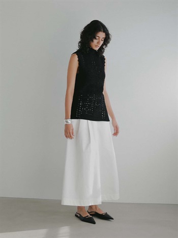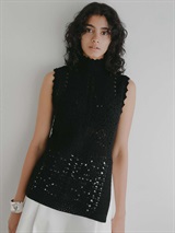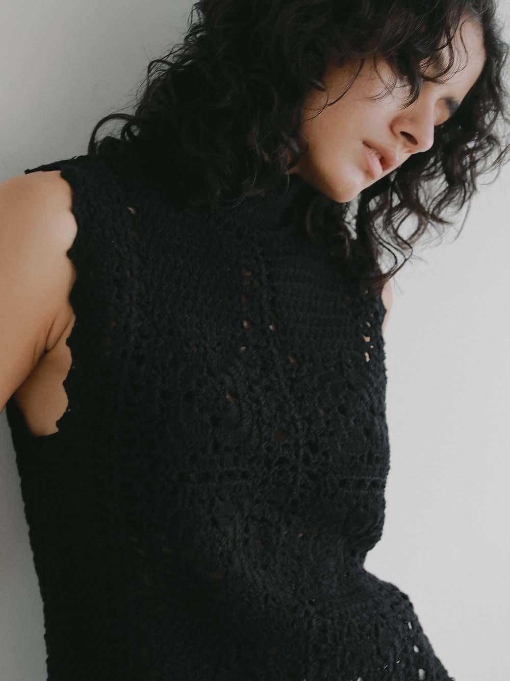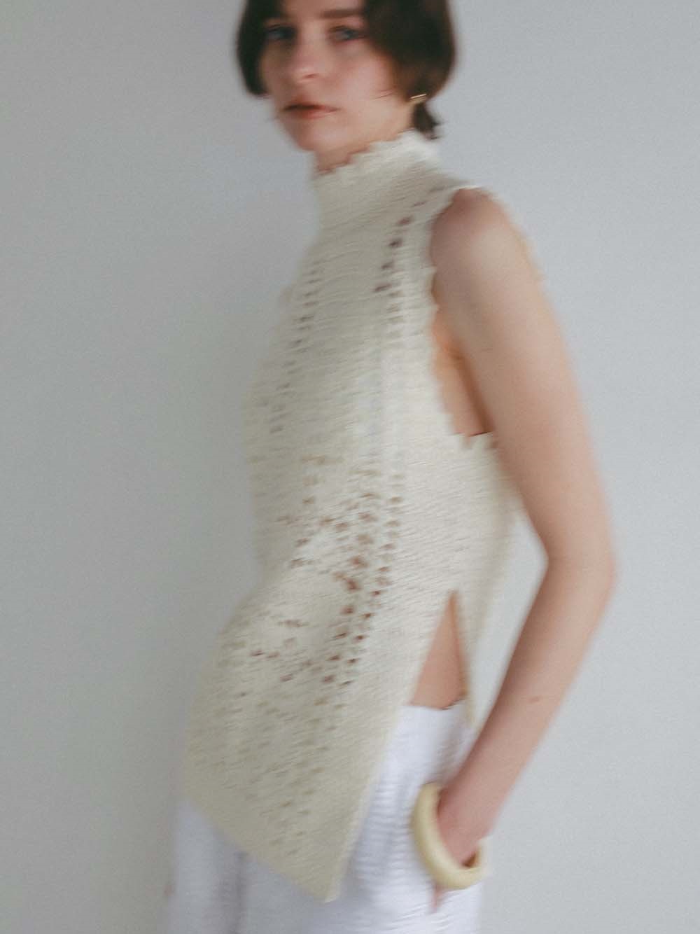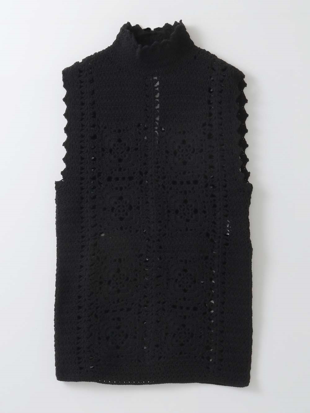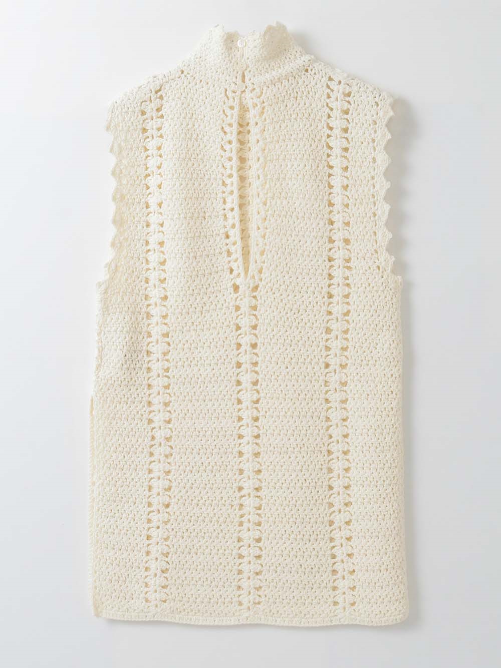 繊細なクロッシェ編みが特徴のニットブラウス。