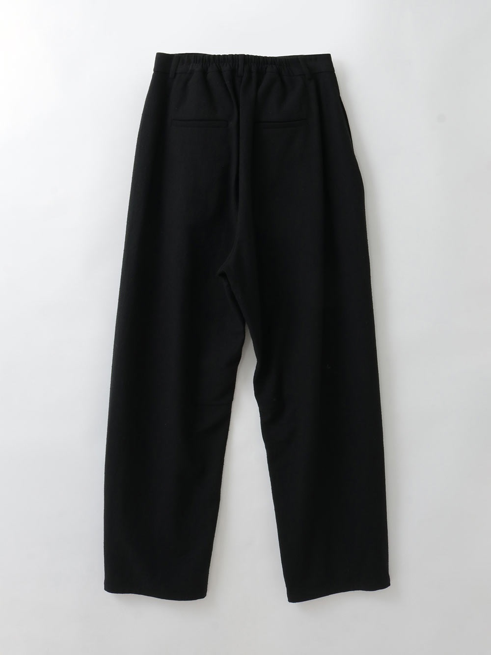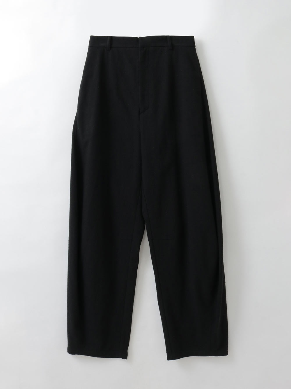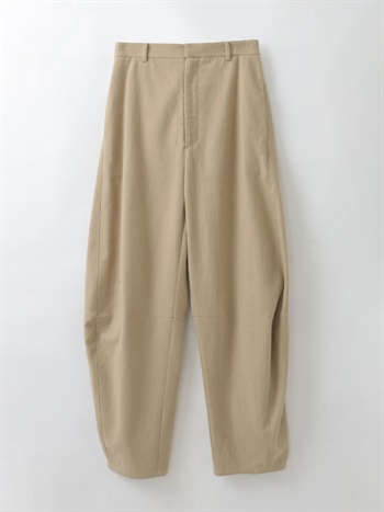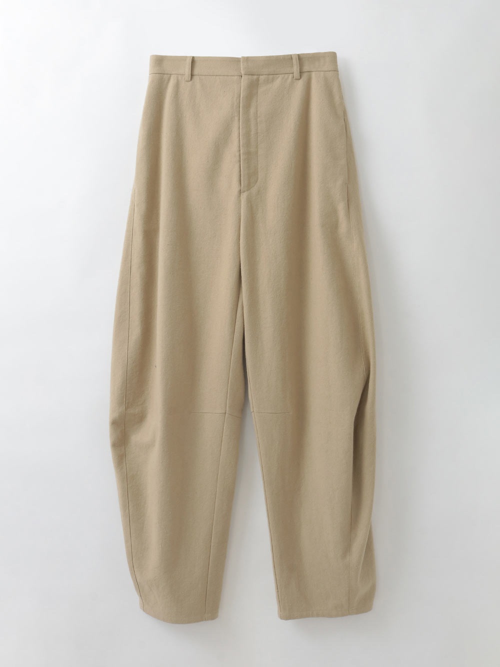 膨らみをもたせた立体感のある形から裾すぼまりなキレイめのカーブデザインで仕上げました。ゆとりがあり動きやすく、ウエストは後ろゴム仕様でストレスフリーな履き心地です。シルクネップの糸を使用することで生まれる柔らかな風合いが特徴のシルクコットン素材を使用しております。ナチュラルな素材感がニットやシャツ素材とも好相性で、カジュアルすぎず幅広くスタイリングを楽しんでいただける1着です