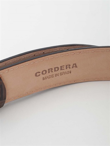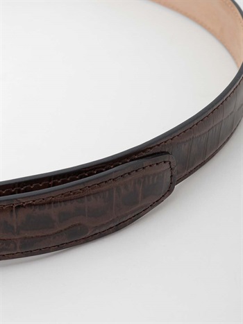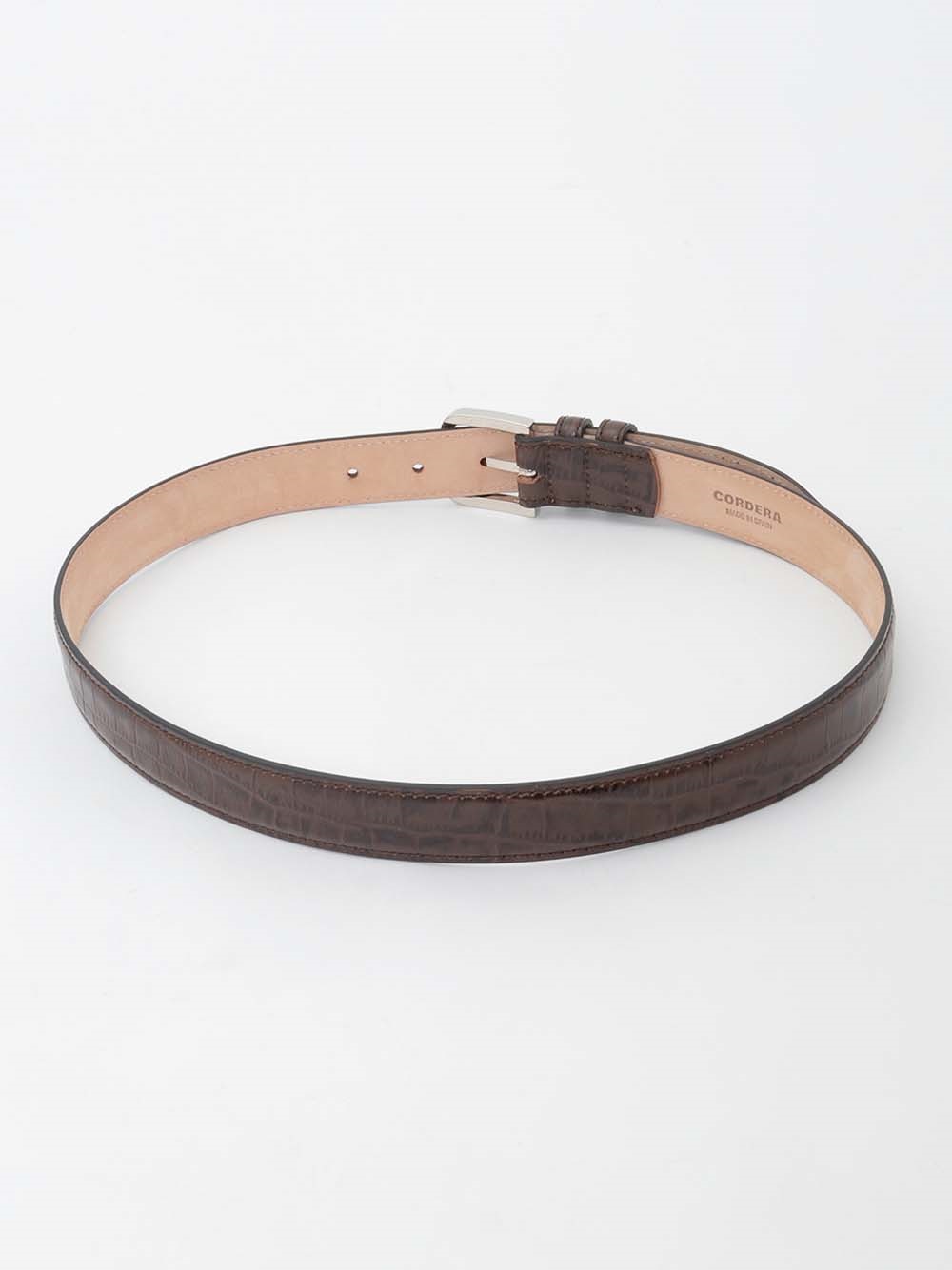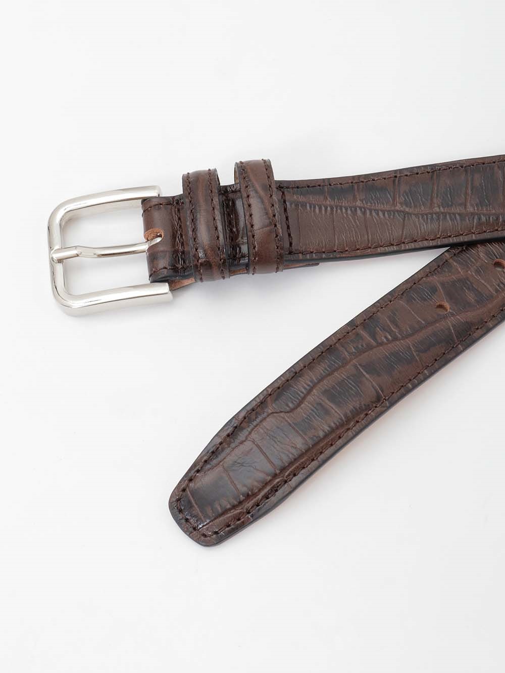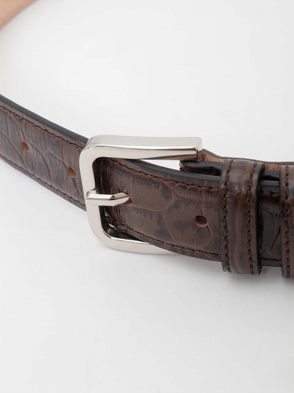 クロコダイルの型押しレザーにシルバーバックルを添えたクラシックベルト。