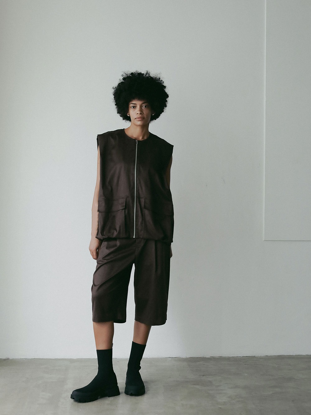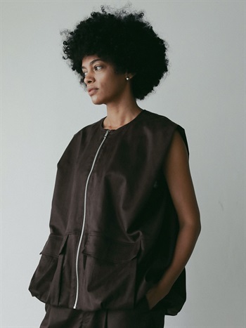 裾のバルーンシルエットと大きなポケットにより1枚で様になるデザインに仕上げました。フロントジップをあけてベストのように羽織ってもお召しいただけます。同素材のカーブハーフパンツ(商品ID:7053800)と合わせてコーディネートもおすすめです。