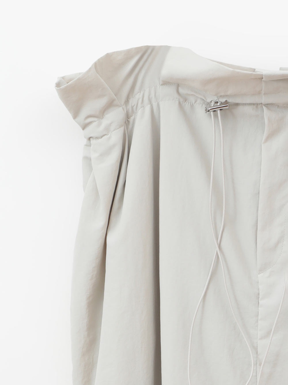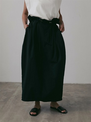 ウエストのドロストデザインがポイントの、柔らかなナイロン素材のスカート。ウエストのギャザー&タックで程よいボリューム感を出し、程よいコクーンシルエットでトレンド感を演出しています。ウエストはゴム仕様でノンストレスな着心地でありつつ、ドロストでウエストマークの調整もしていただけます。