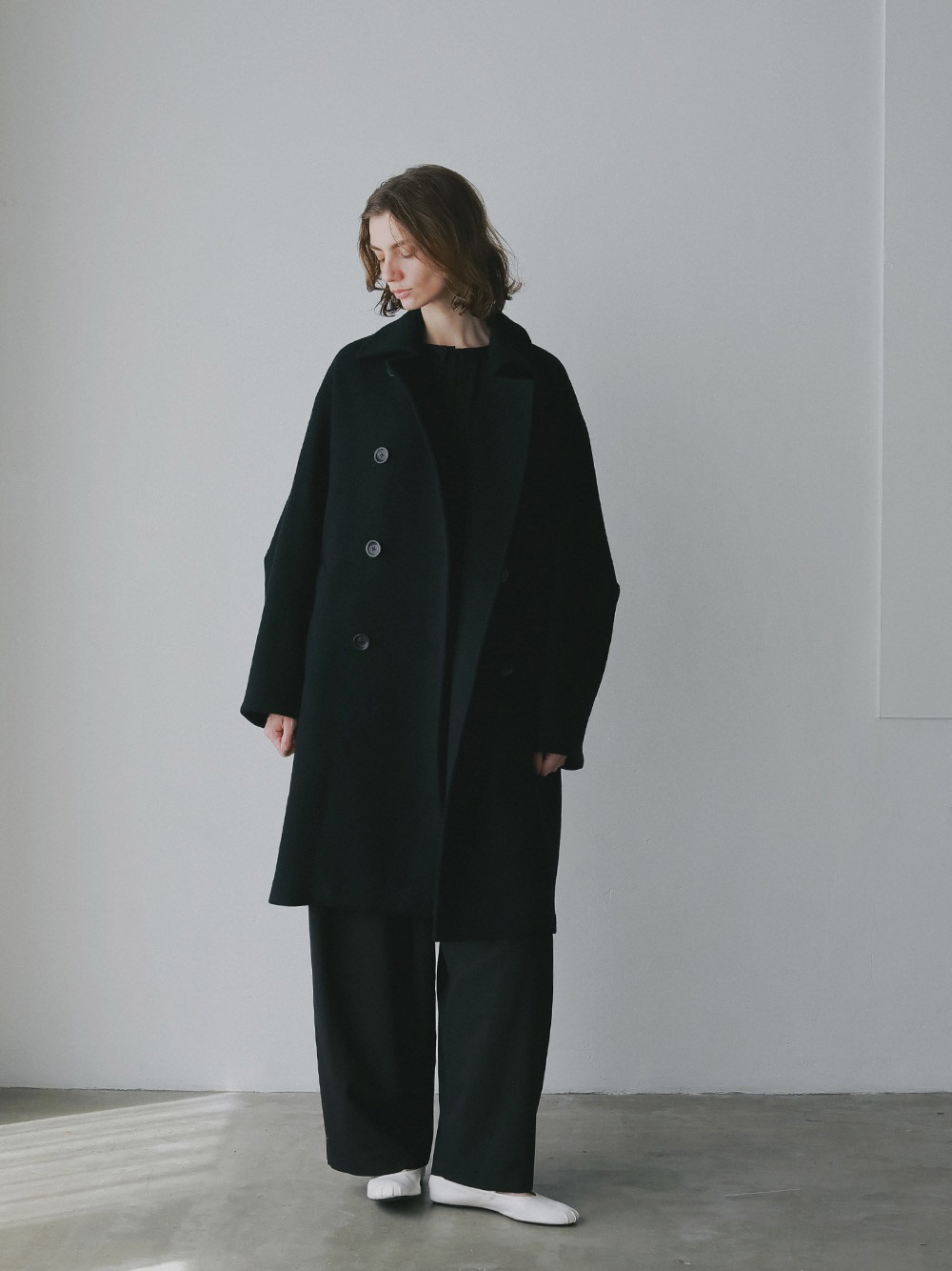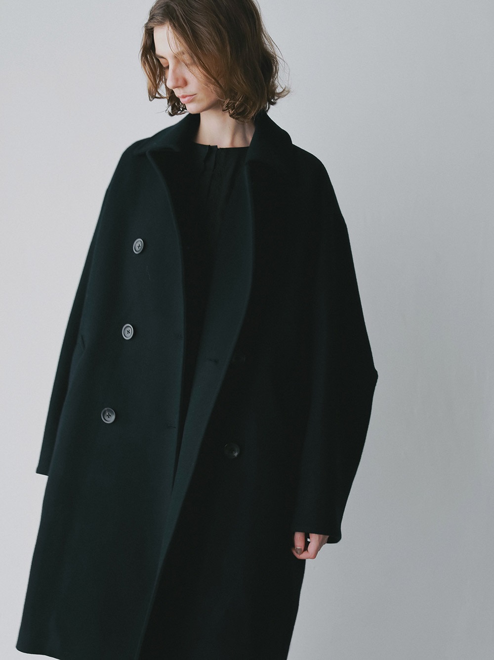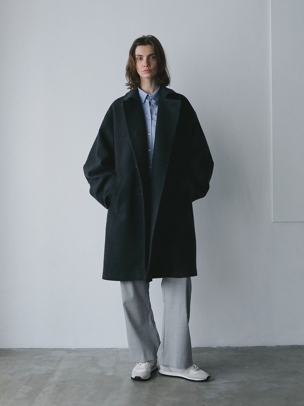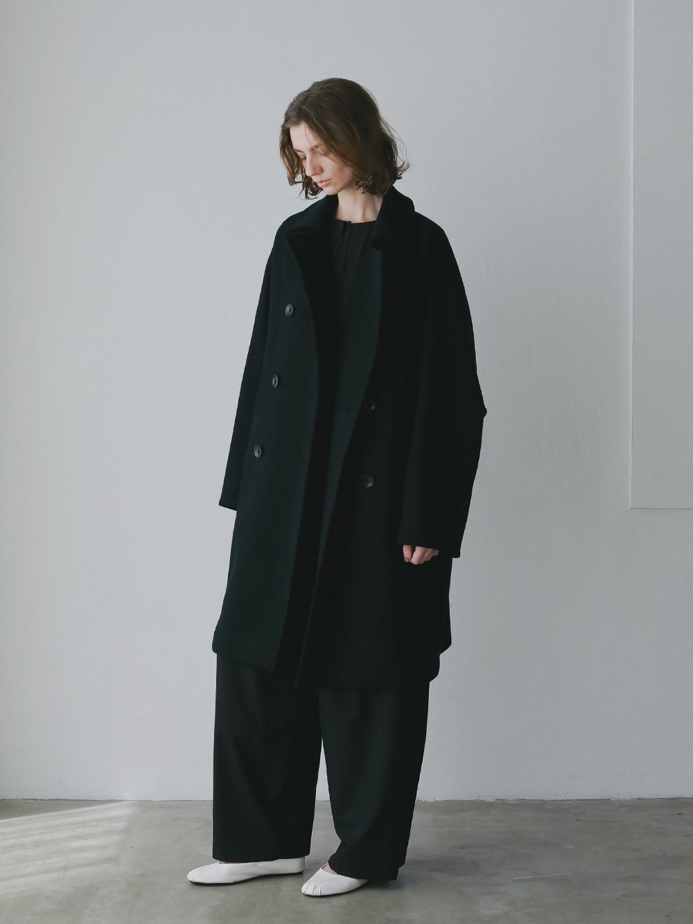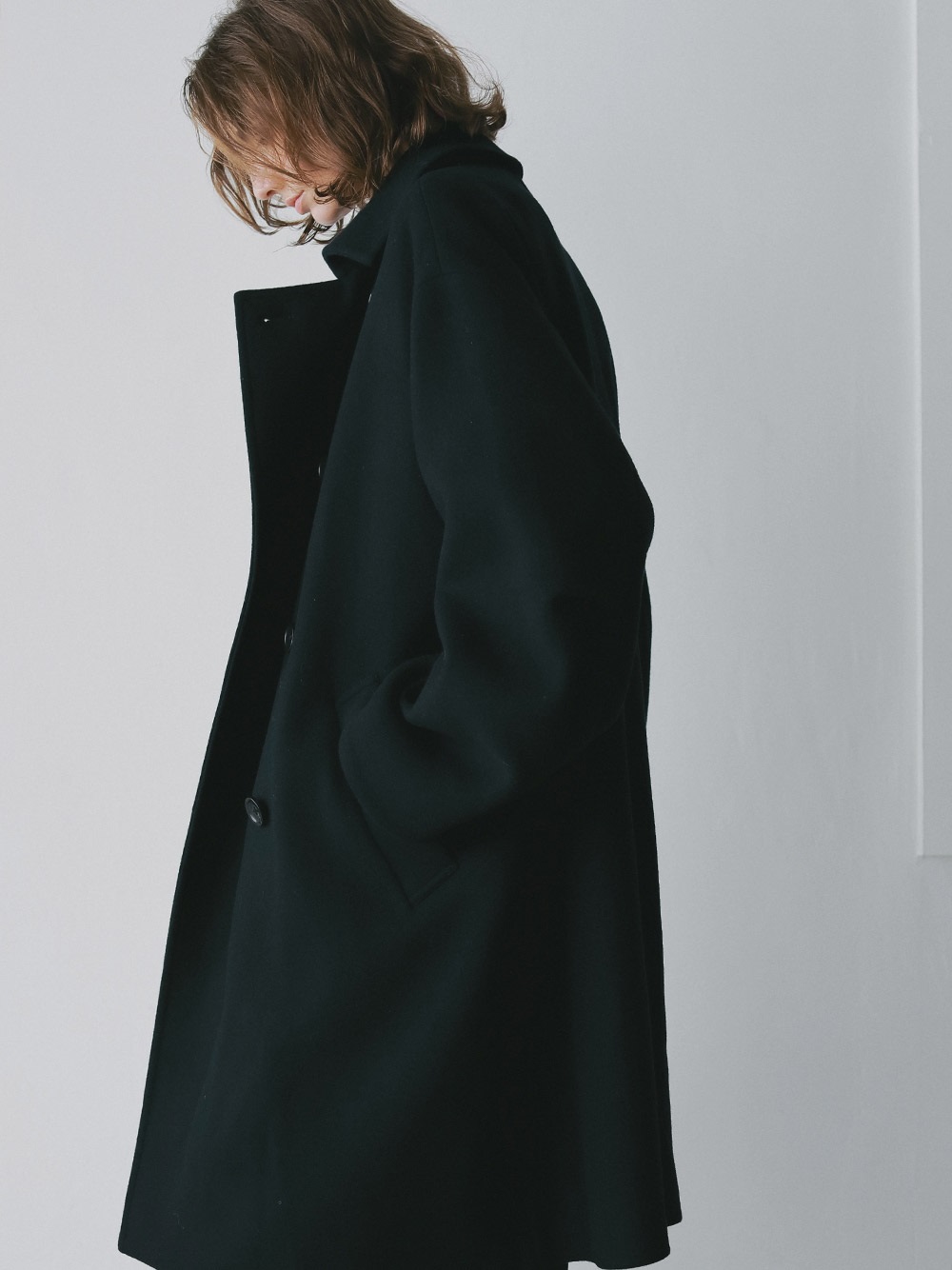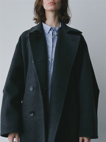 細番手の糸を使用したダブル前のオーバーコート。細番手の糸を高密度に織ることで適度な張り感としなやかさがある素材でON/OFF問わずコーディネートしやすい一枚。メンズライクなオーバーサイズ感が特徴ですが、細かなサイズ感にこだわっており、飽きのこないデザインです。