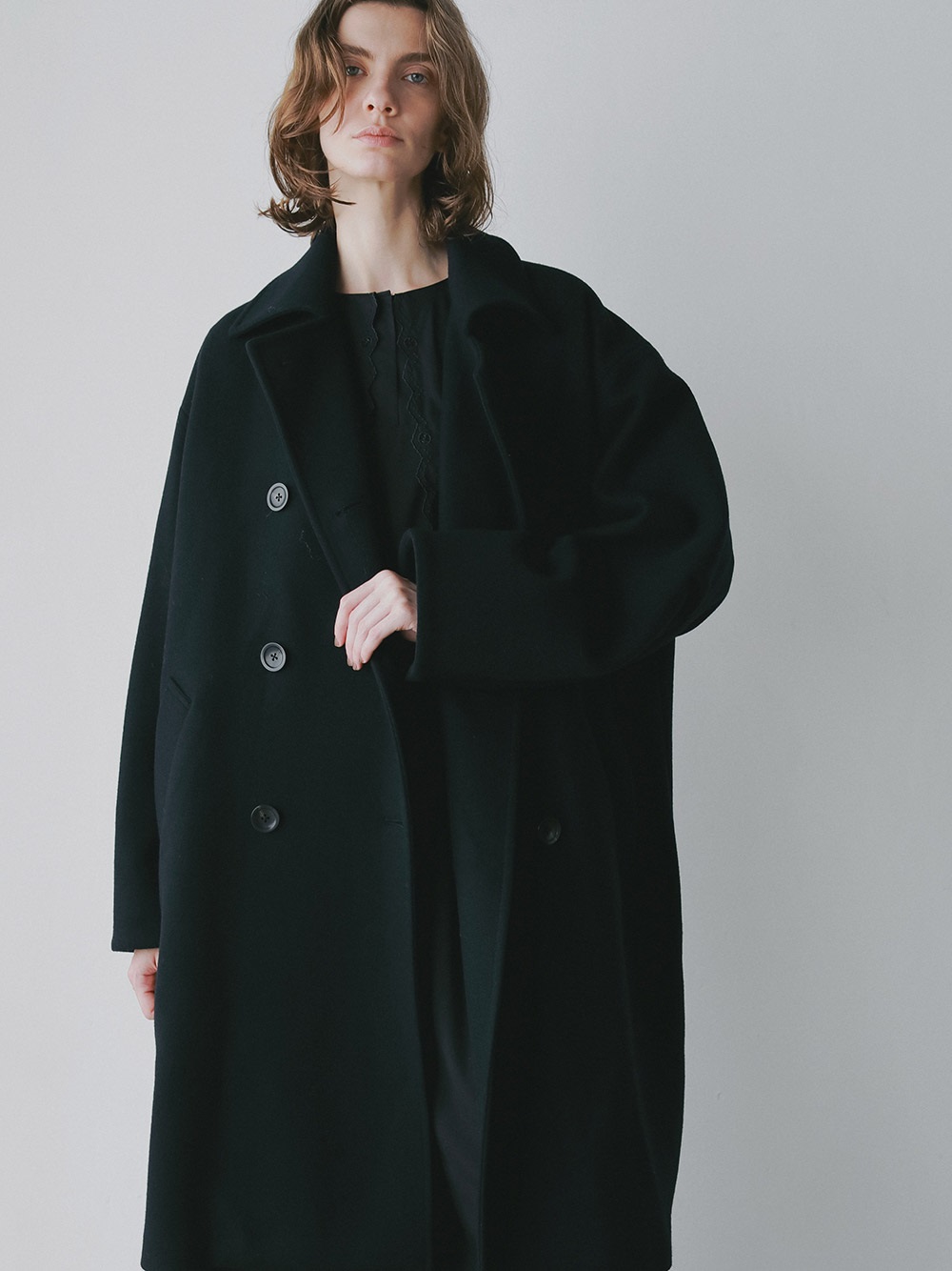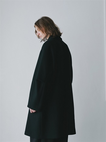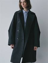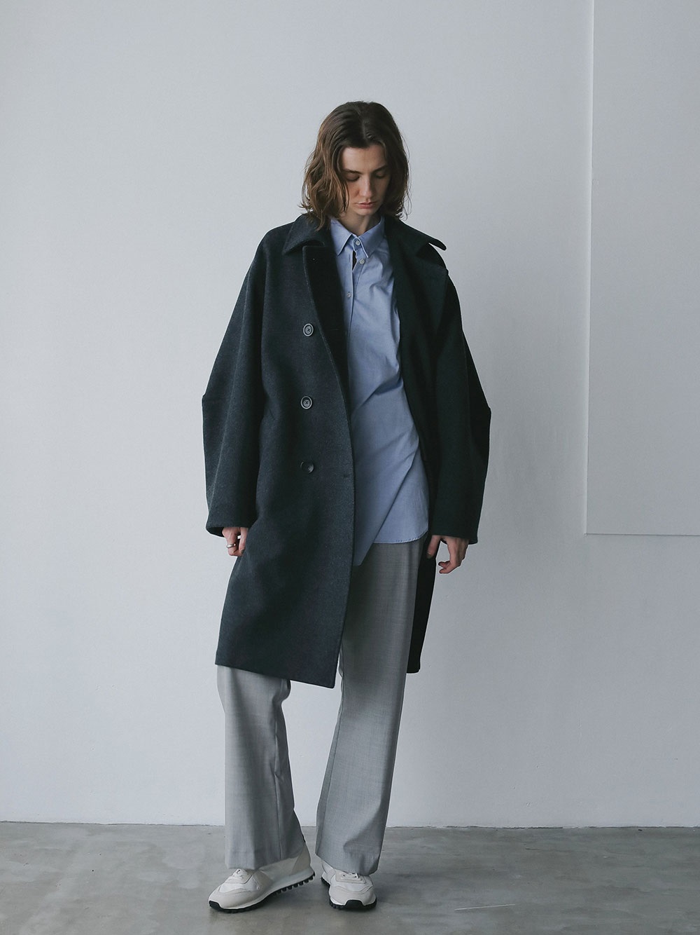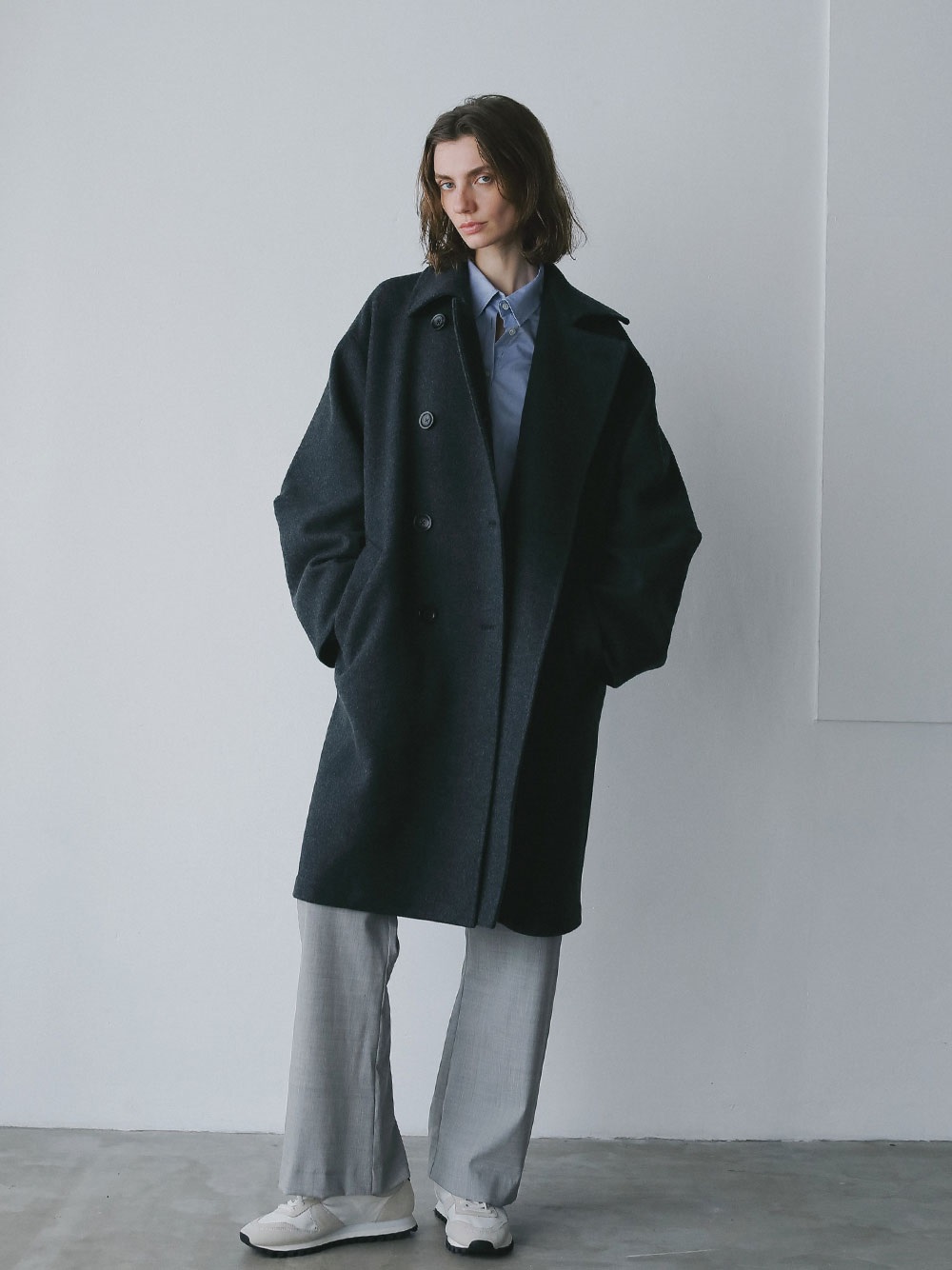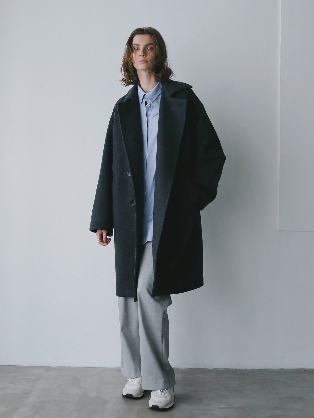 細番手の糸を使用したダブル前のオーバーコート。細番手の糸を高密度に織ることで適度な張り感としなやかさがある素材でON/OFF問わずコーディネートしやすい一枚。メンズライクなオーバーサイズ感が特徴ですが、細かなサイズ感にこだわっており、飽きのこないデザインです。
