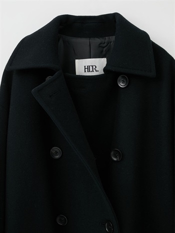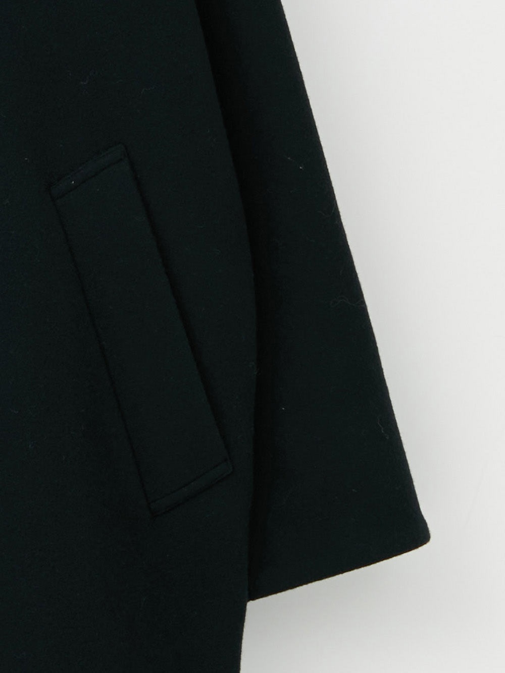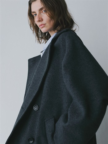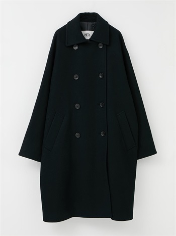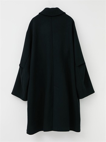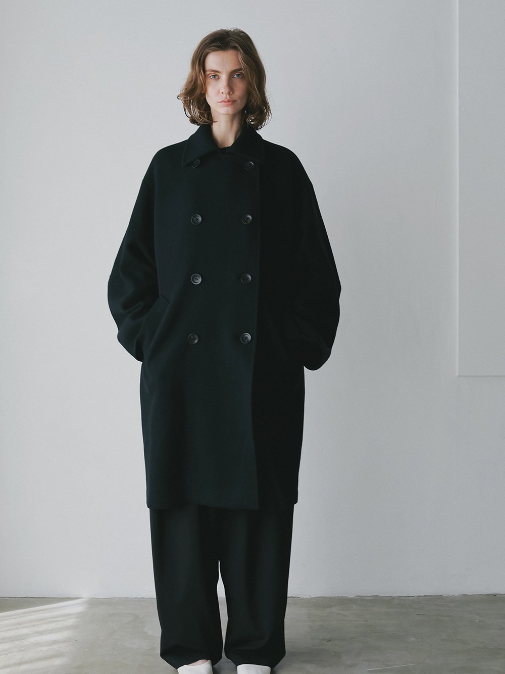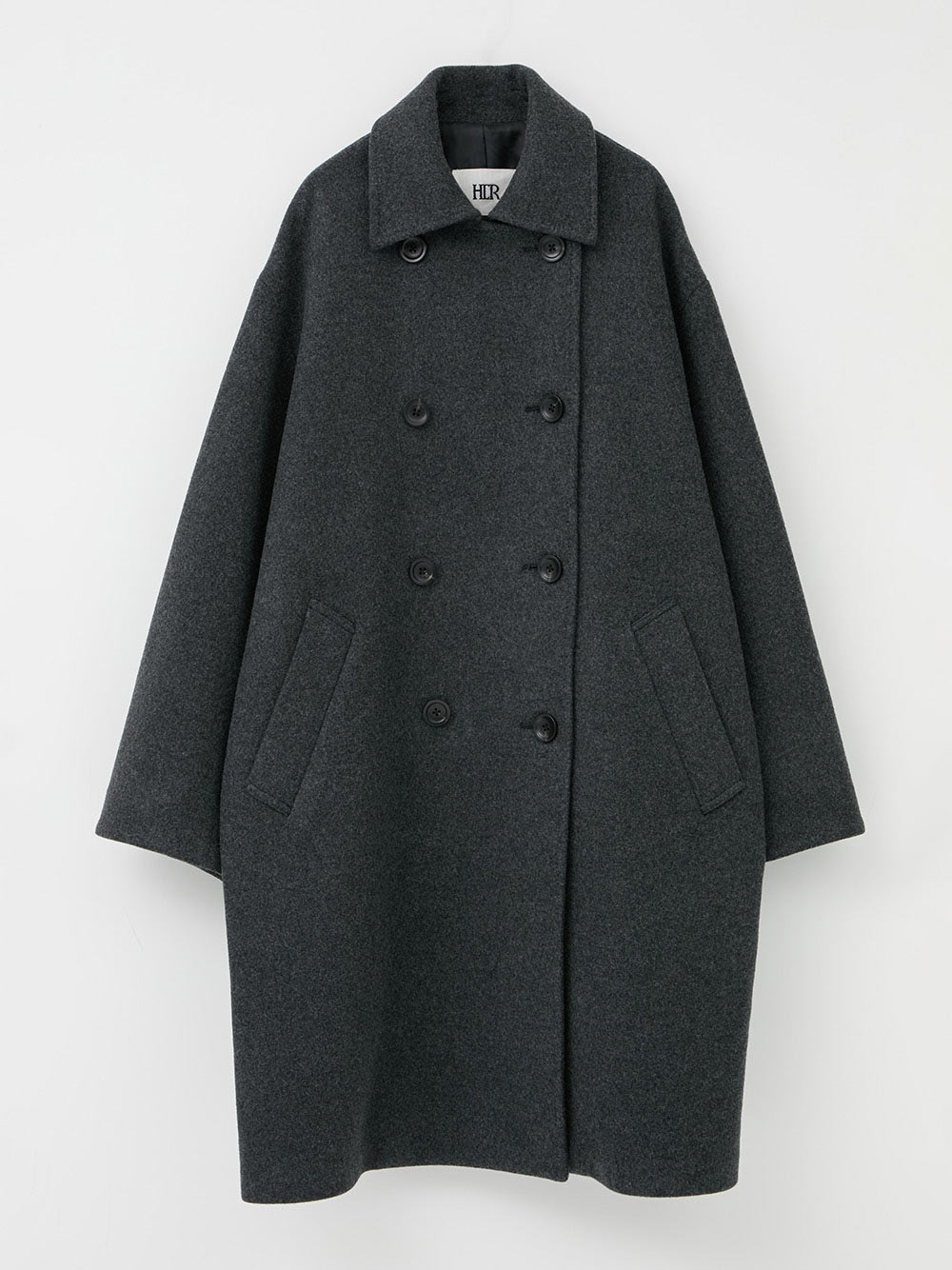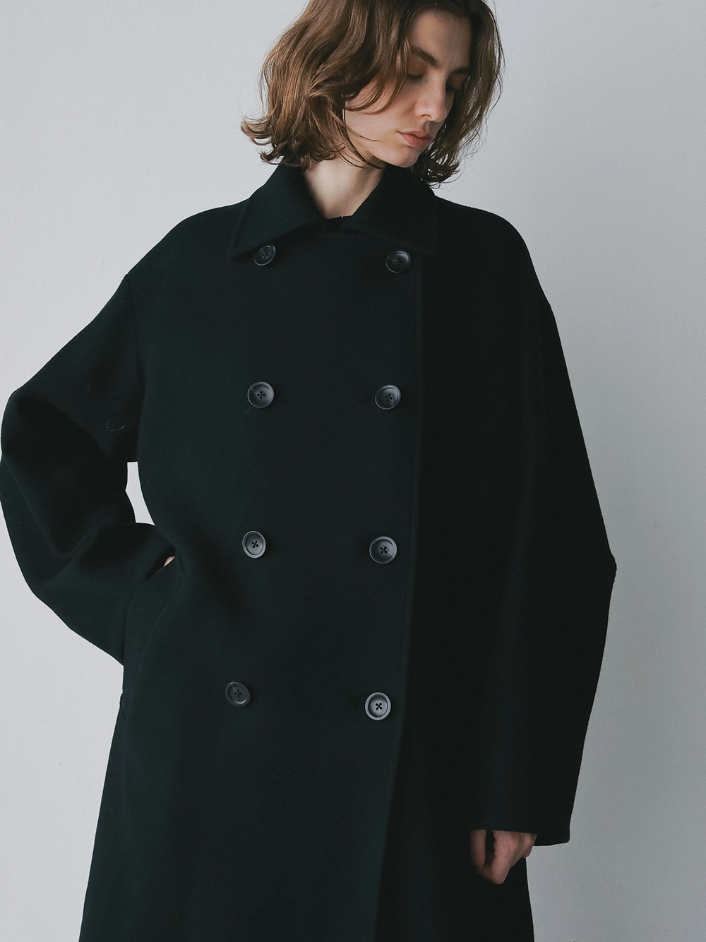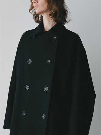 細番手の糸を使用したダブル前のオーバーコート。細番手の糸を高密度に織ることで適度な張り感としなやかさがある素材でON/OFF問わずコーディネートしやすい一枚。メンズライクなオーバーサイズ感が特徴ですが、細かなサイズ感にこだわっており、飽きのこないデザインです。