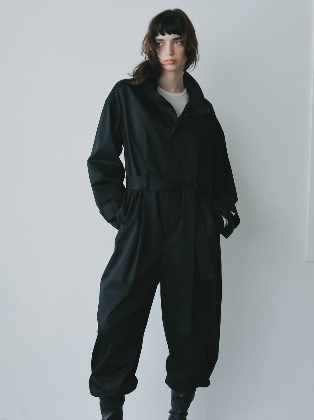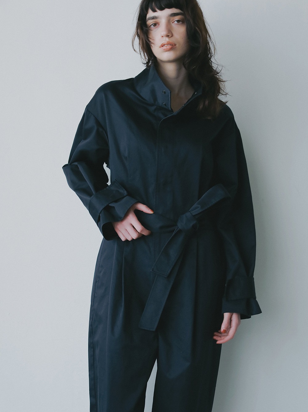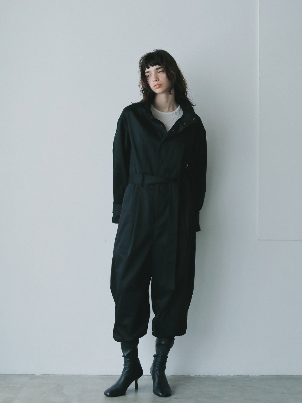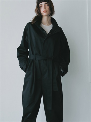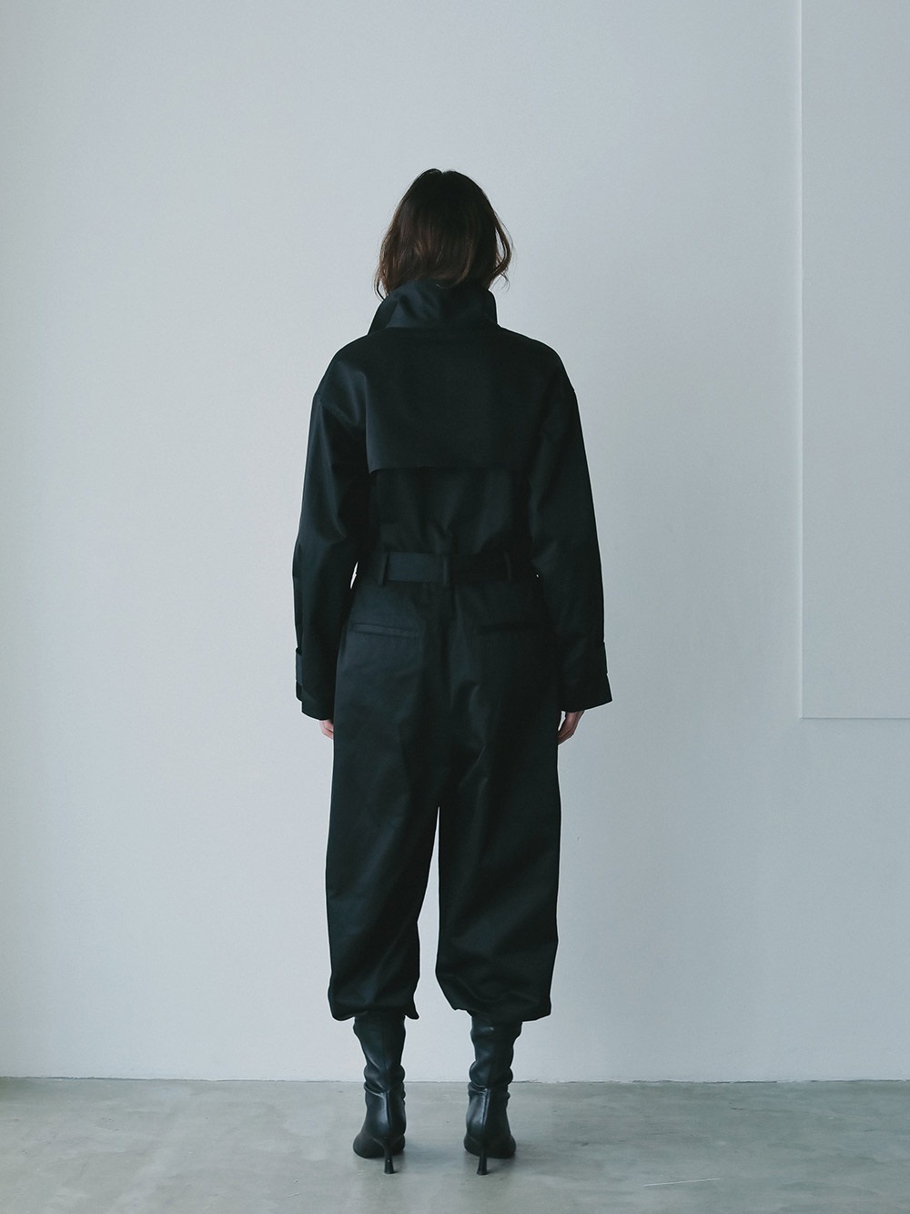 適度な光沢のあるギャバジンを使用したジャンプスーツ。高めのスタンドカラーを立て、ウエストベルトでマークしてマニッシュに着るのをおすすめします。後ろ身頃の雨よけや袖口のタブなど、トレンチコートのディティールを要所に取り込んだデザインアイテム。