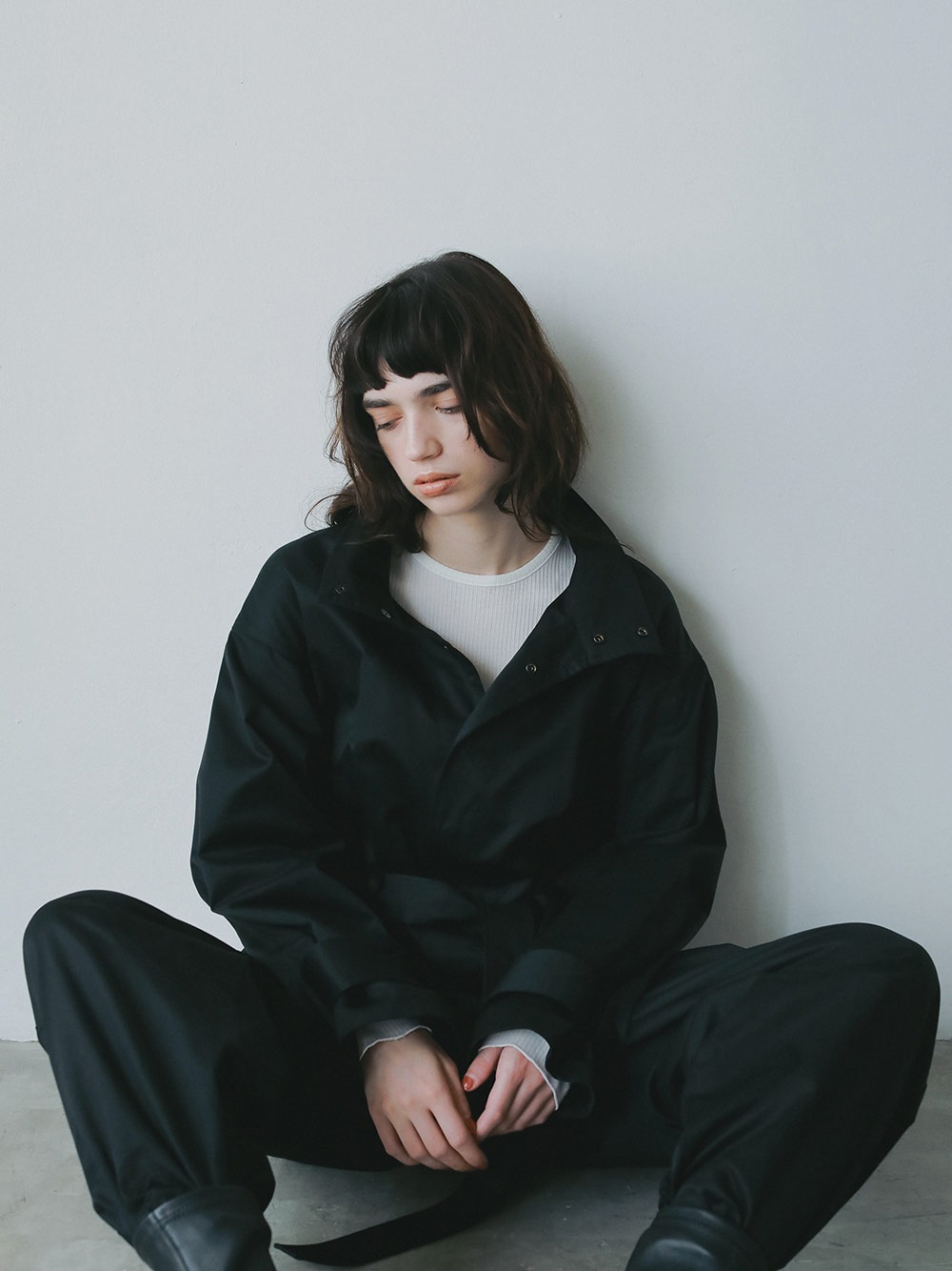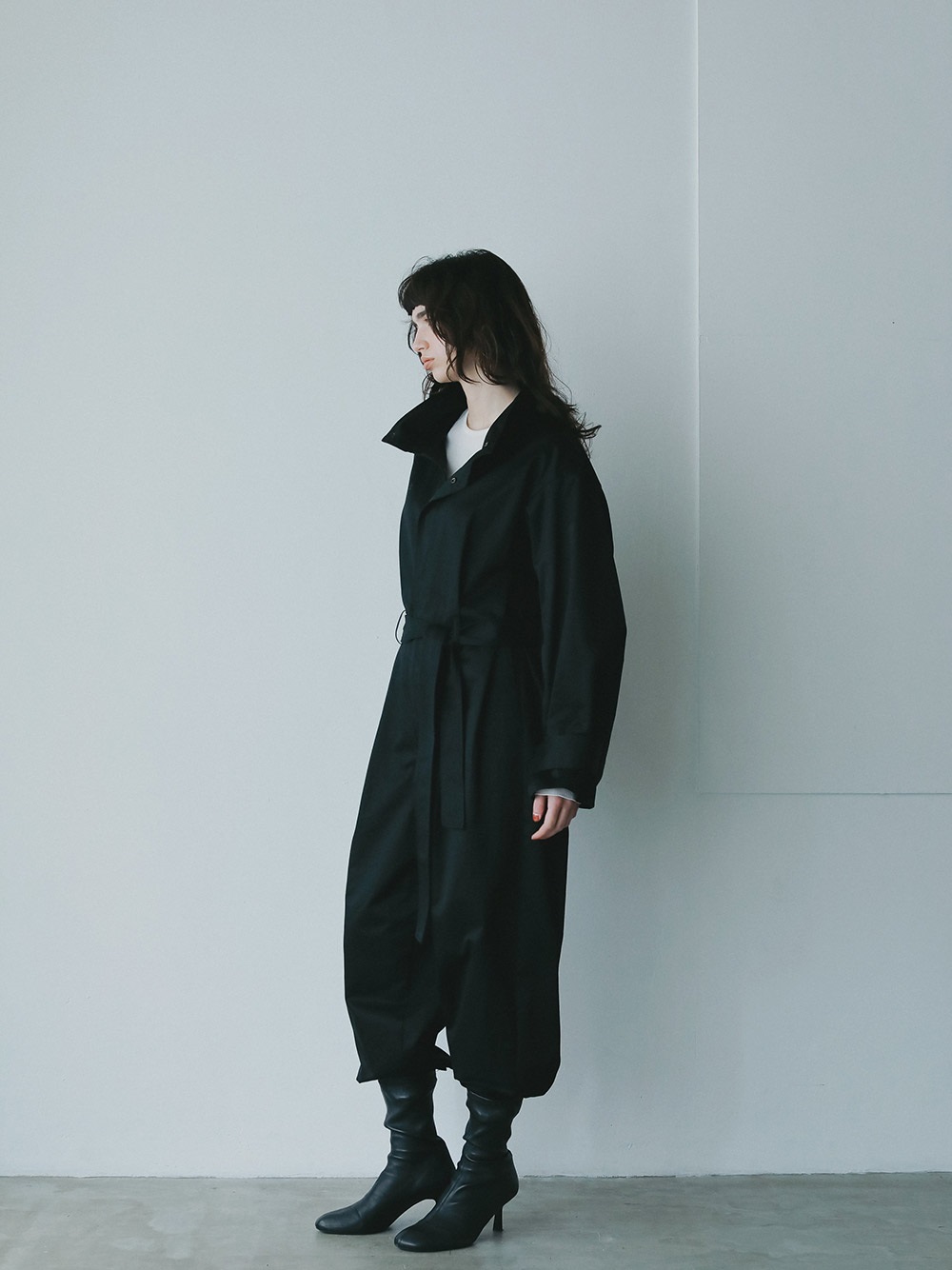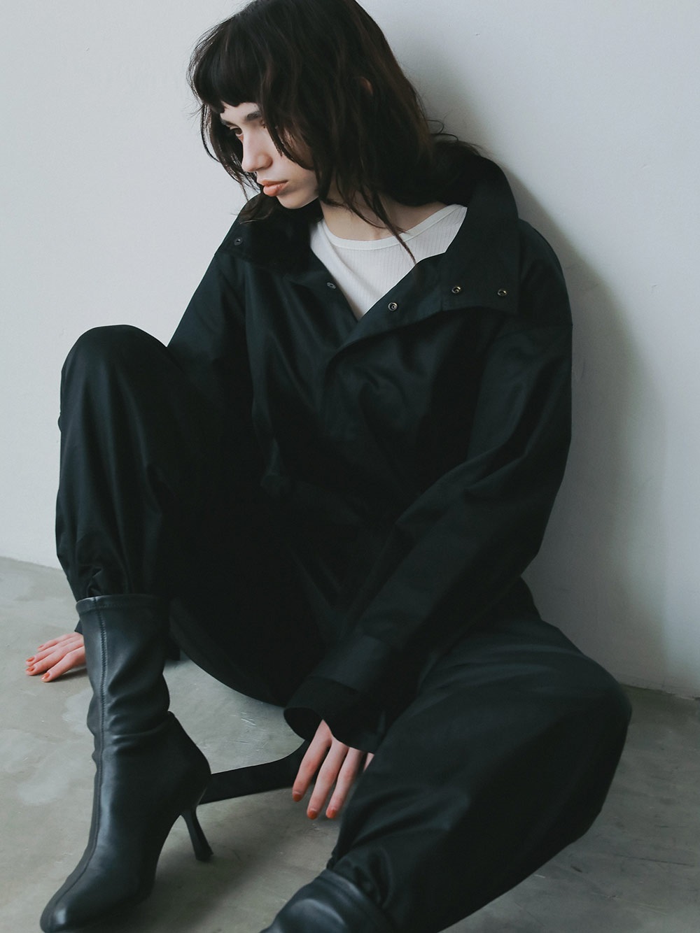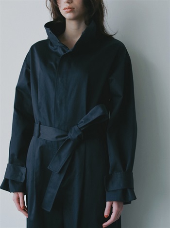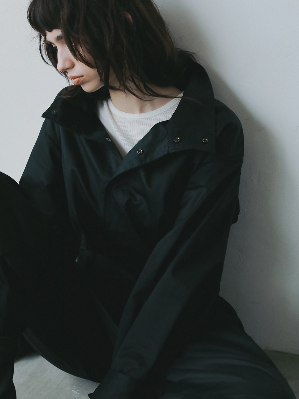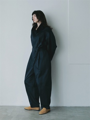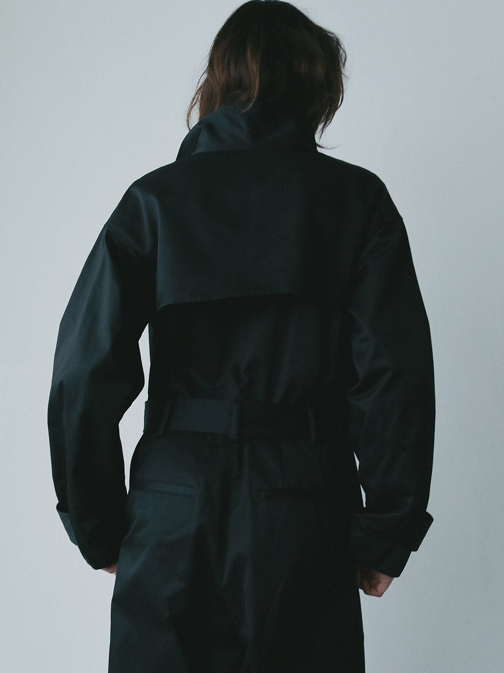 適度な光沢のあるギャバジンを使用したジャンプスーツ。高めのスタンドカラーを立て、ウエストベルトでマークしてマニッシュに着るのをおすすめします。後ろ身頃の雨よけや袖口のタブなど、トレンチコートのディティールを要所に取り込んだデザインアイテム。