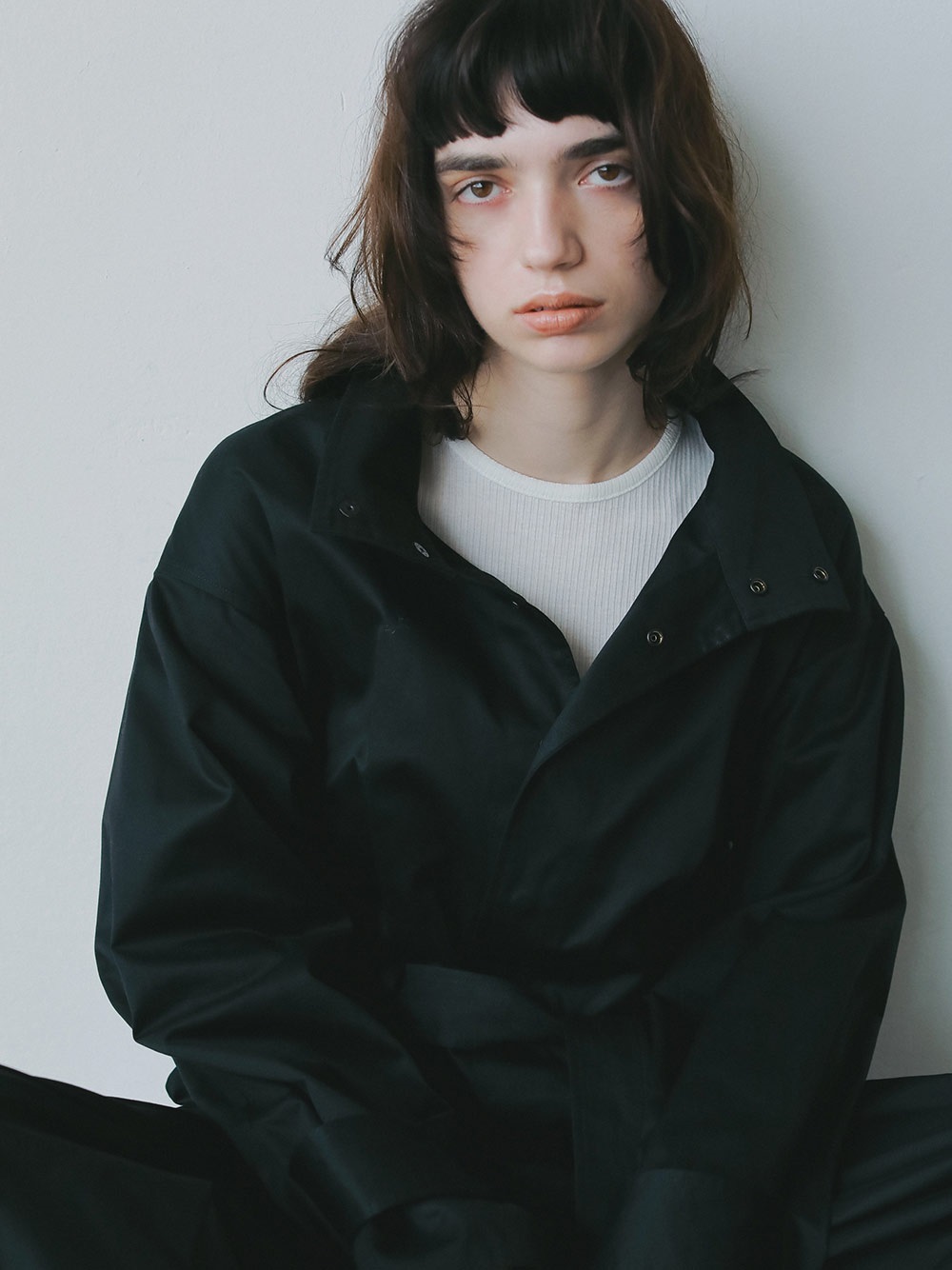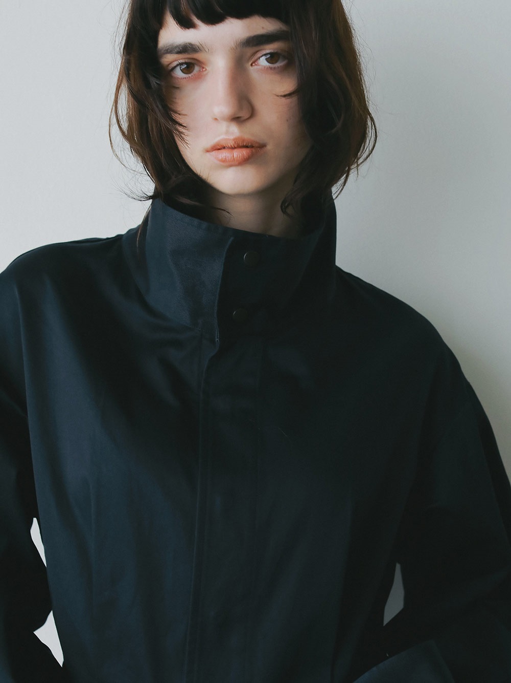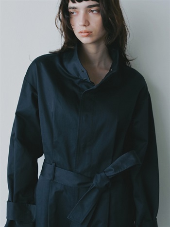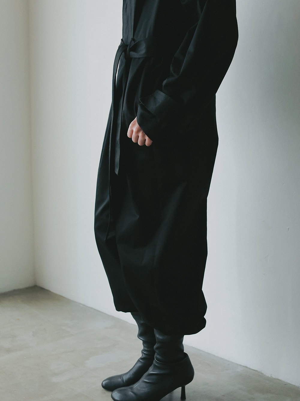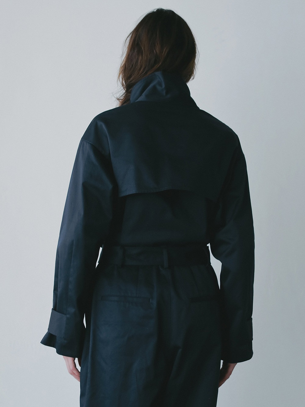適度な光沢のあるギャバジンを使用したジャンプスーツ。高めのスタンドカラーを立て、ウエストベルトでマークしてマニッシュに着るのをおすすめします。後ろ身頃の雨よけや袖口のタブなど、トレンチコートのディティールを要所に取り込んだデザインアイテム。