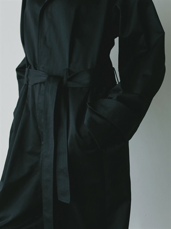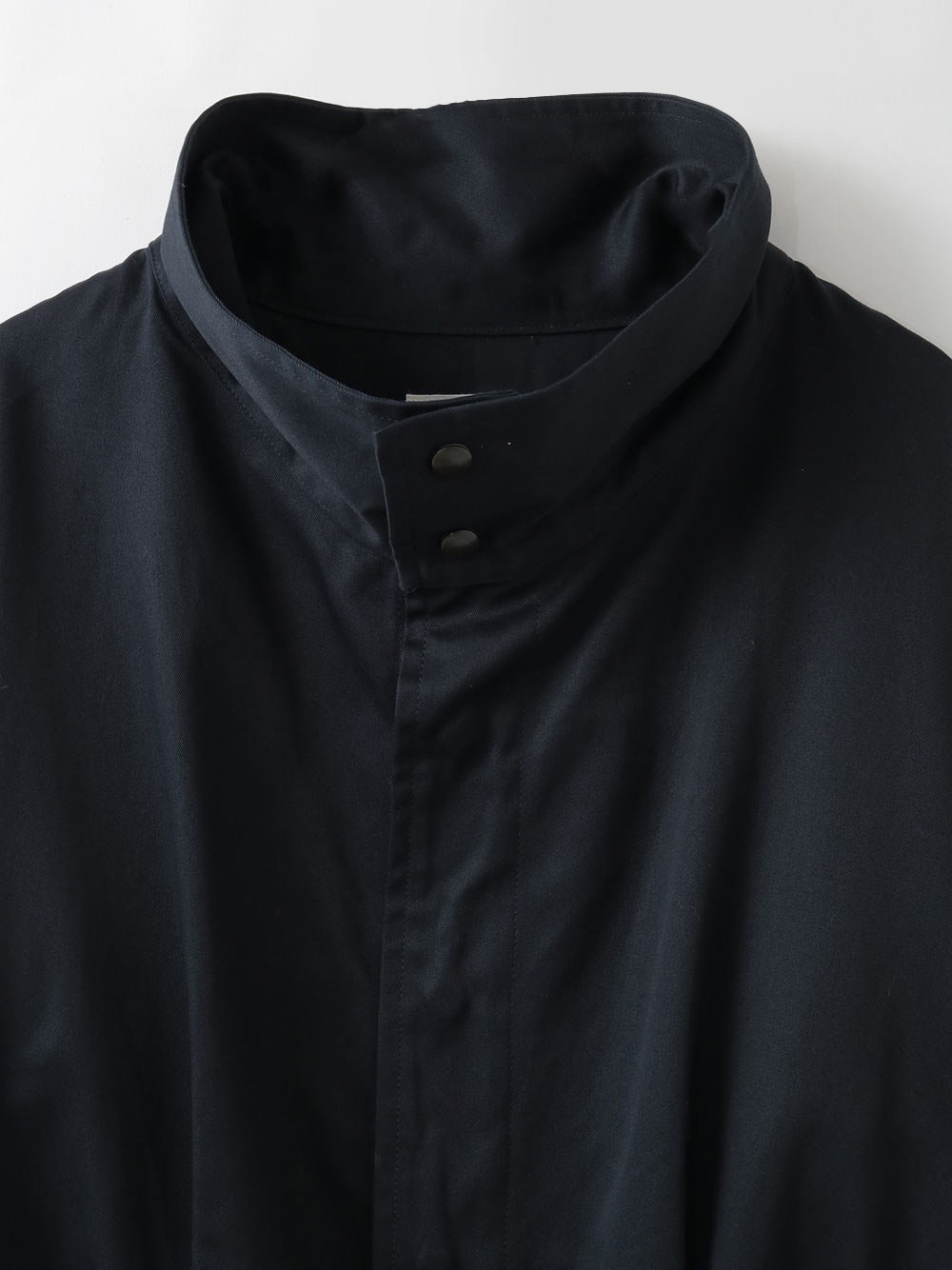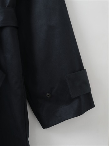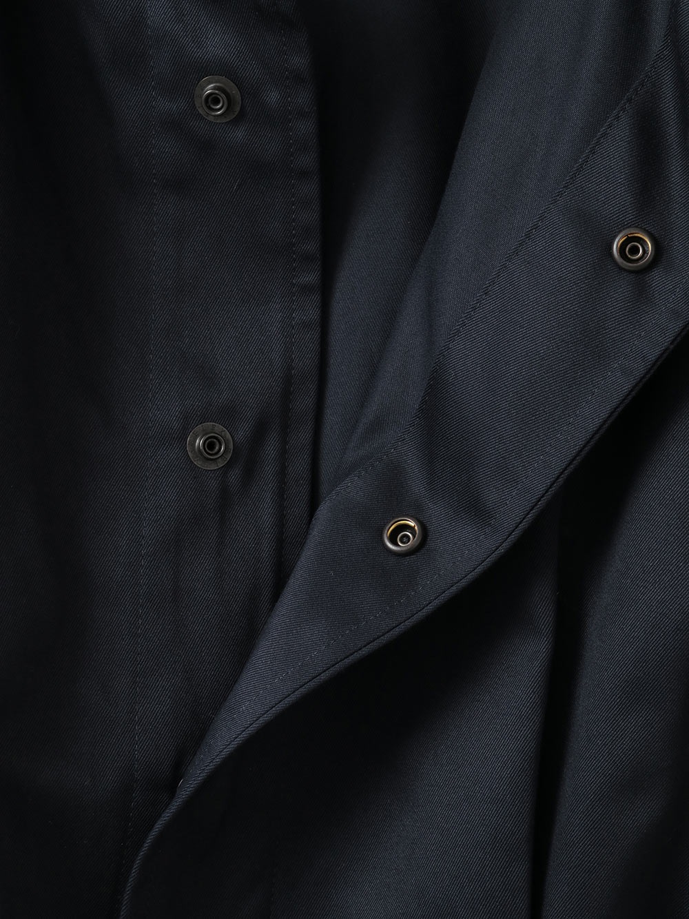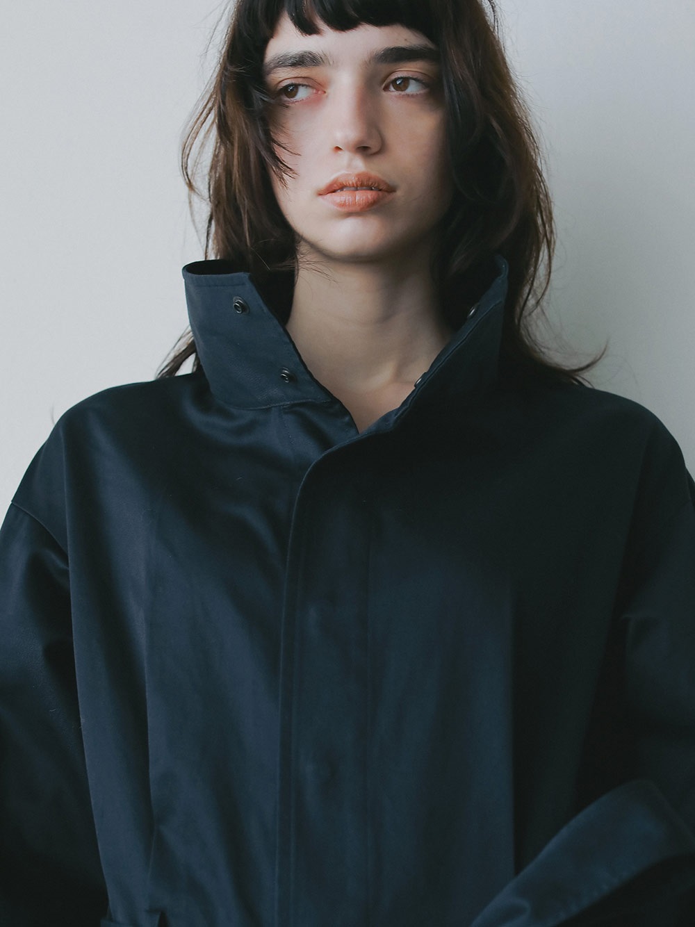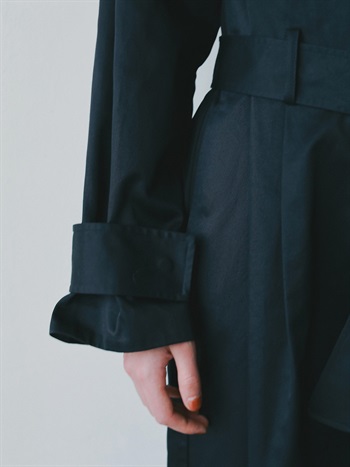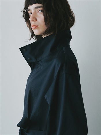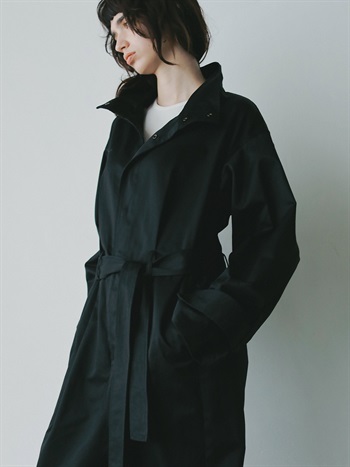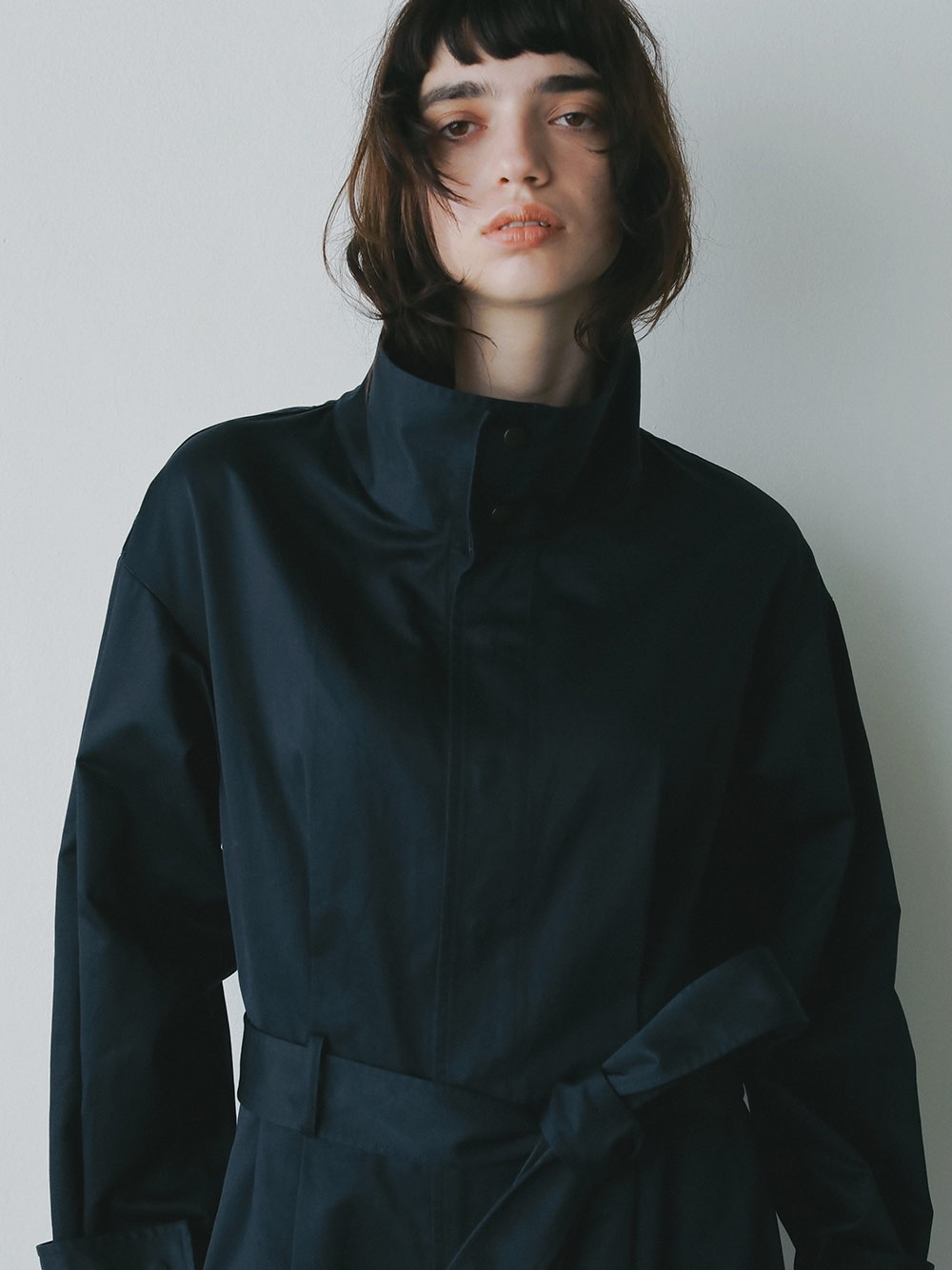 適度な光沢のあるギャバジンを使用したジャンプスーツ。高めのスタンドカラーを立て、ウエストベルトでマークしてマニッシュに着るのをおすすめします。後ろ身頃の雨よけや袖口のタブなど、トレンチコートのディティールを要所に取り込んだデザインアイテム。