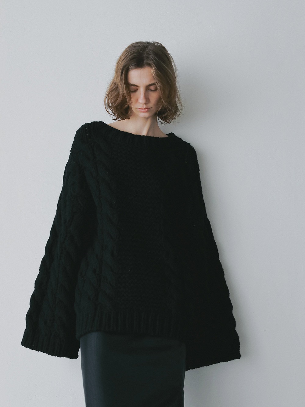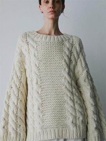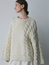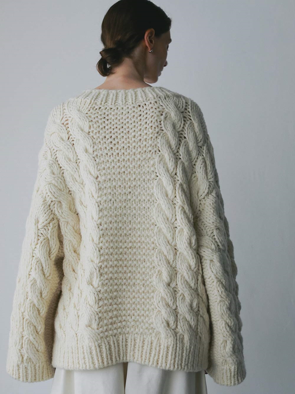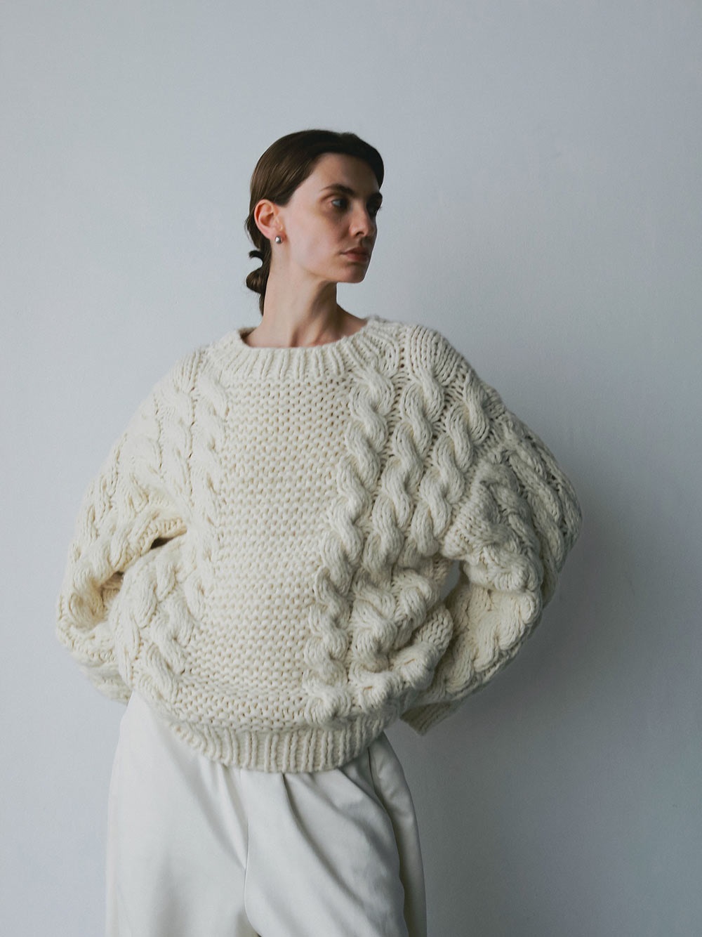 太番手の糸で1枚1枚丁寧に手編みしたニットプルオーバー。中心のハニカム柄と太いケーブル柄が組み合わさったアイコンシャスな1枚。立体的で温かみのある編み柄はハンドニットならでは。迫力のあるワイドスリーブで1枚で着てサマになるアイテムに仕上げました。