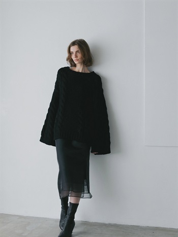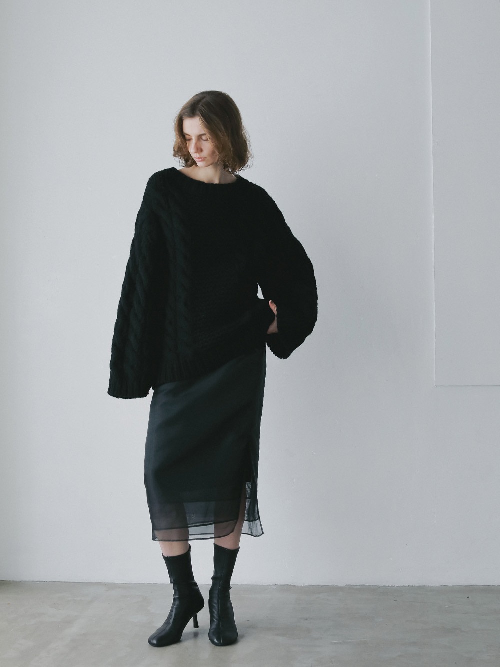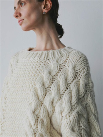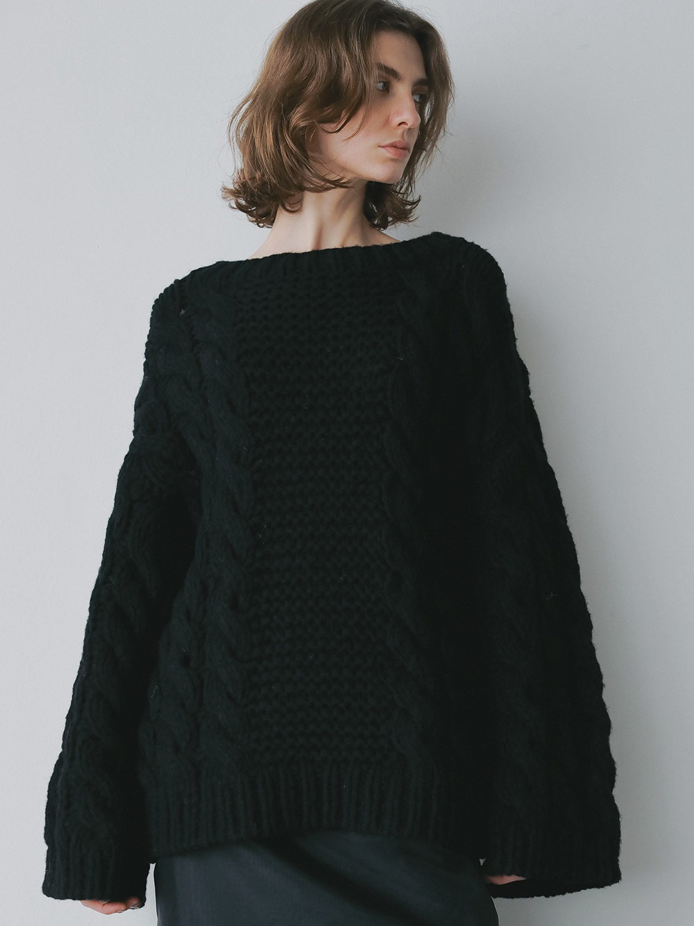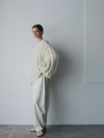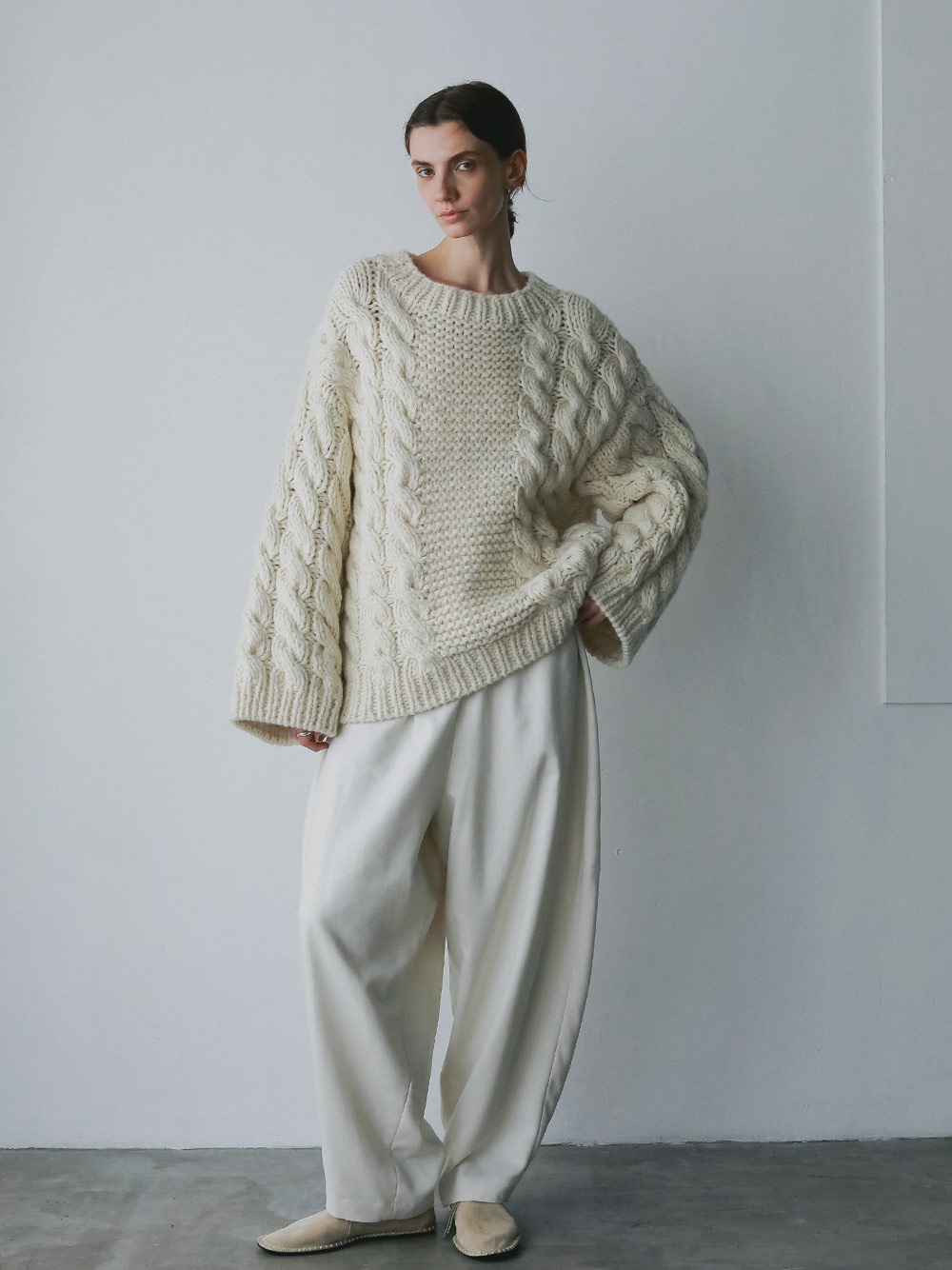 太番手の糸で1枚1枚丁寧に手編みしたニットプルオーバー。中心のハニカム柄と太いケーブル柄が組み合わさったアイコンシャスな1枚。立体的で温かみのある編み柄はハンドニットならでは。迫力のあるワイドスリーブで1枚で着てサマになるアイテムに仕上げました。