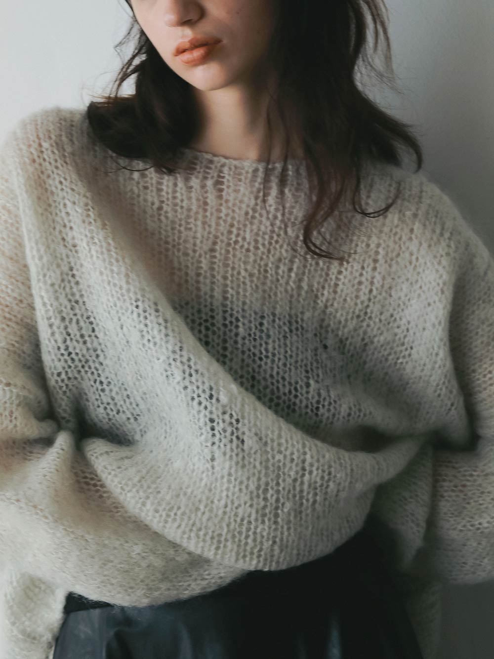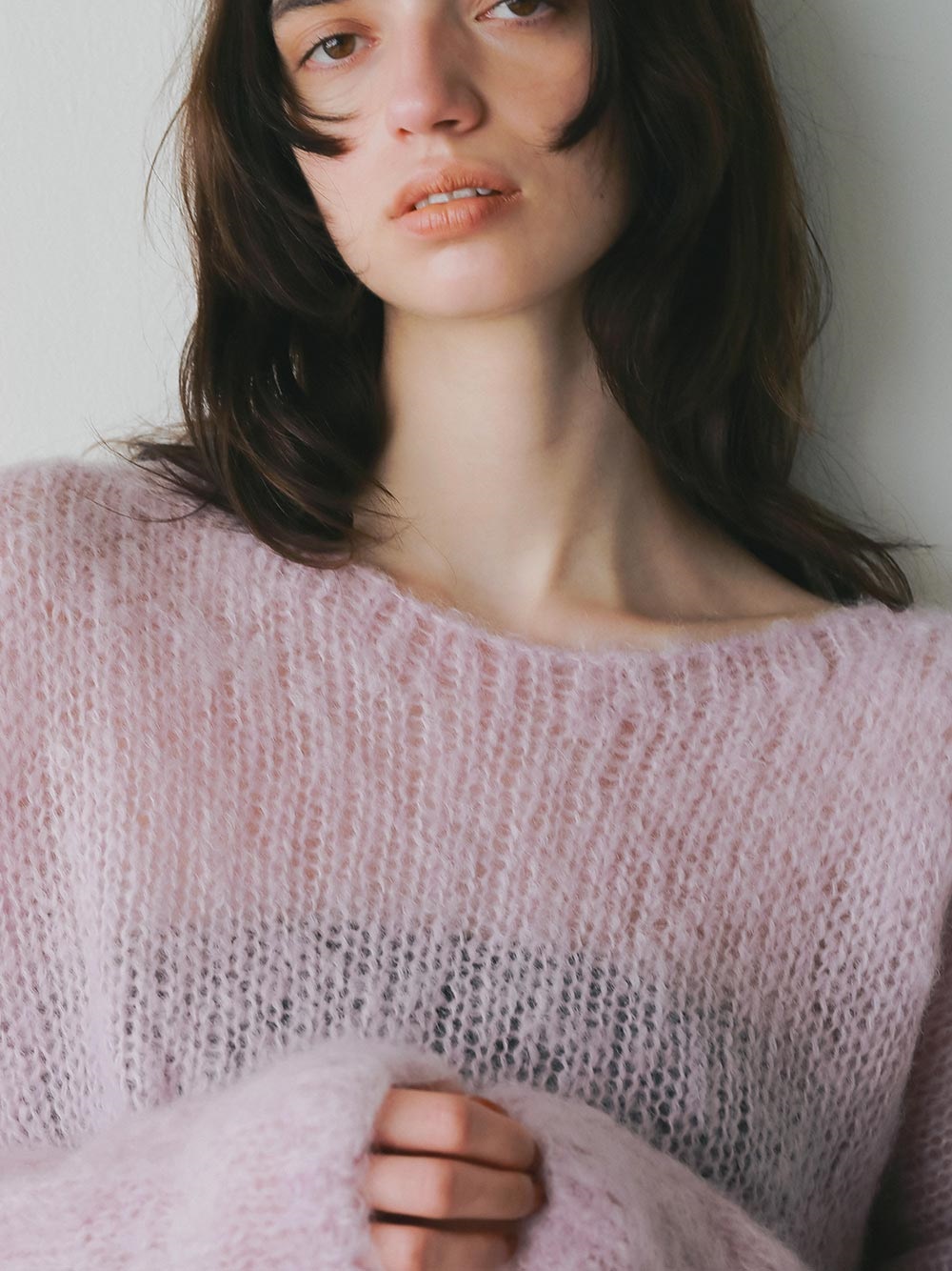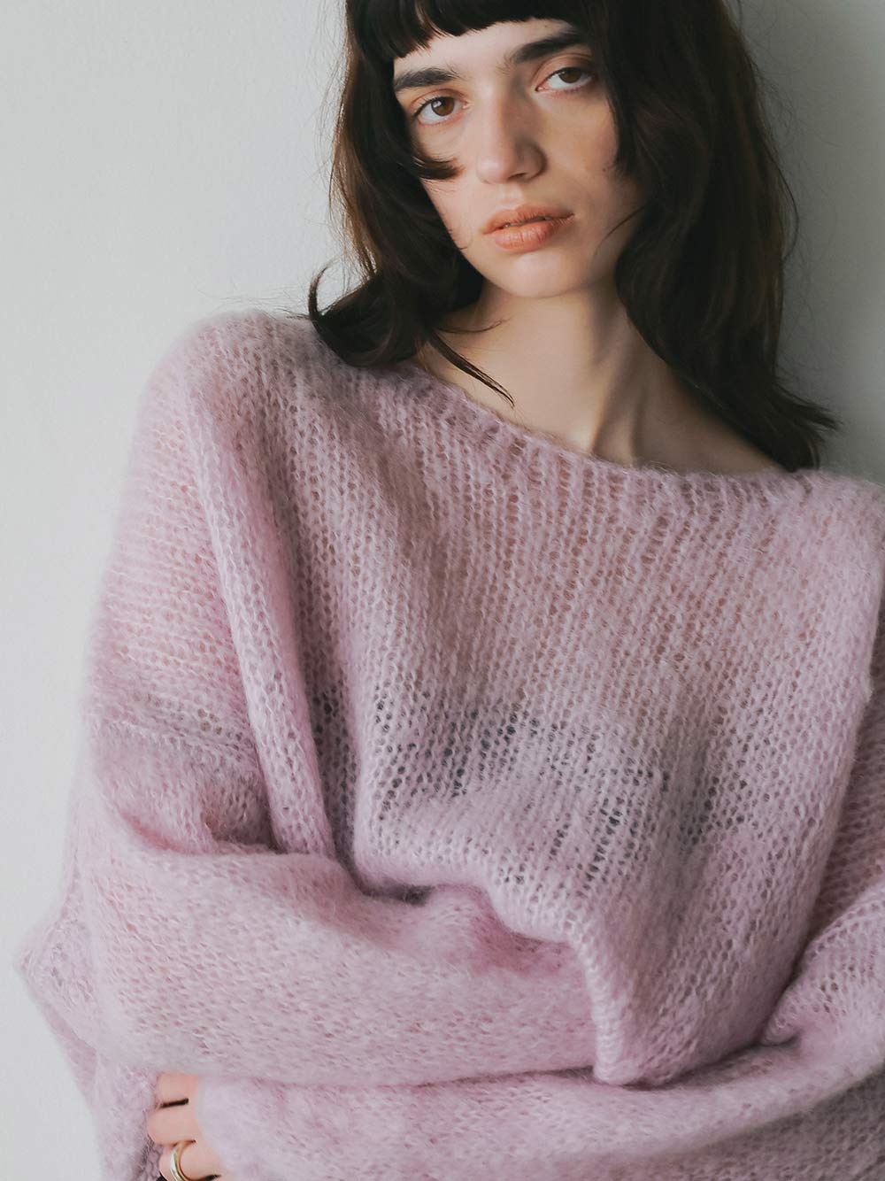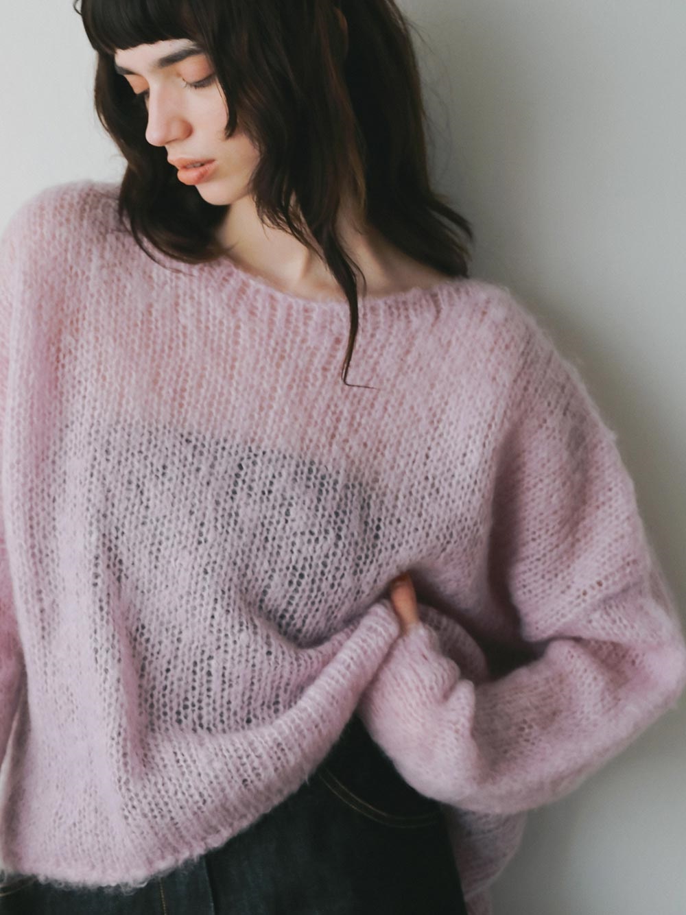 昨年から好評のモヘア高混率の風合いが美しいニットプルオーバー。通常のモヘアよりも1本1本が柔らかいキッドモヘアが86%使用された糸で編み上げた贅沢な1枚。メッシュ編みなので見た目以上に軽く、真冬の手前から着用できます。飽きのこないベーシック1枚だからこそサイジングや細かな仕様にこだわり、着用するほど良さを感じていただけます。ヨコに広めのリラックスしたシルエットは身体から離れる大人っぽい1枚。甘すぎない青みピンクカラーなど使いやすい色展開もポイント