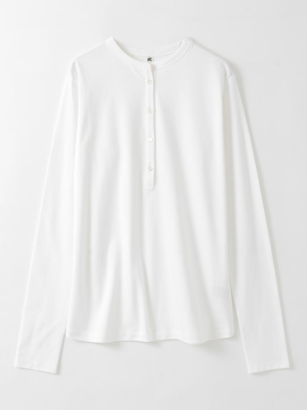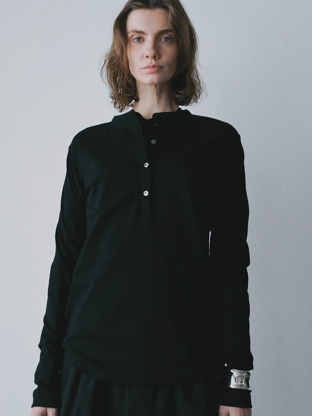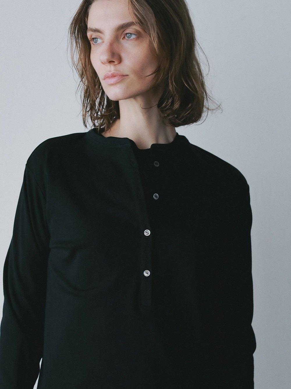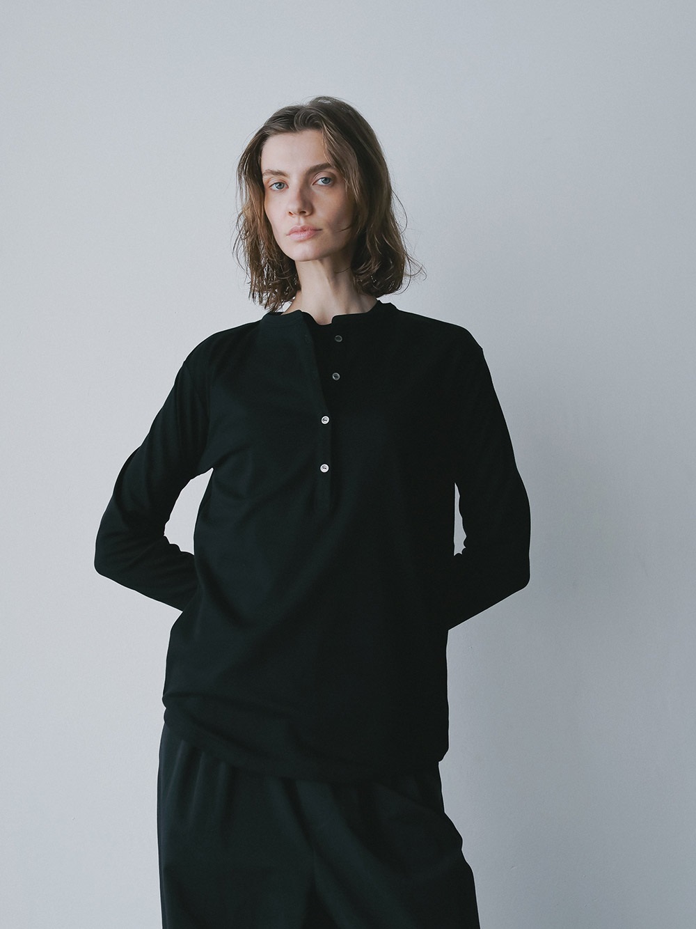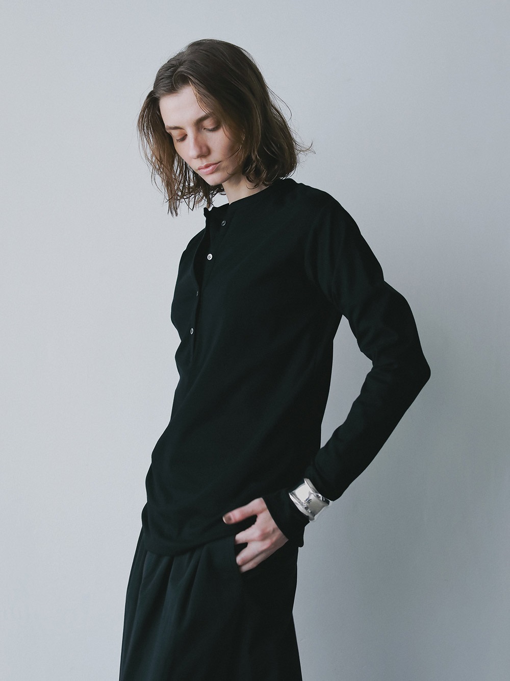 希少性の高いスビンコットンを使用したヘンリーネックプルオーバー。上質な肌触りで袖を通すたびに風合いの良さを感じていただけます。繊細な繊維を使用しているため光沢感がありシンプルなデザインでも映える1枚。透け感のない生地は秋冬から長いシーズンでご着用いただけます。デザインはカジュアルながら、素材の上品さで綺麗めにも幅広いコーディネートをお楽しみいただけます。