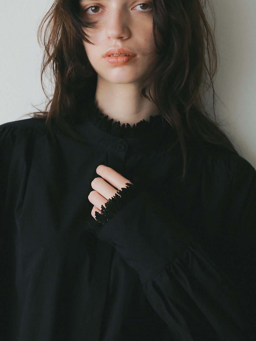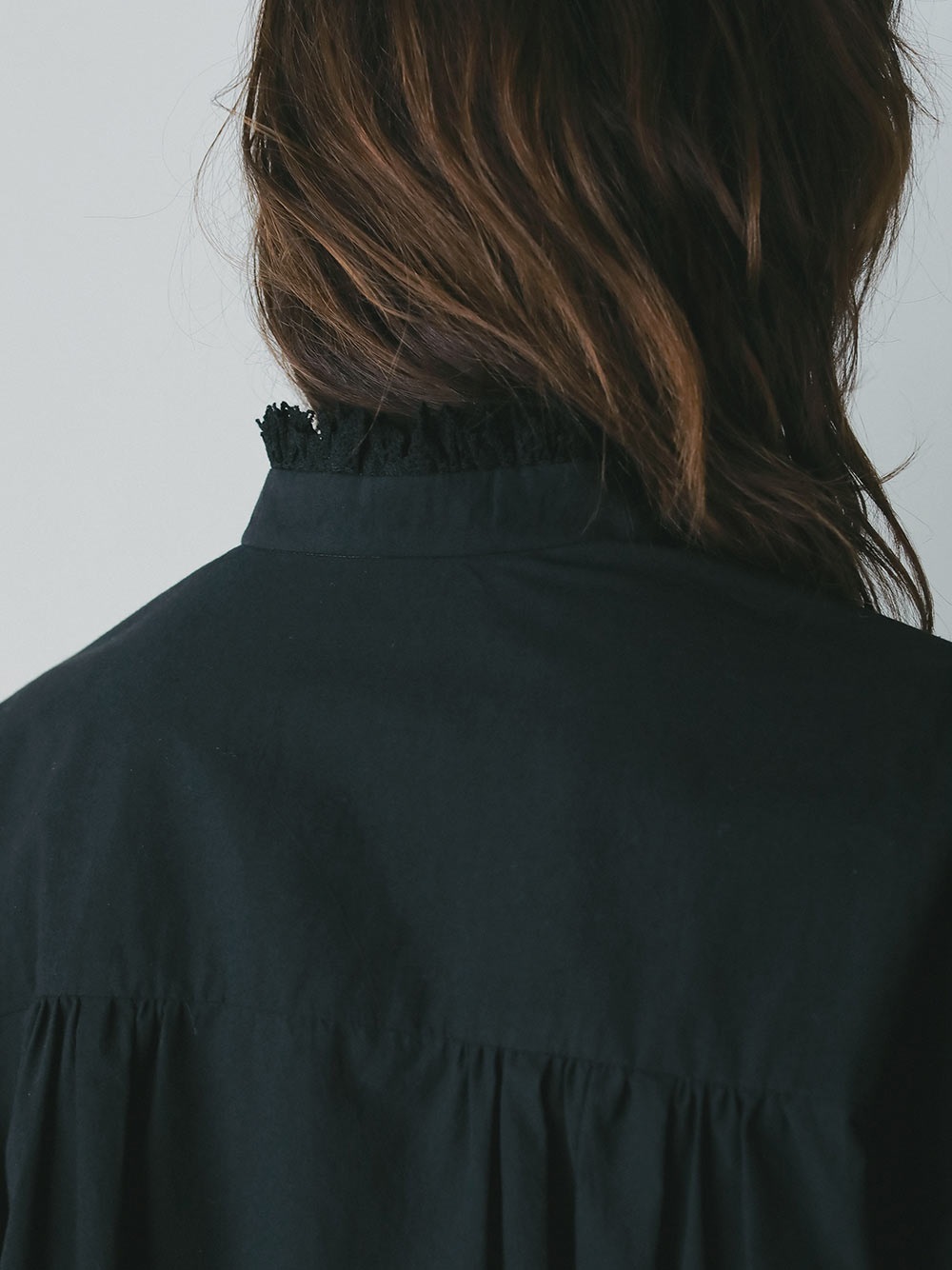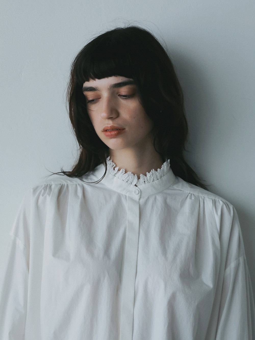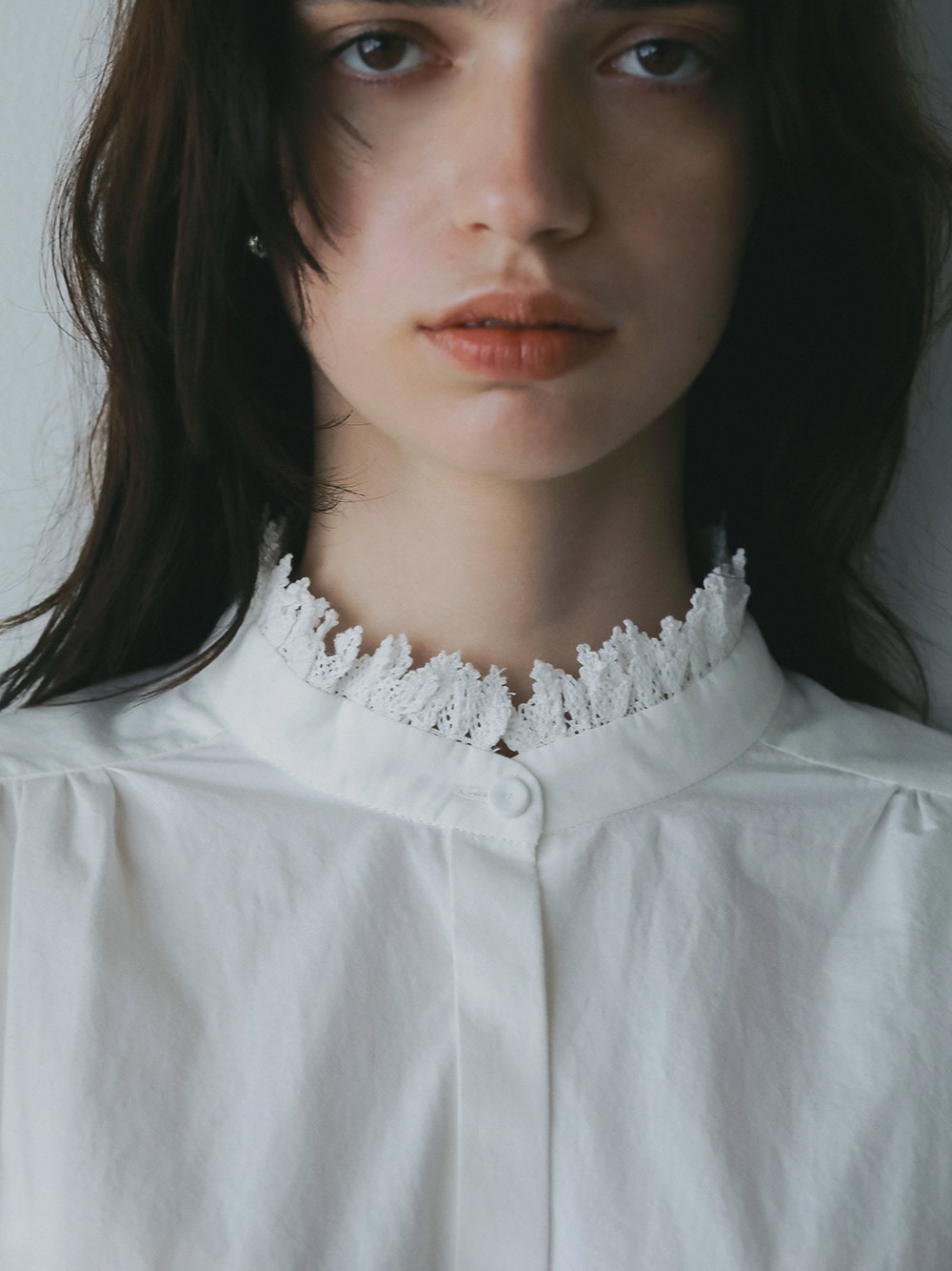 ヴィンテージのブラウスから発想を得たブラウス。衿とカフスにレースをあしらい雰囲気のあるクラシカルなアイテムに仕上げました。ニットなどのインナーとして衿や袖のレースをのぞかせるスタイルもおすすめです。