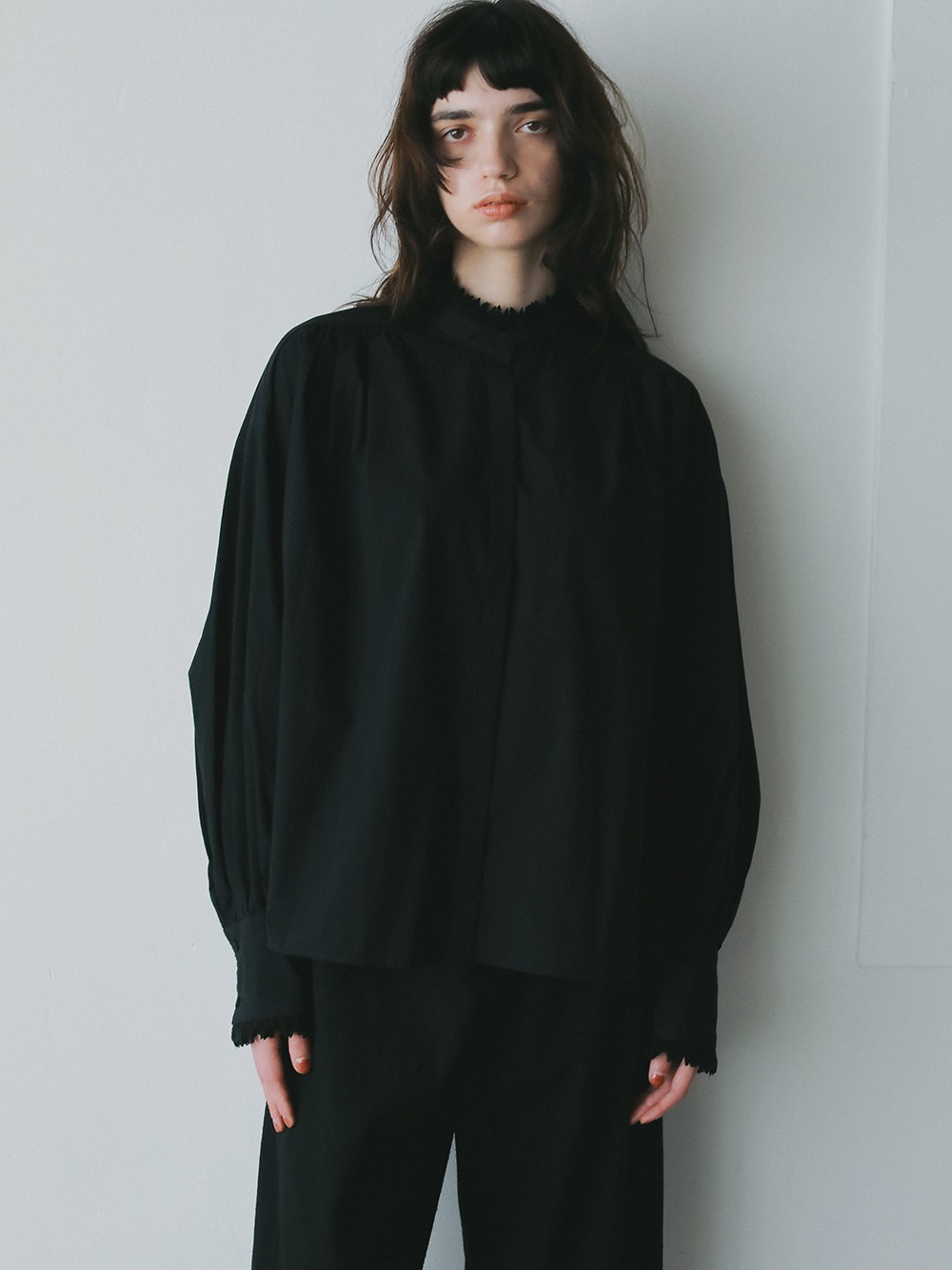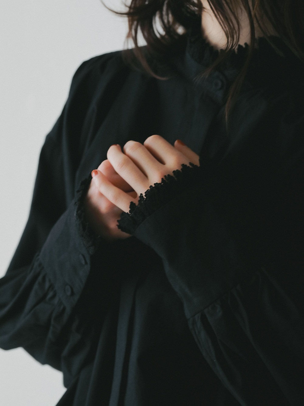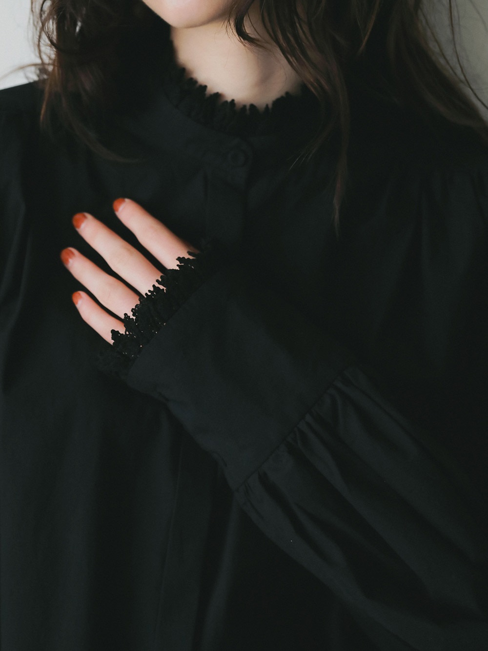ヴィンテージのブラウスから発想を得たブラウス。衿とカフスにレースをあしらい雰囲気のあるクラシカルなアイテムに仕上げました。ニットなどのインナーとして衿や袖のレースをのぞかせるスタイルもおすすめです。