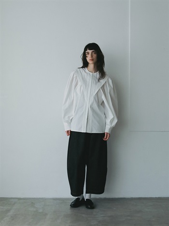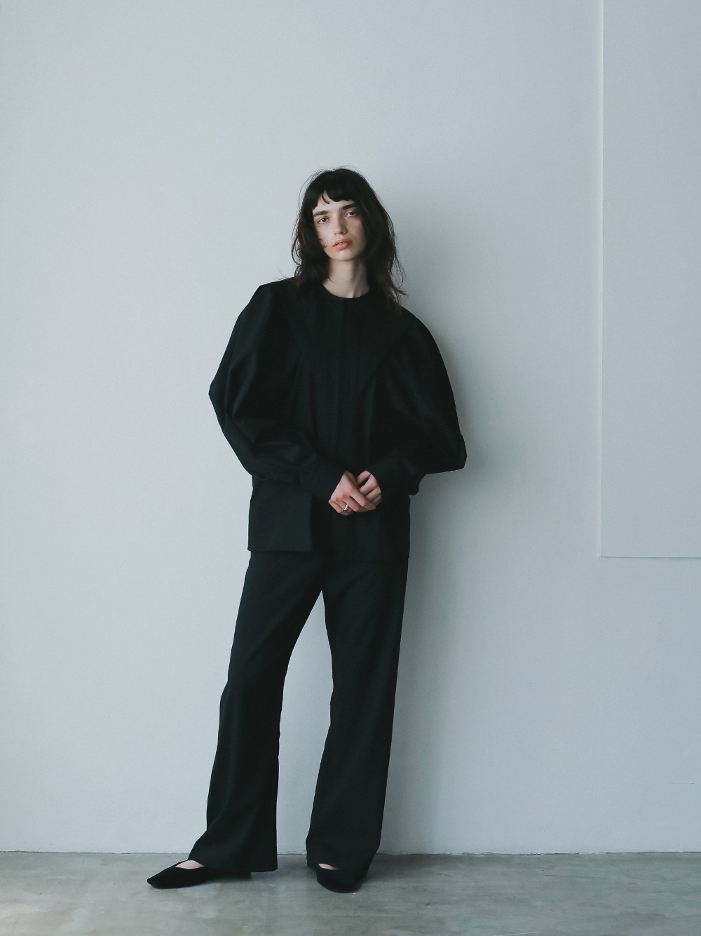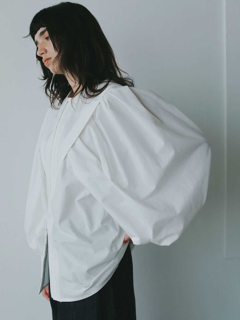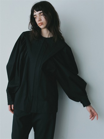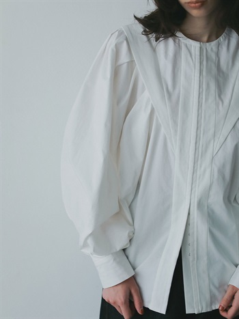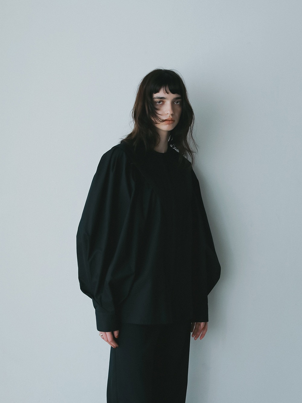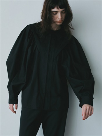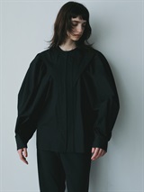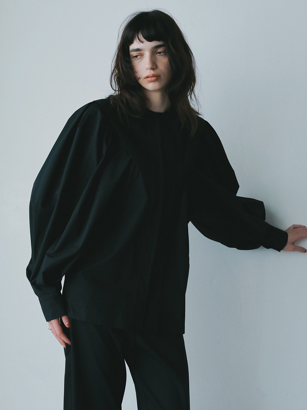 イレギュラーにとられたタックを活かしたバルーンスリーブが印象的なブラウス。フロントはホックあきの始末、ボディはすっきりとしたロング丈でモードな印象の1枚に仕立てました。