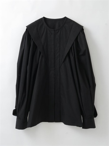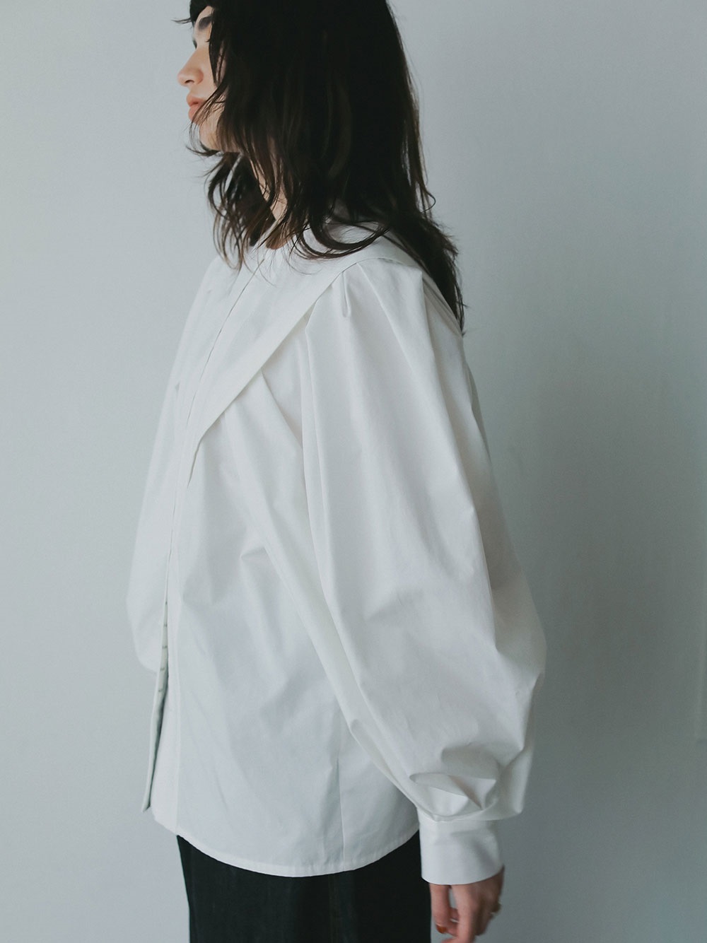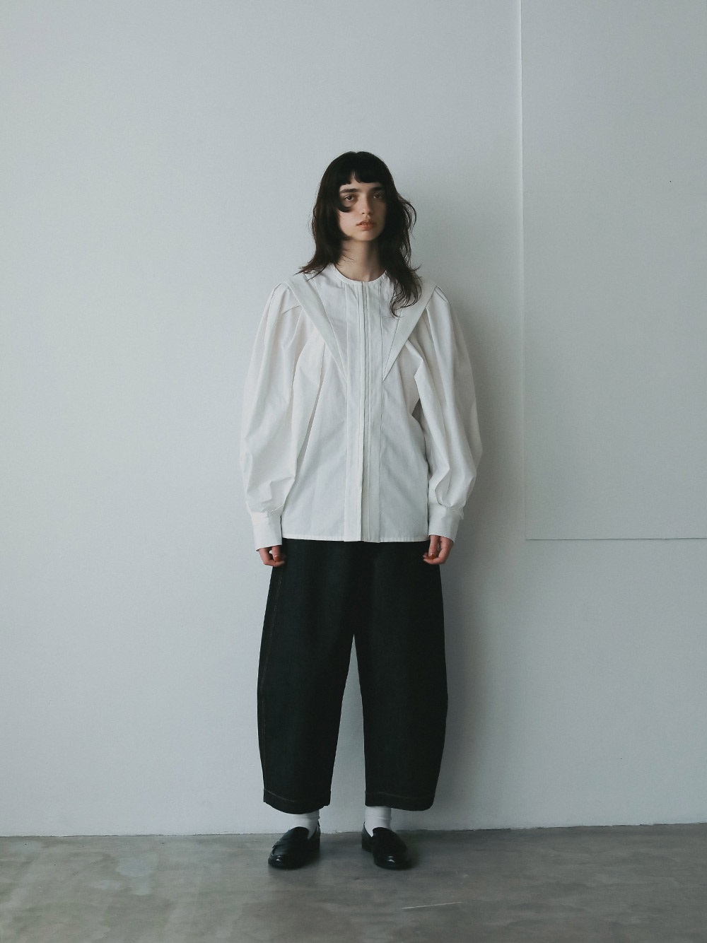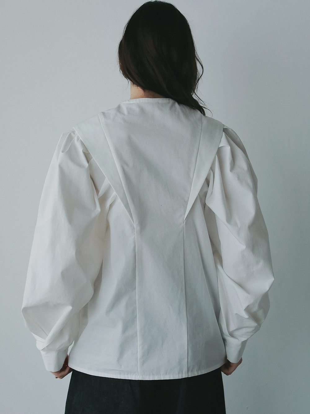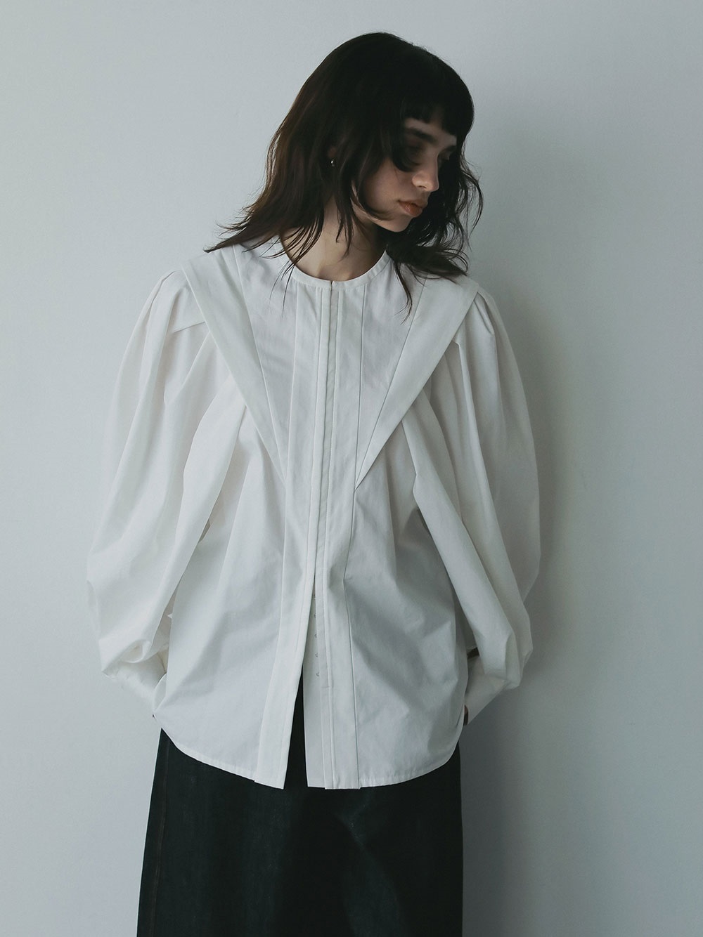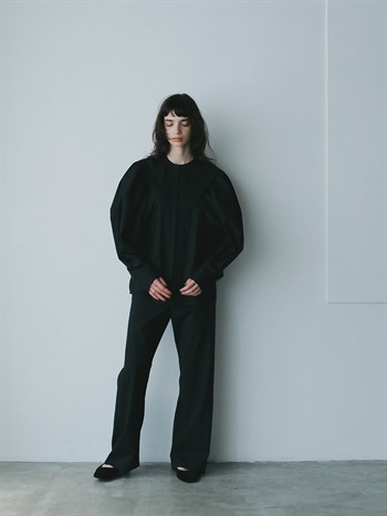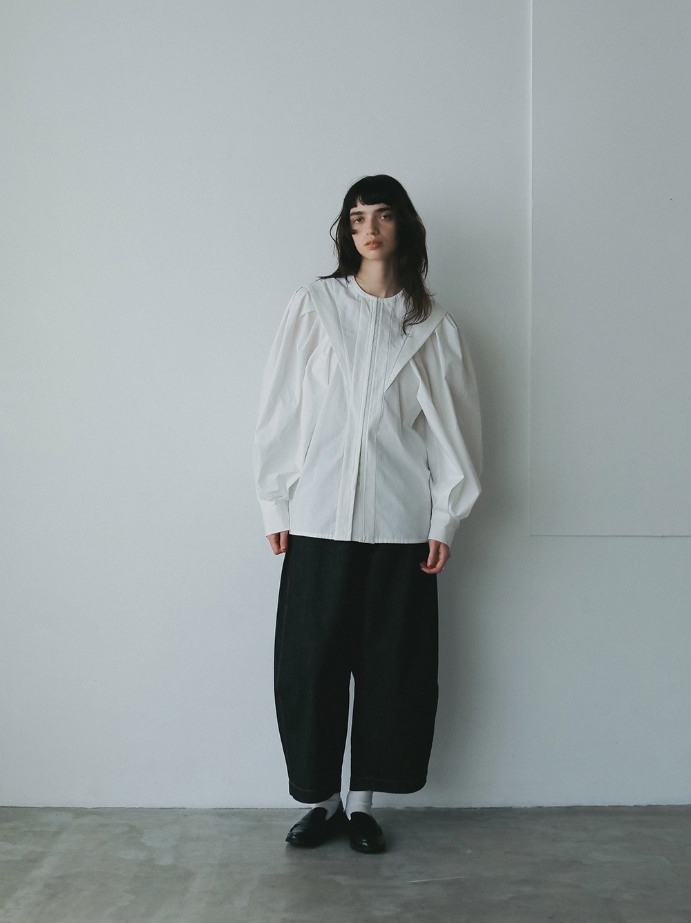 イレギュラーにとられたタックを活かしたバルーンスリーブが印象的なブラウス。フロントはホックあきの始末、ボディはすっきりとしたロング丈でモードな印象の1枚に仕立てました。