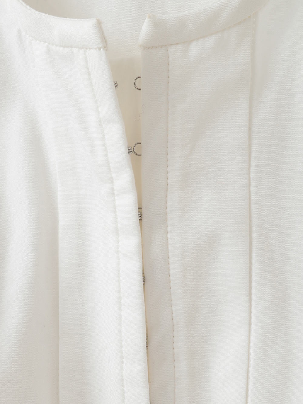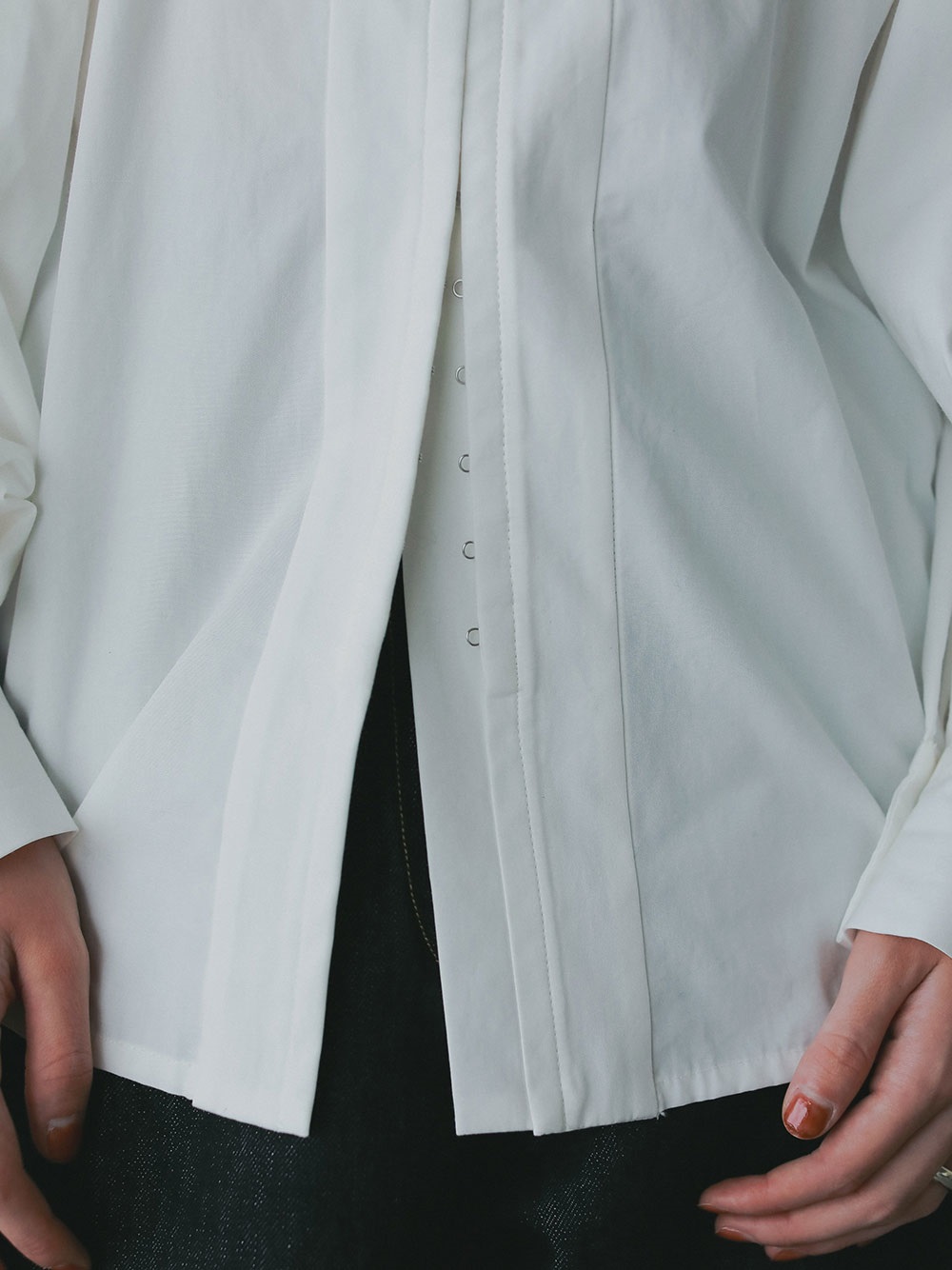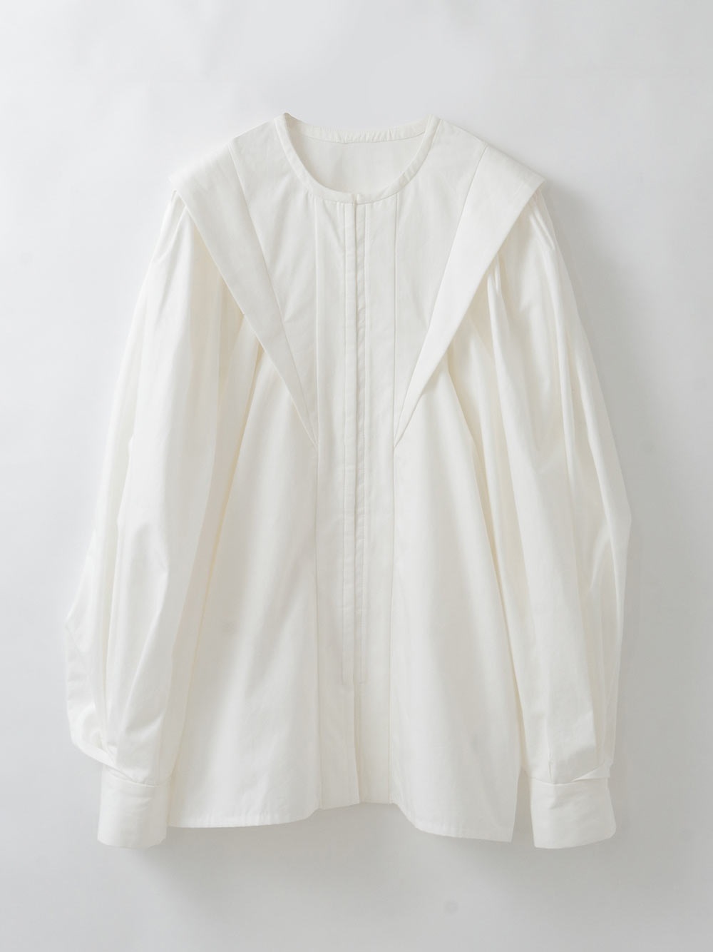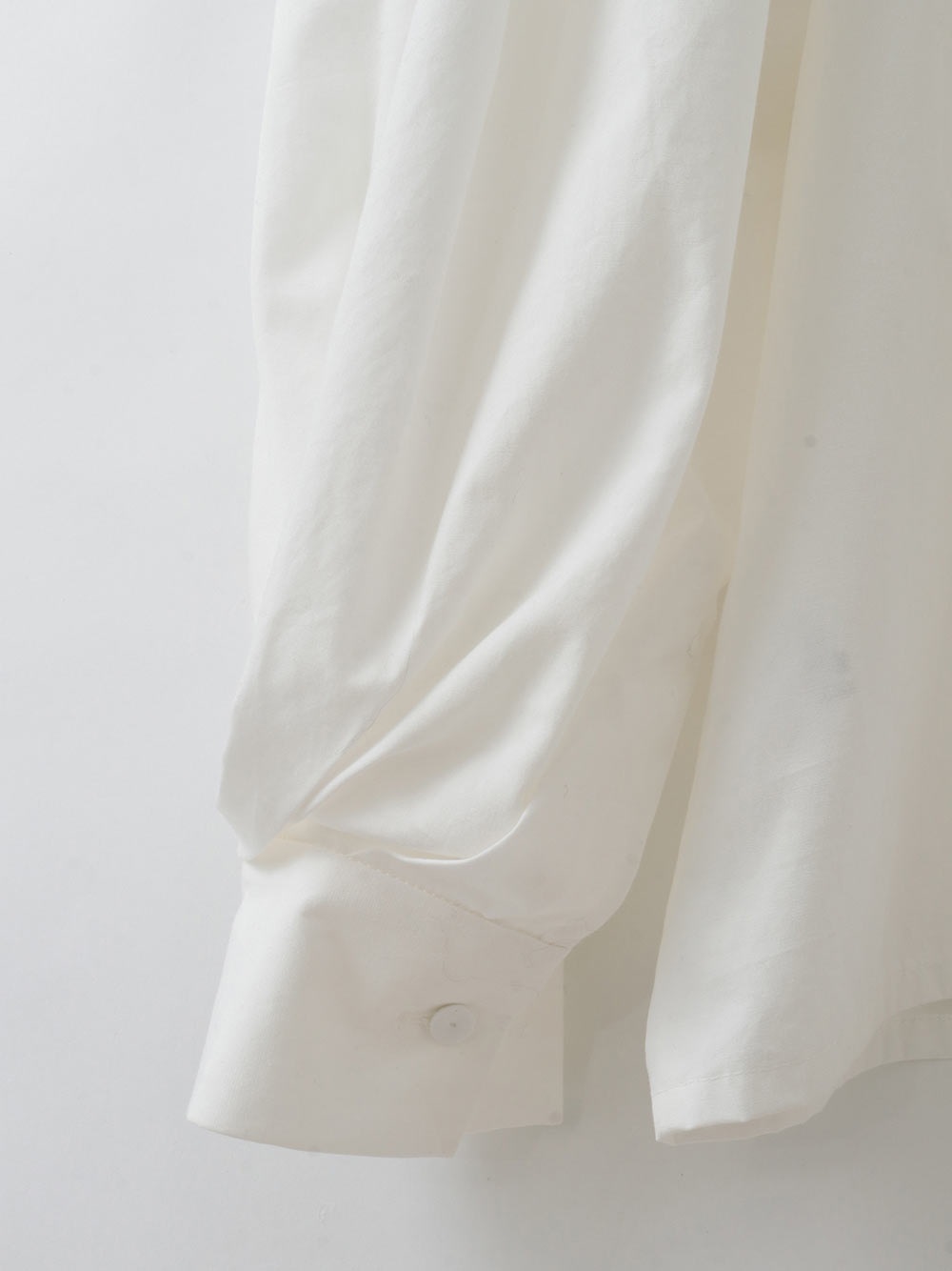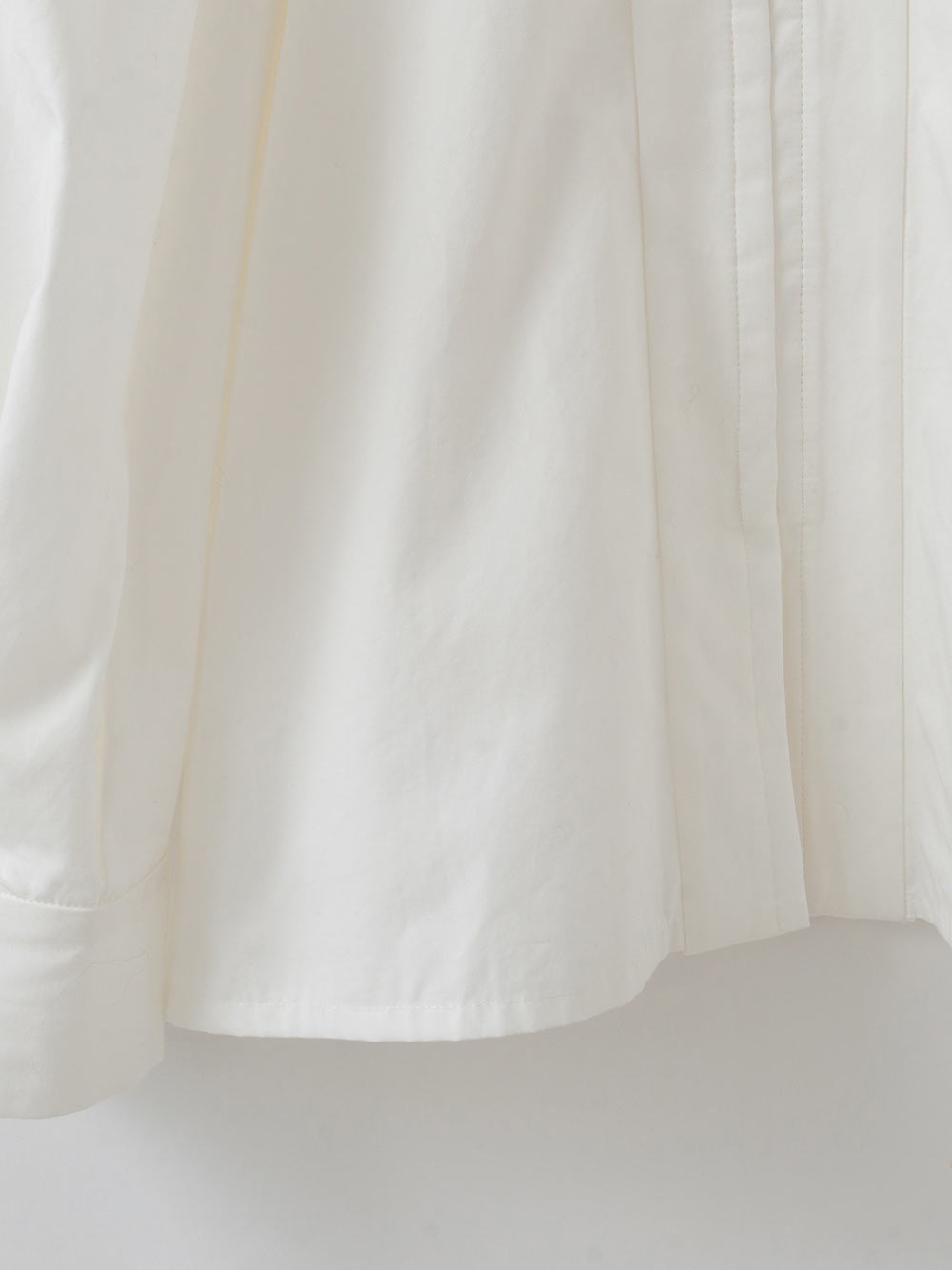 イレギュラーにとられたタックを活かしたバルーンスリーブが印象的なブラウス。フロントはホックあきの始末、ボディはすっきりとしたロング丈でモードな印象の1枚に仕立てました。