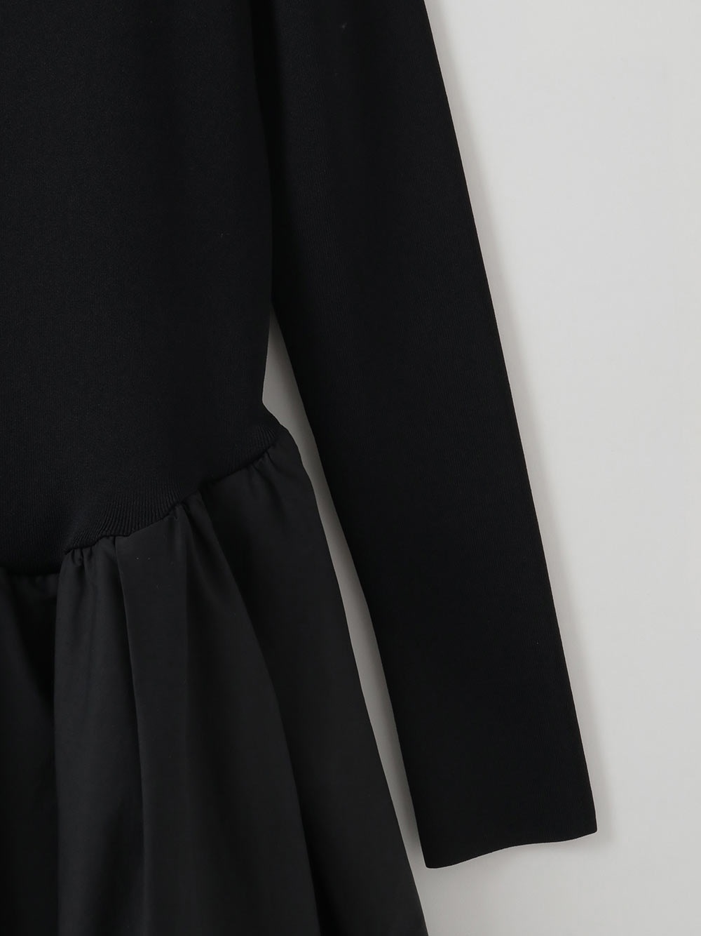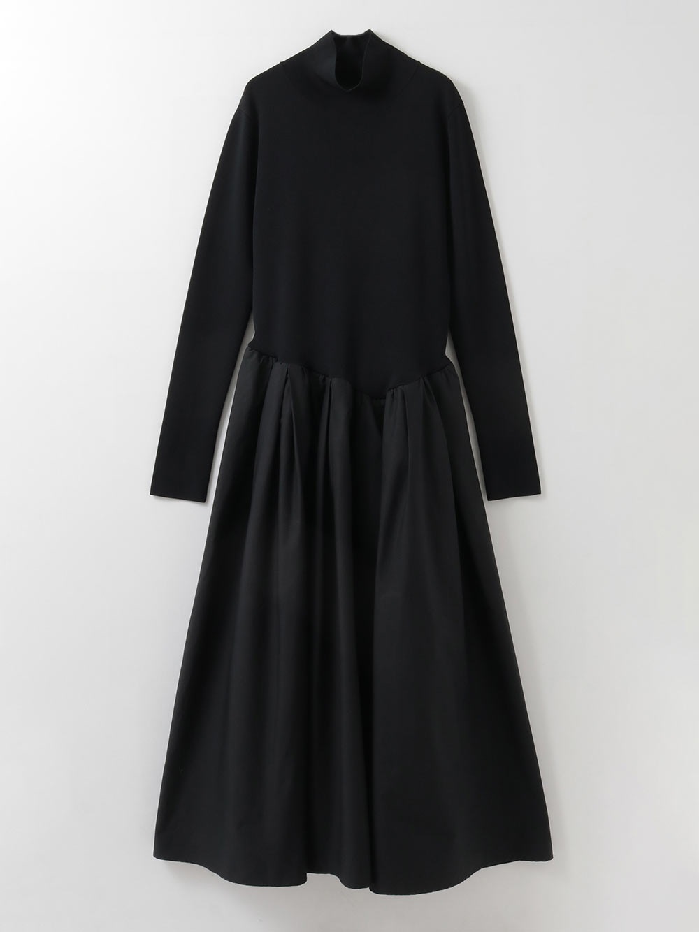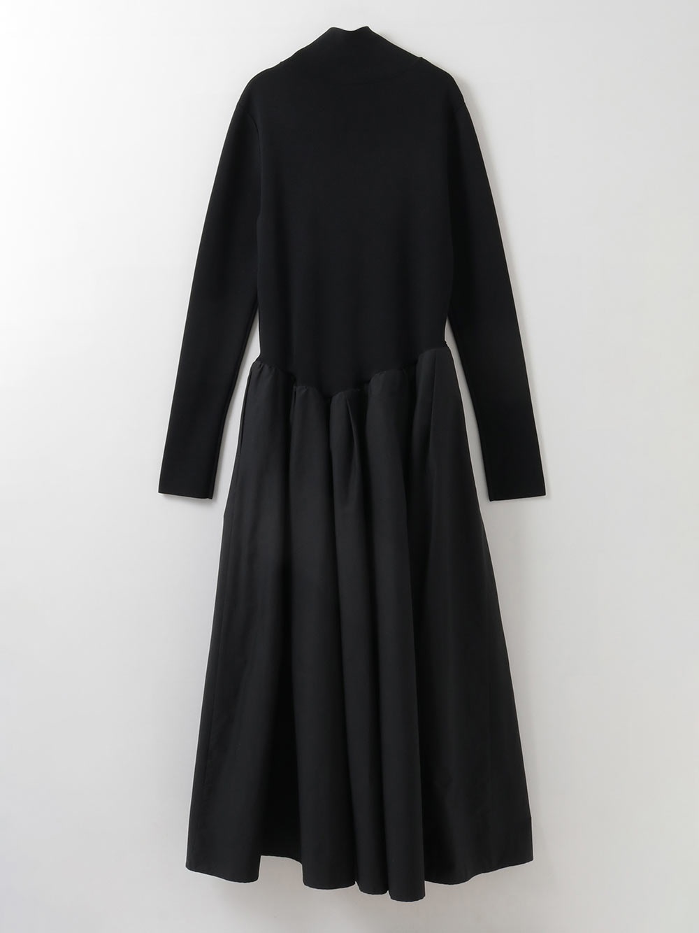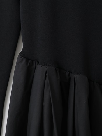 直線的なハイネックのニットトップスにボリューム感のあるギャザーフレアスカートが組み合わさったニット×布帛のドッキングワンピース。ややローウエストの位置でアシンメトリーに切り替えられたフィット&フレアシルエット。シックでモダンな印象の1枚に仕上げました。1枚着るだけで品よくサマになるアイテムです。