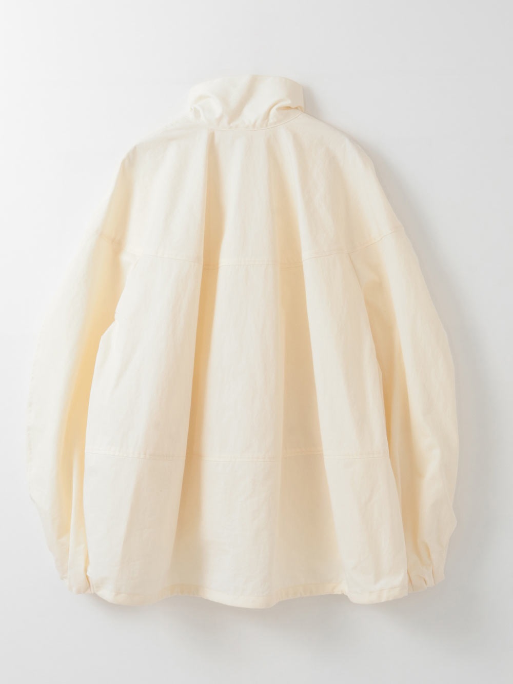 肩線で袖を切り替え、袖が前に触れるようにした構築的な1枚。