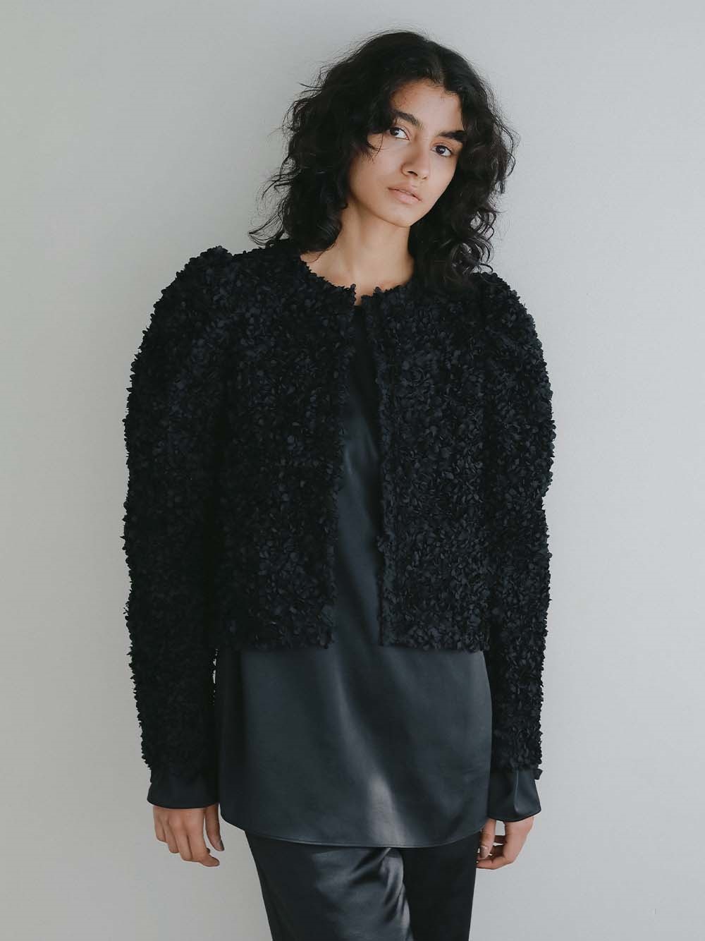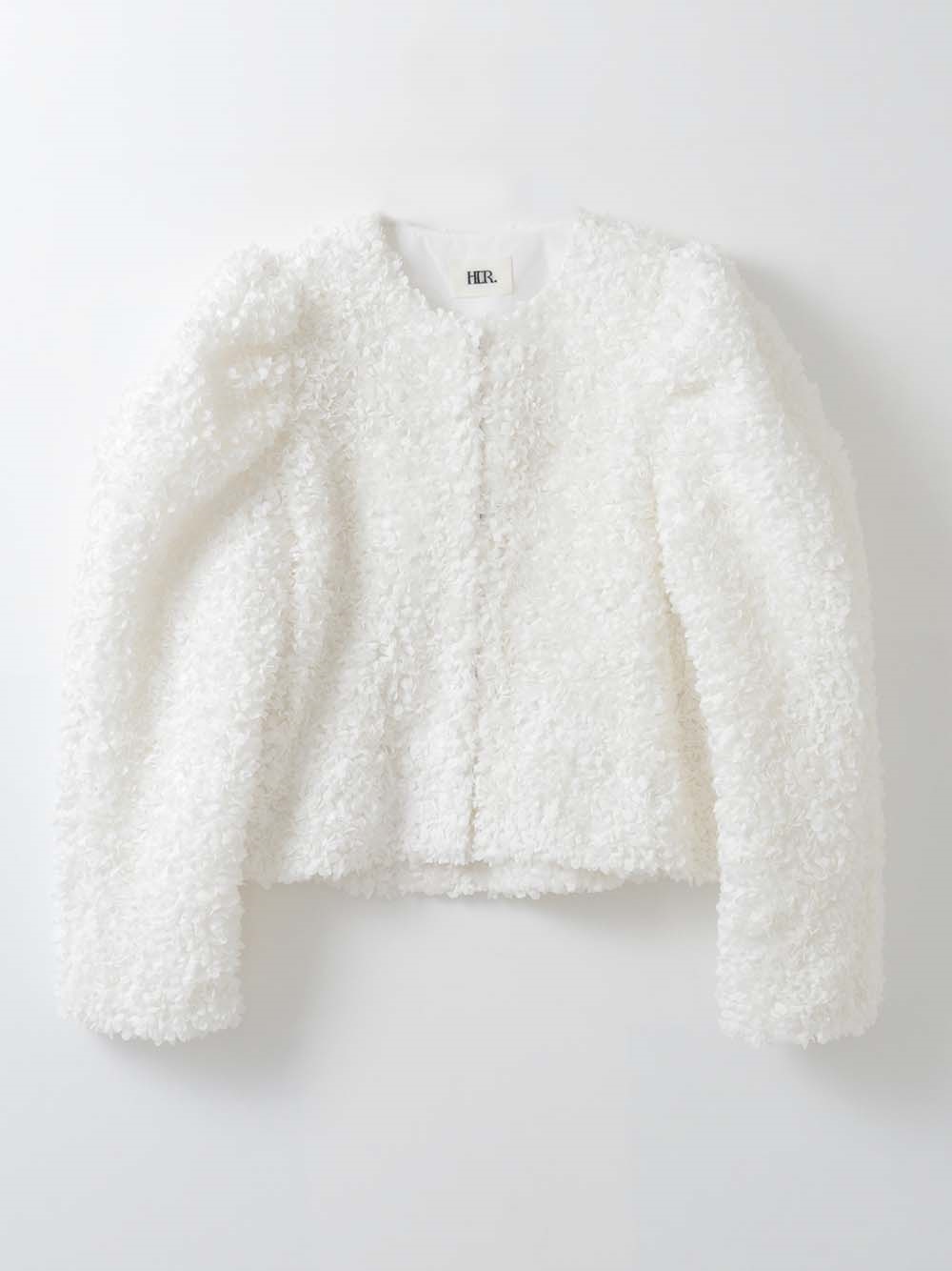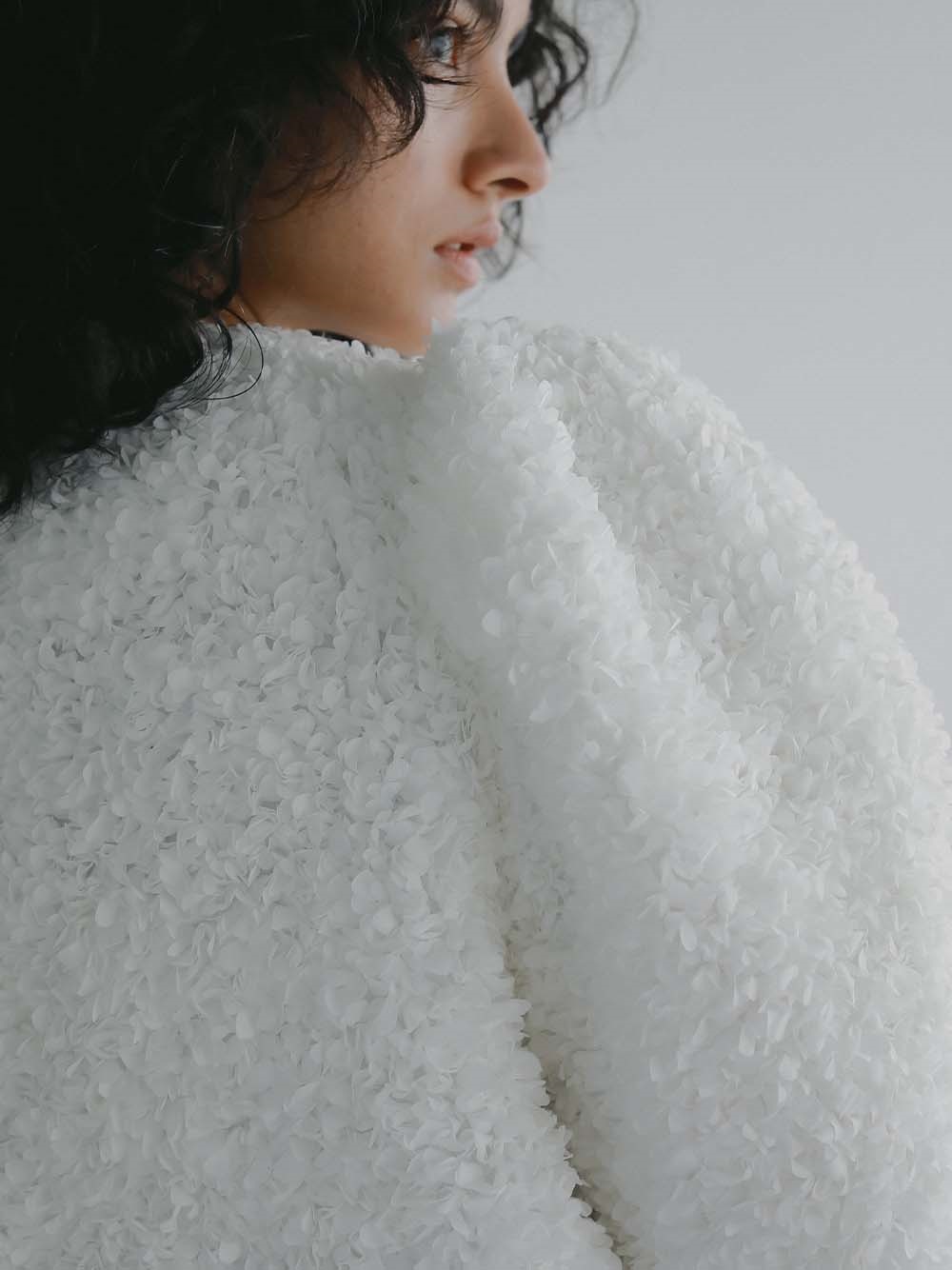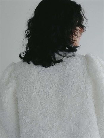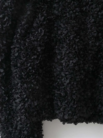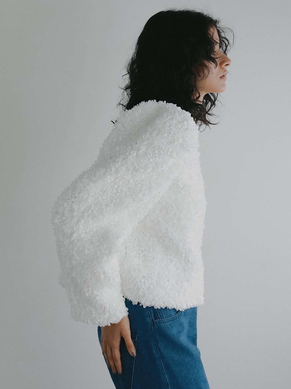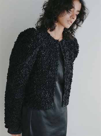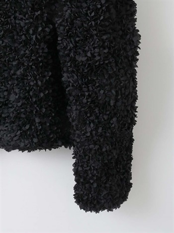 花びらを集めたような立体的なレース素材で仕立てた華やかで目をひくジャケット。