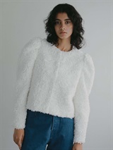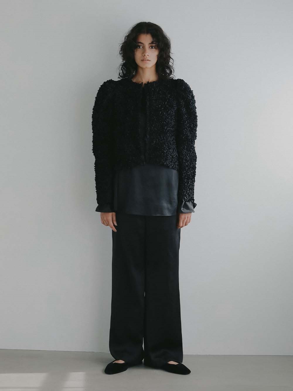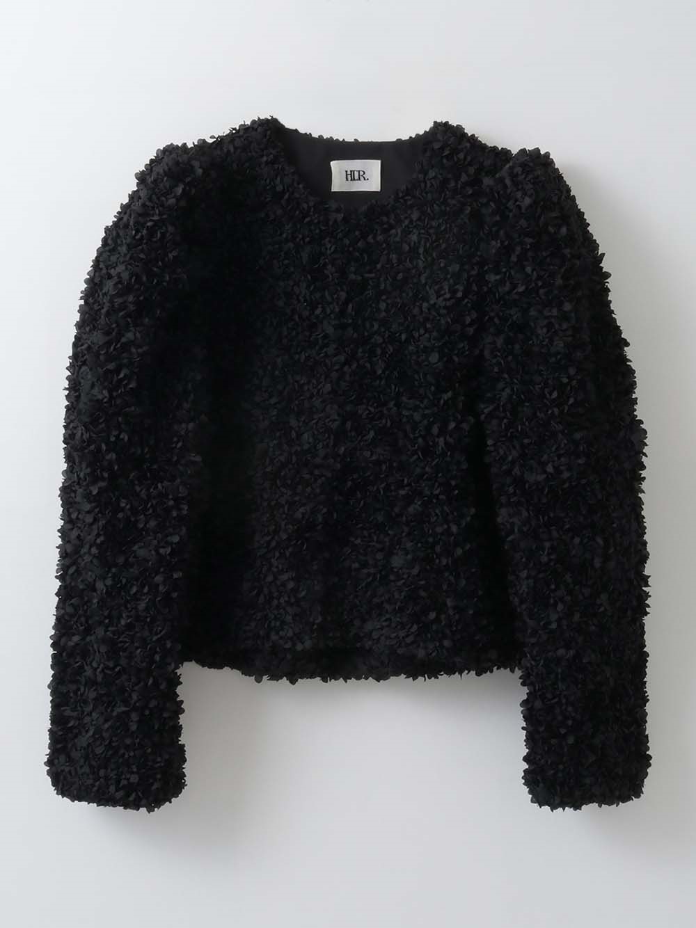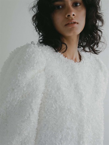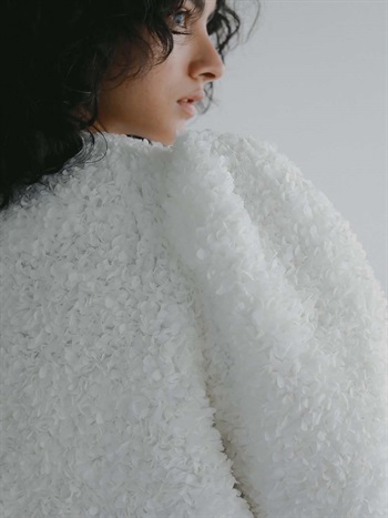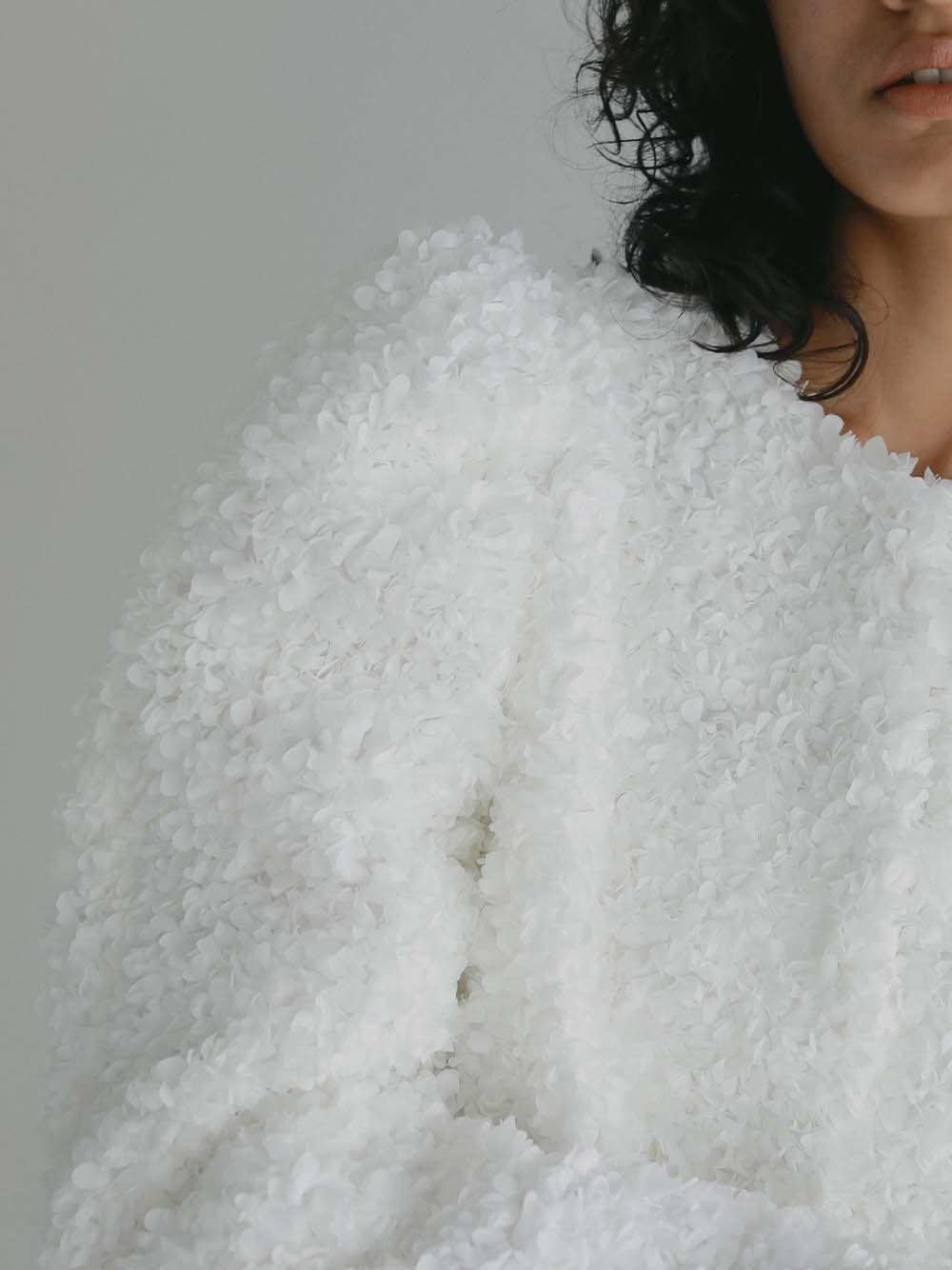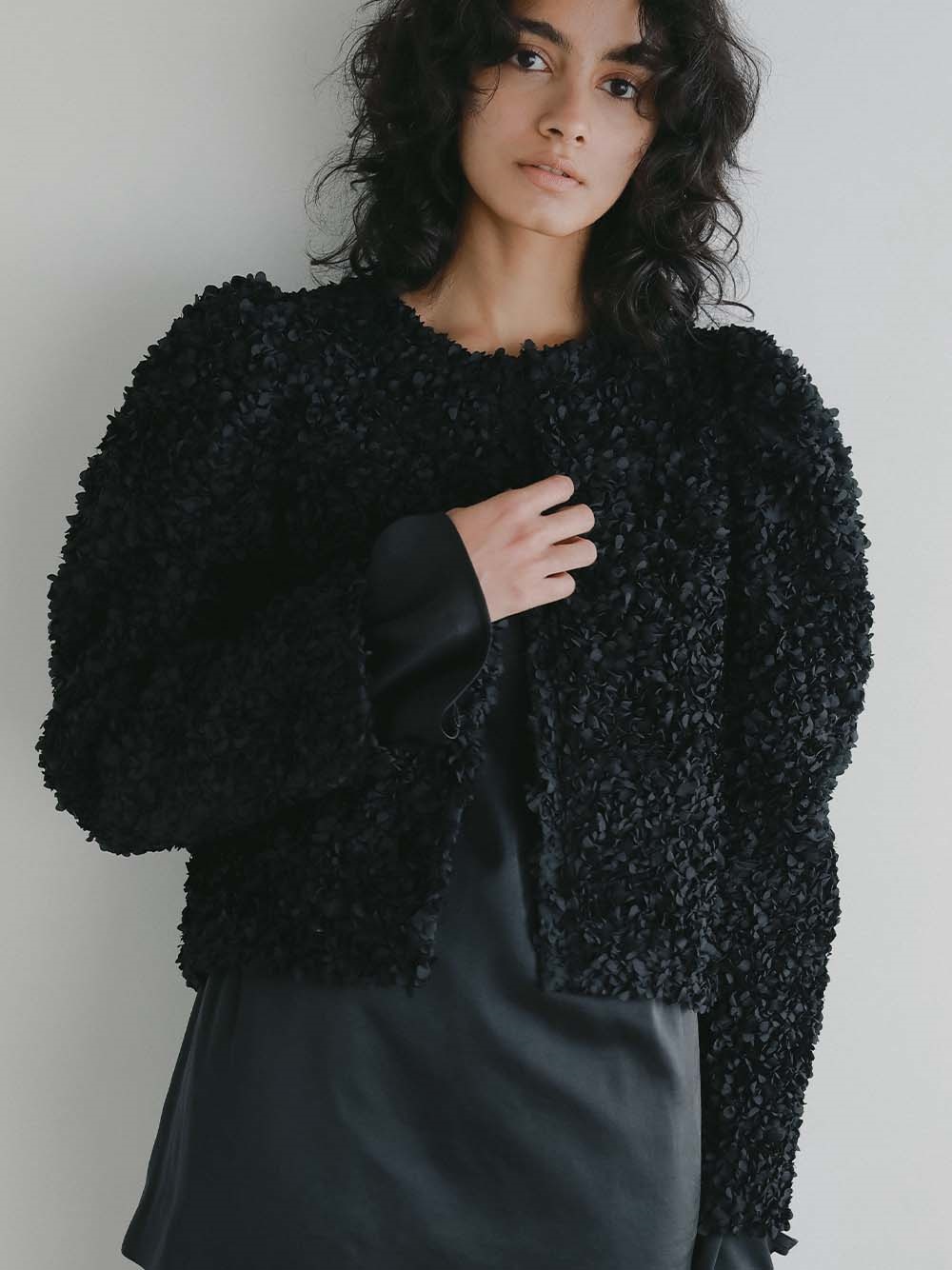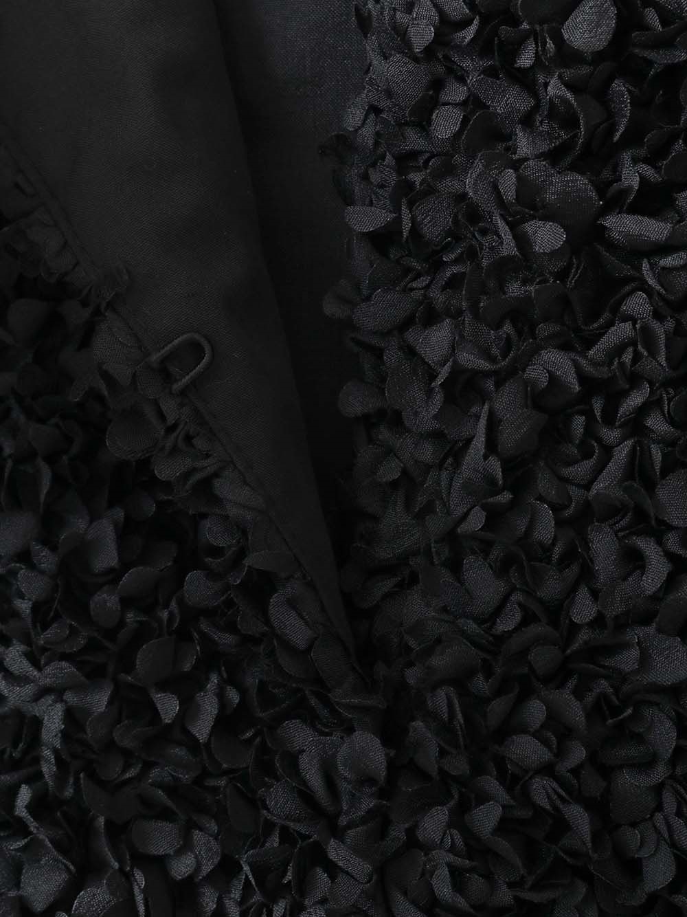 花びらを集めたような立体的なレース素材で仕立てた華やかで目をひくジャケット。
