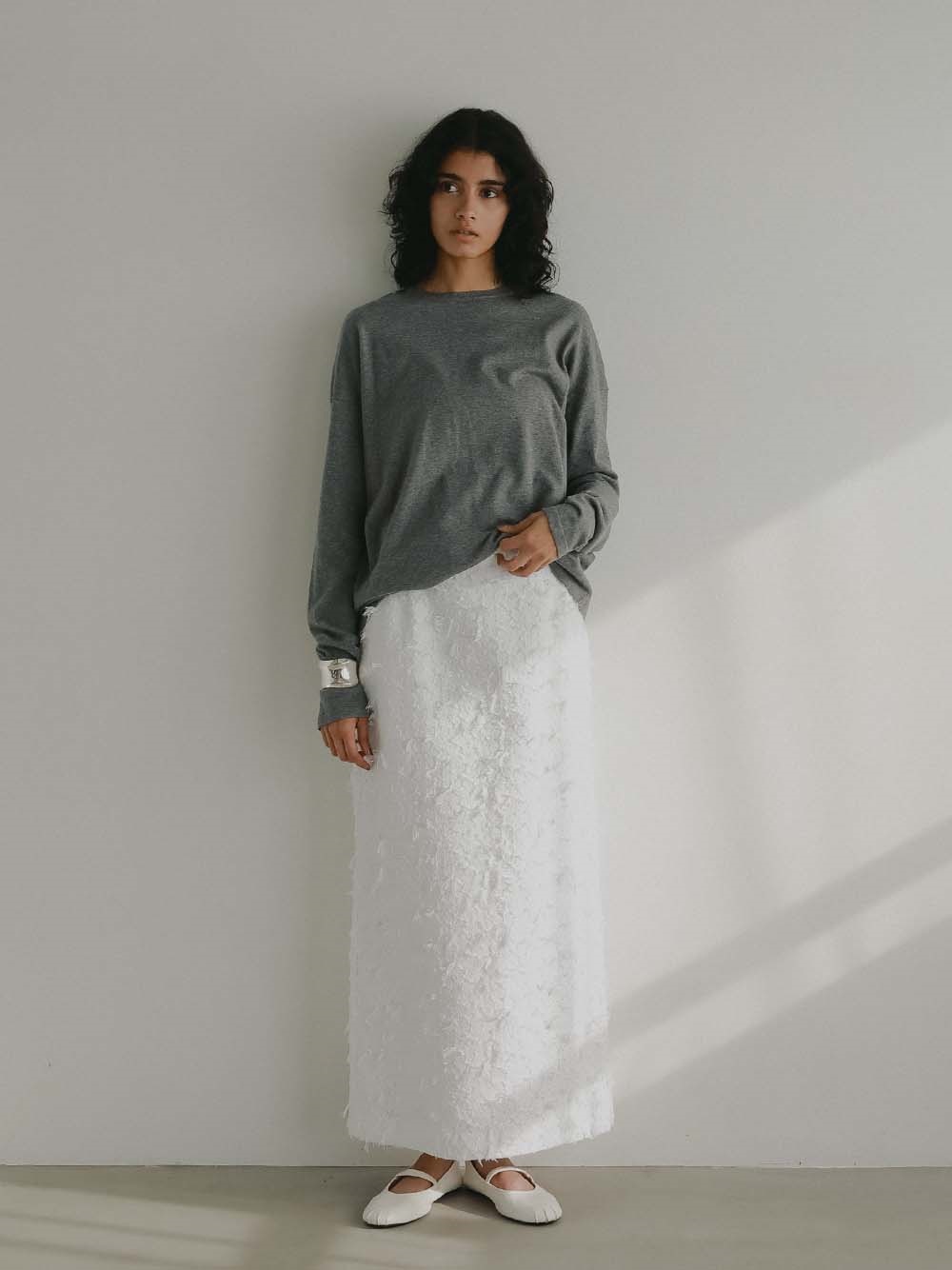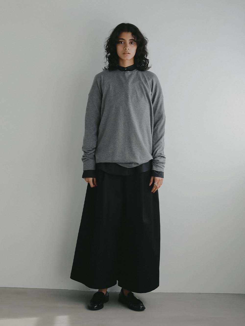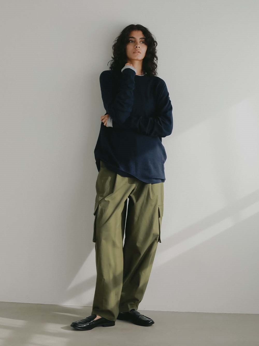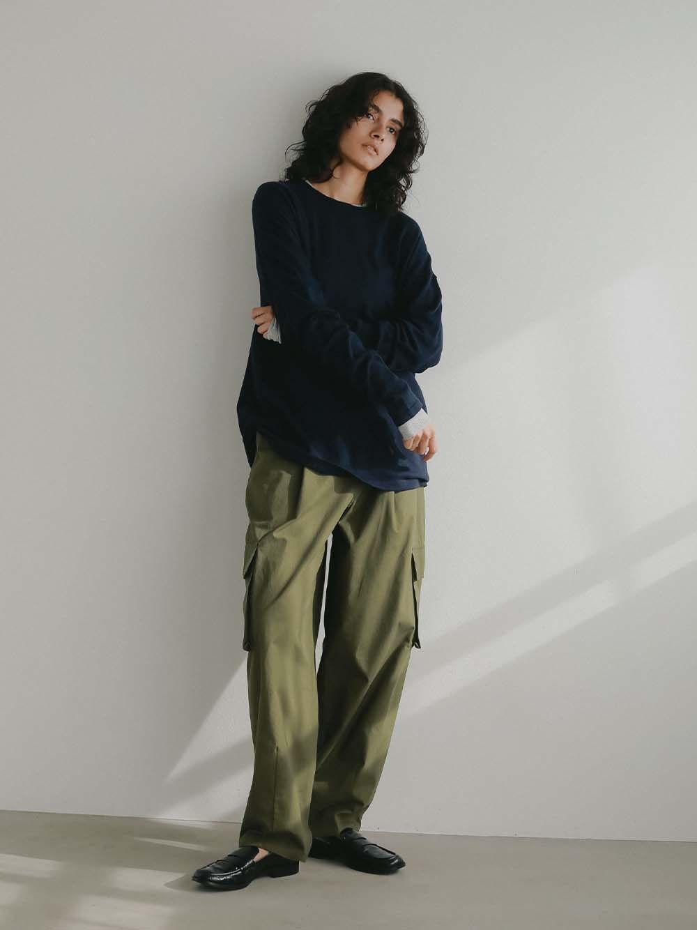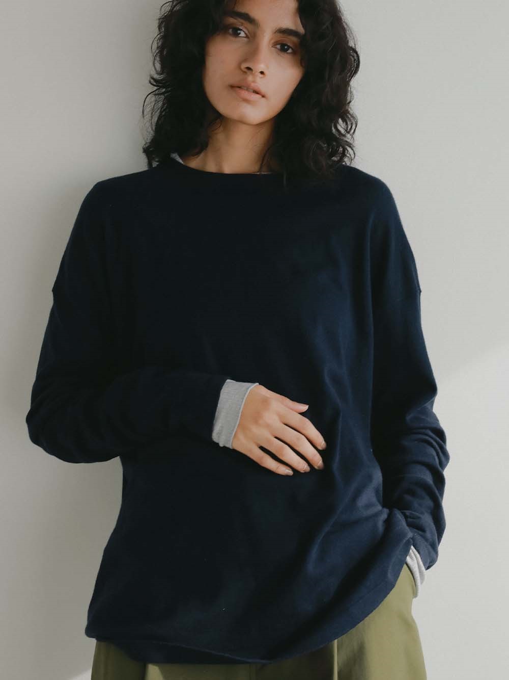 体のラインをひろいすぎないサイズ感でジャケットのインナーとしても重宝する一枚。