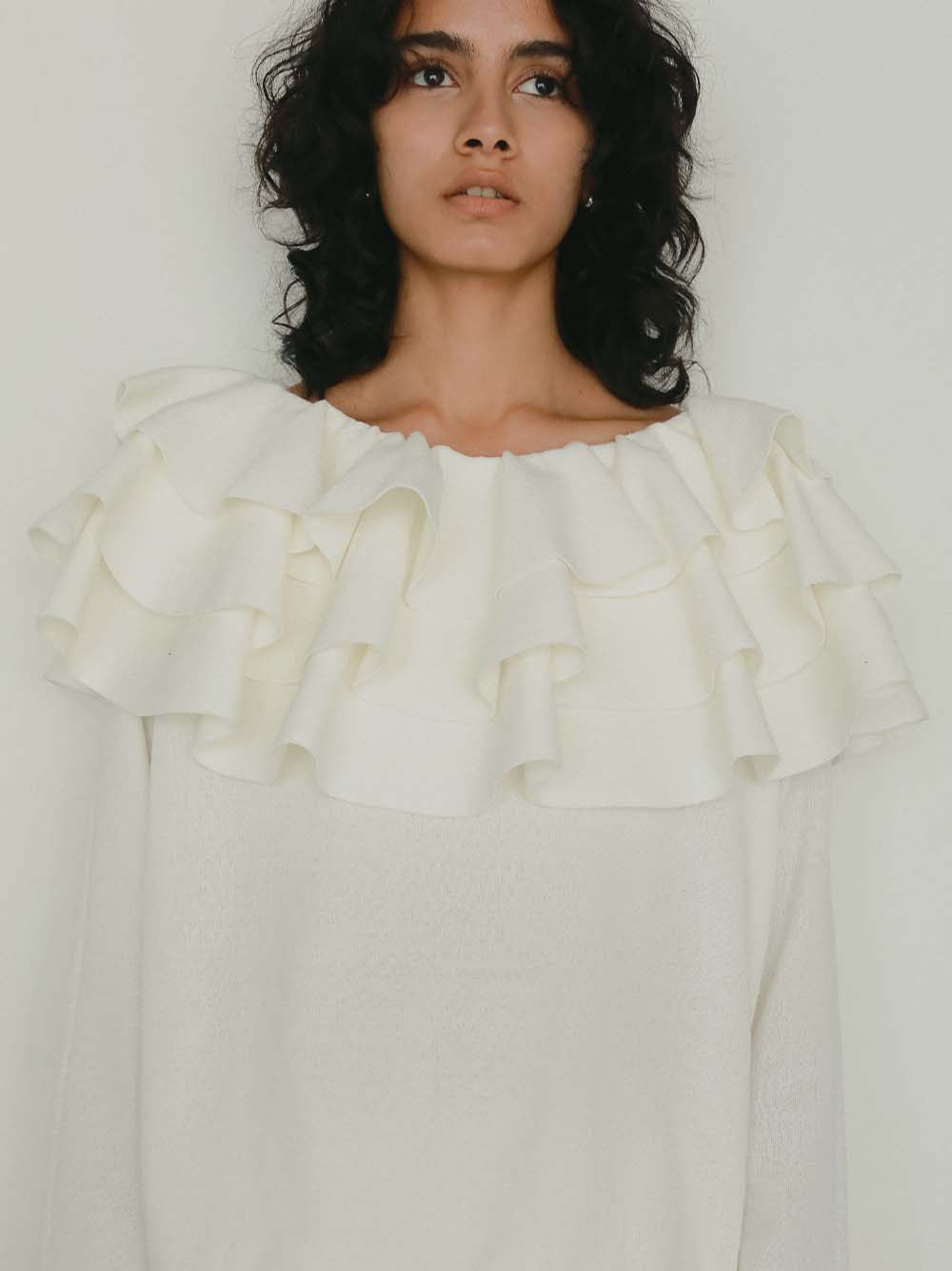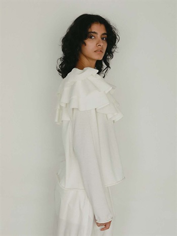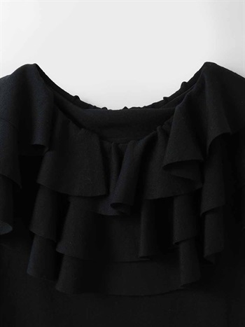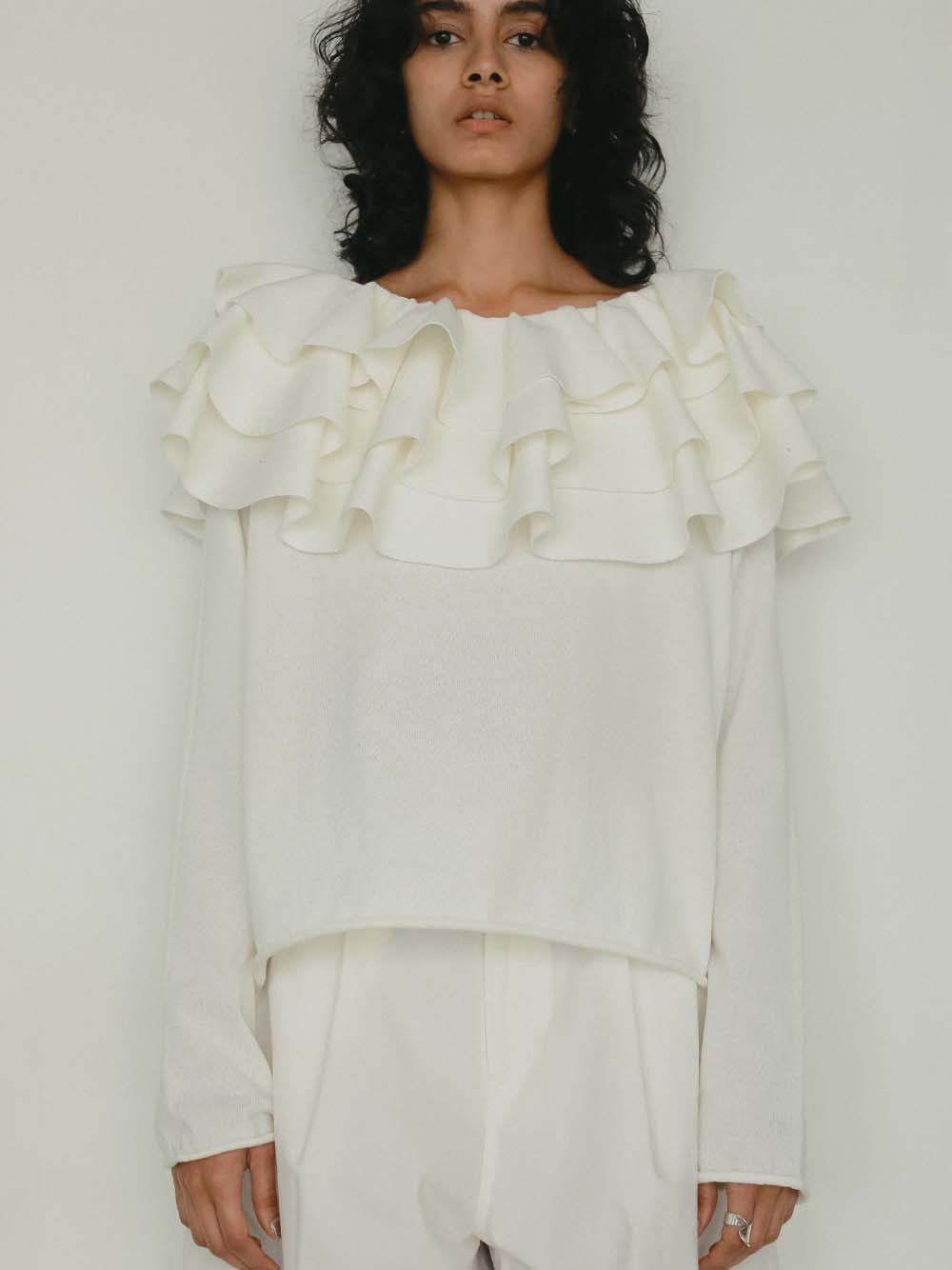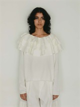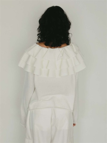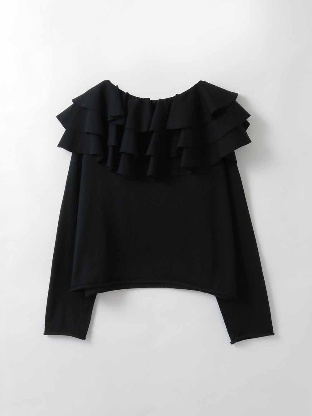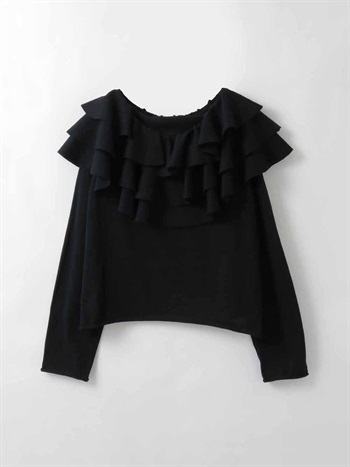 目をひく衿元のフリルが印象的なニットプルオーバー。