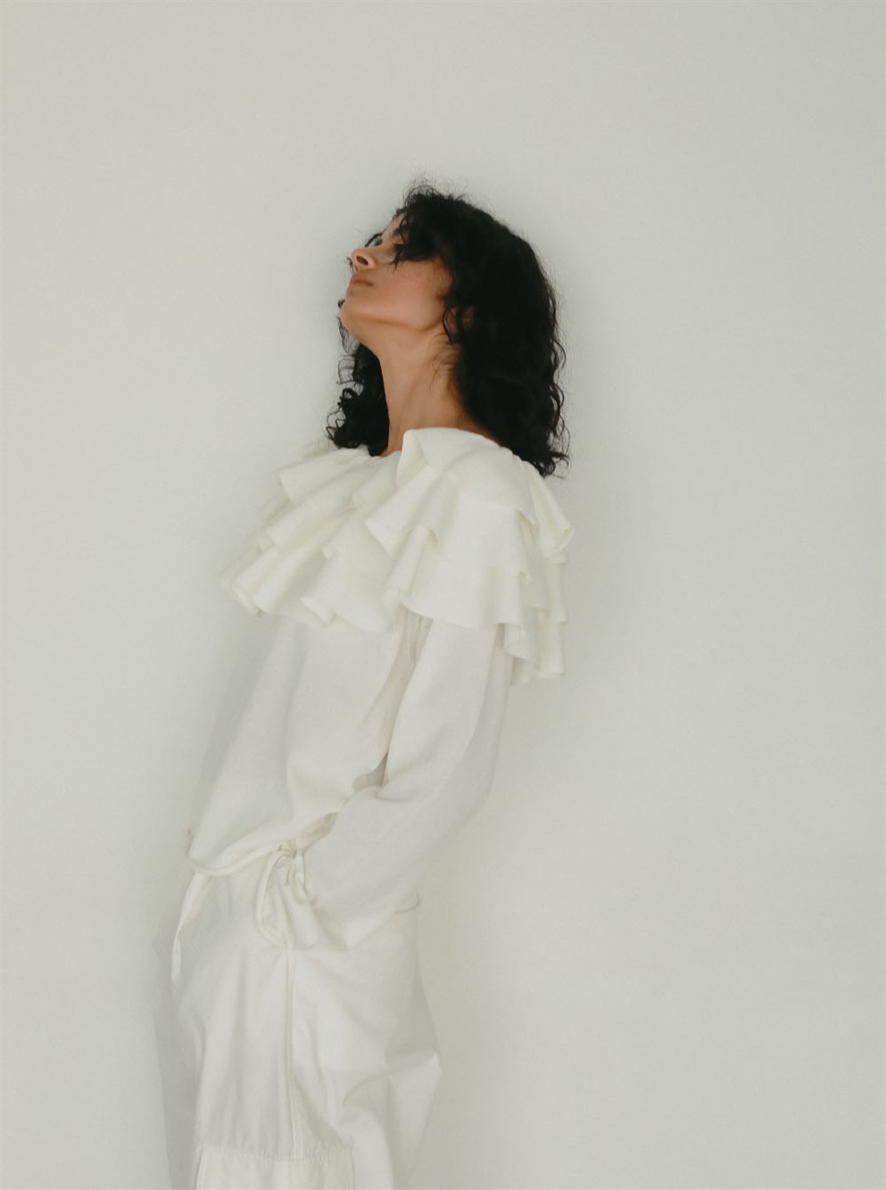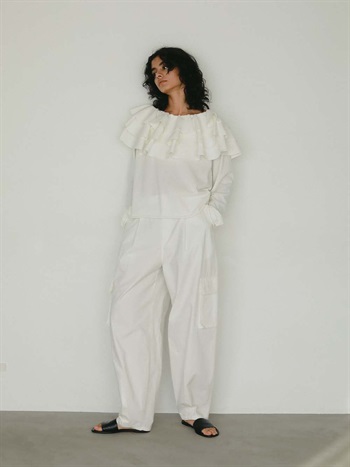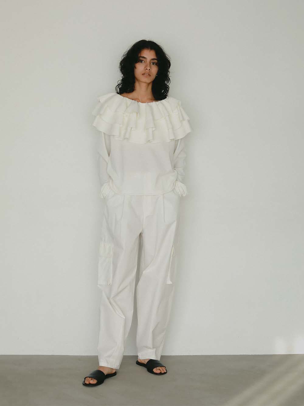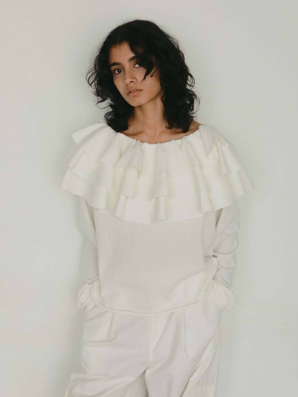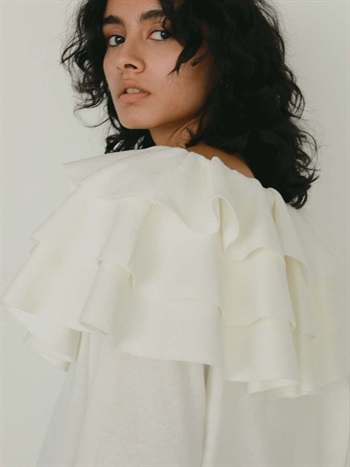 目をひく衿元のフリルが印象的なニットプルオーバー。