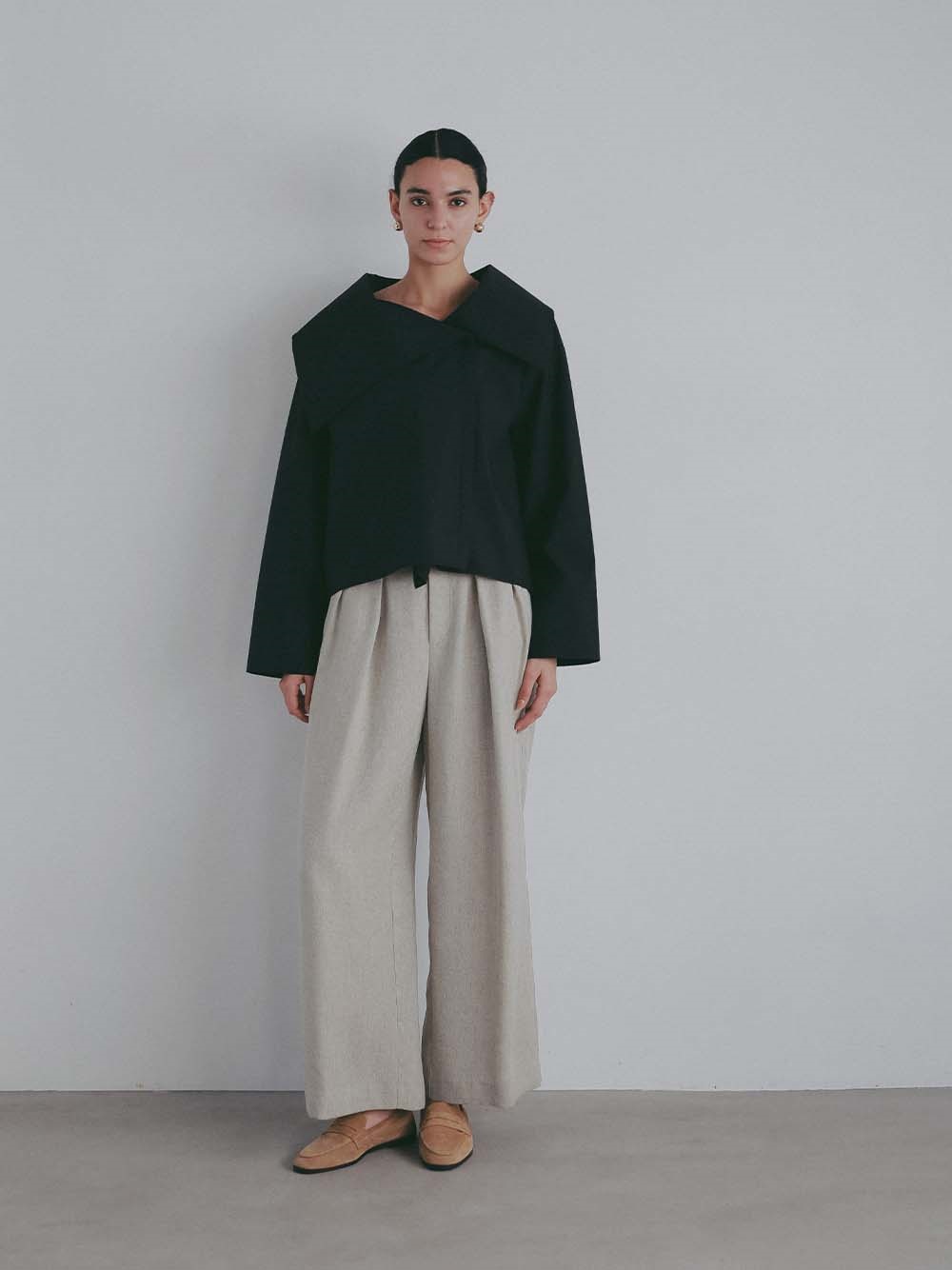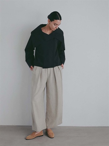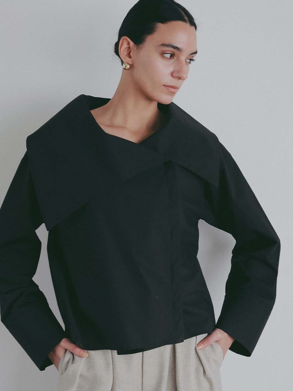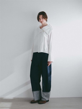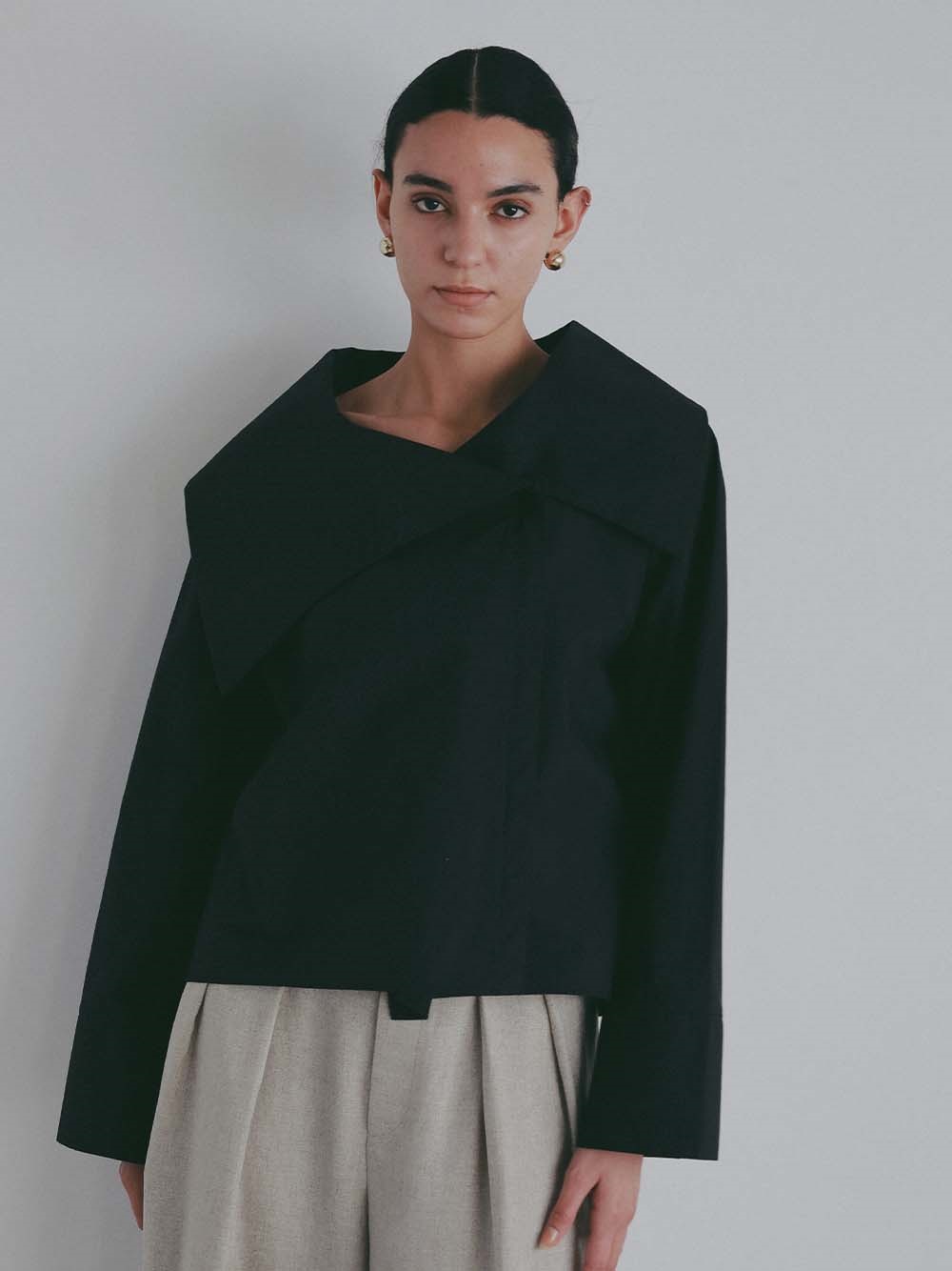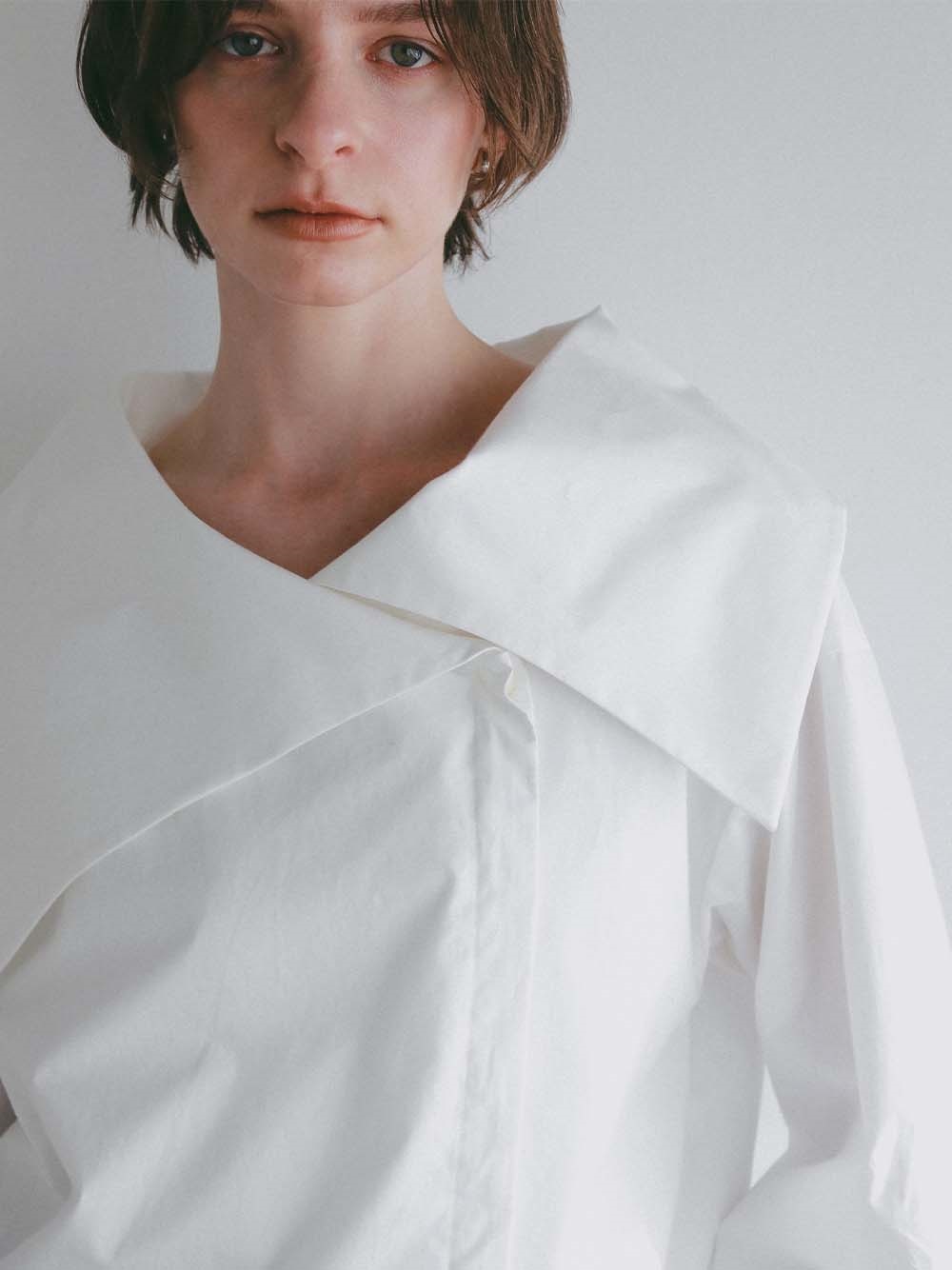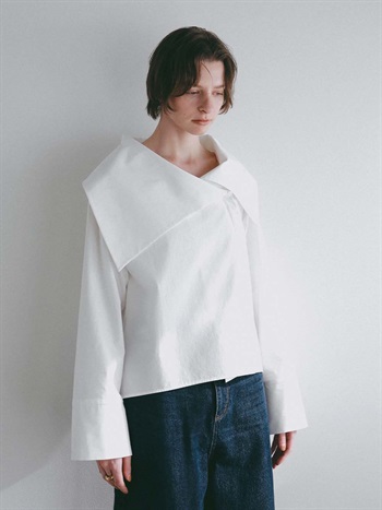 お顔回りを華やかに演出するアシンメトリーデザインの大きな衿が印象的なブラウス。