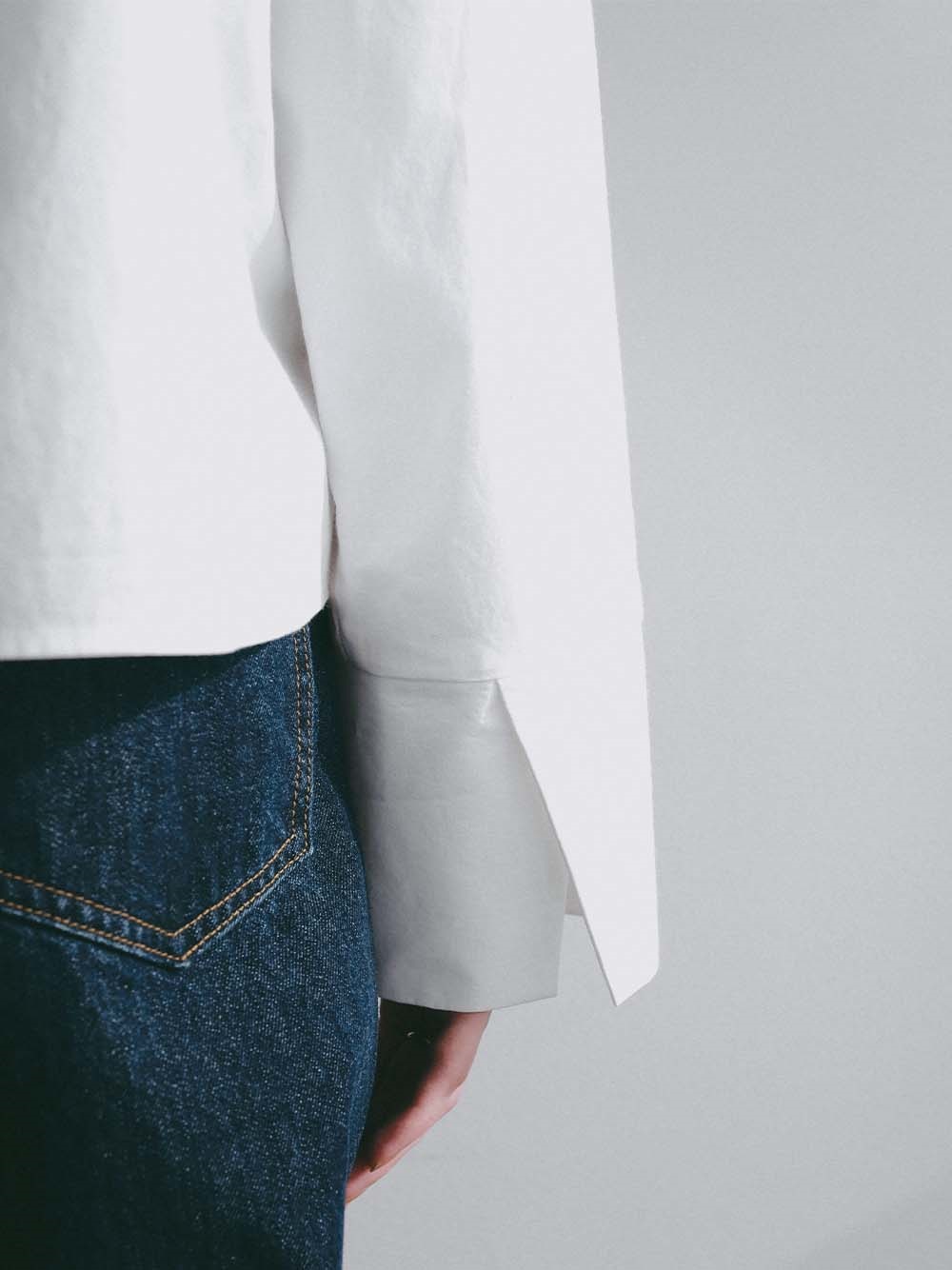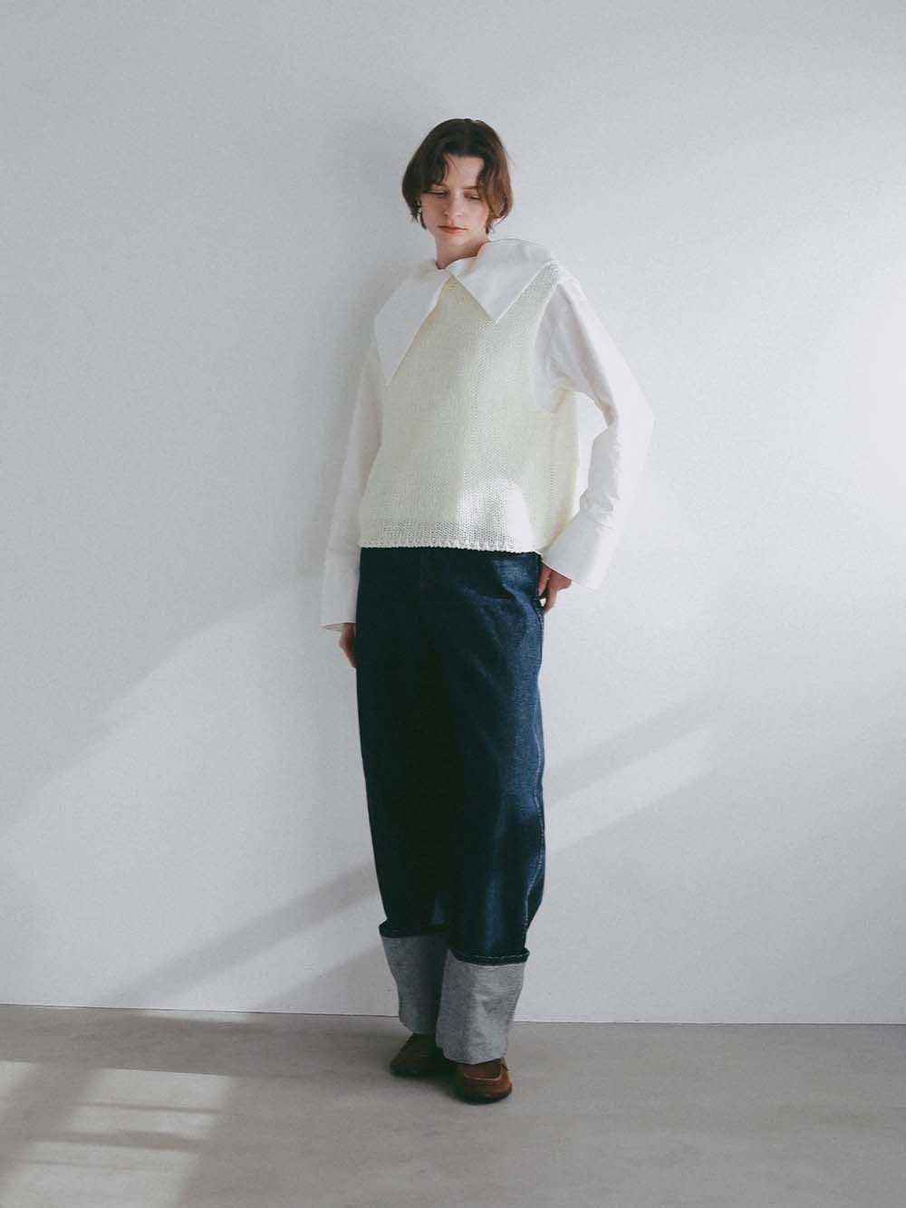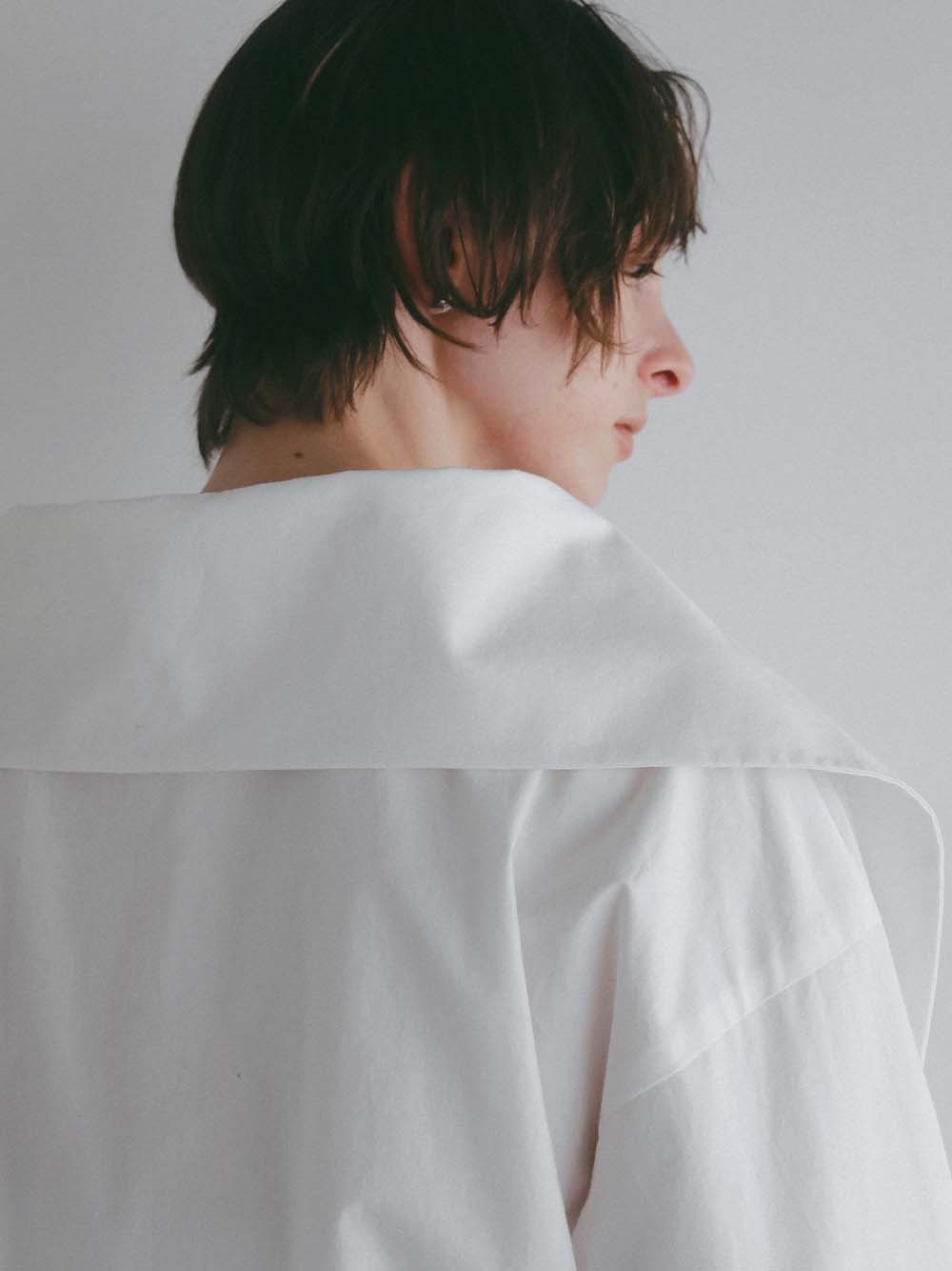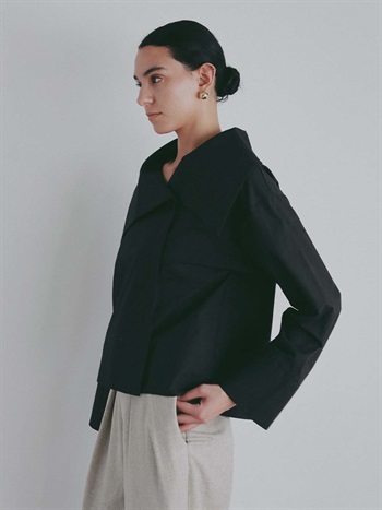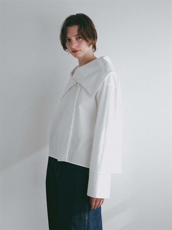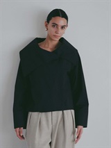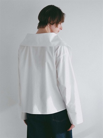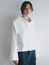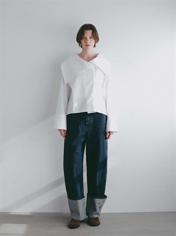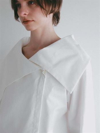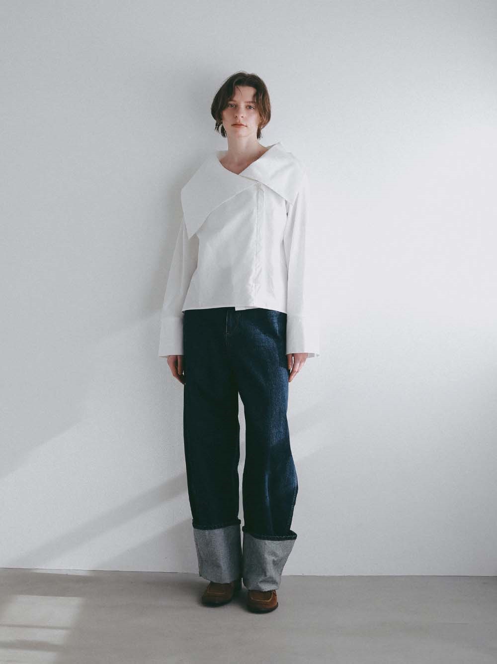 お顔回りを華やかに演出するアシンメトリーデザインの大きな衿が印象的なブラウス。