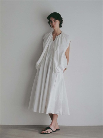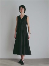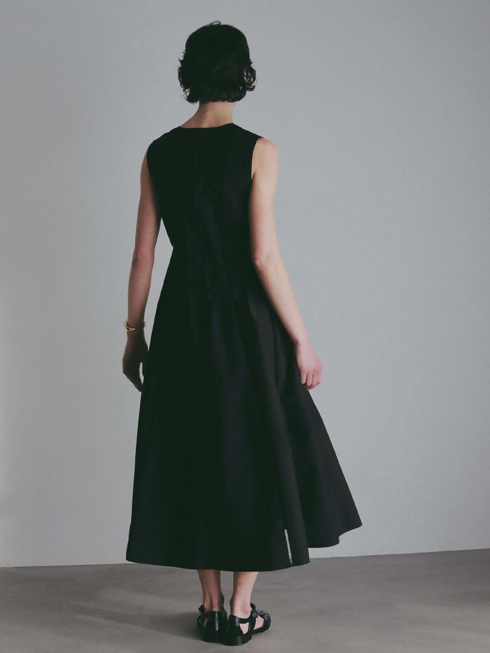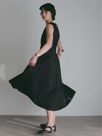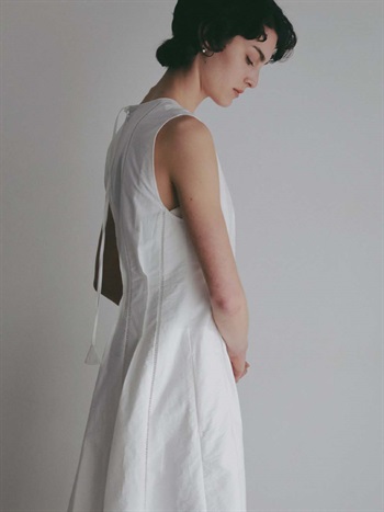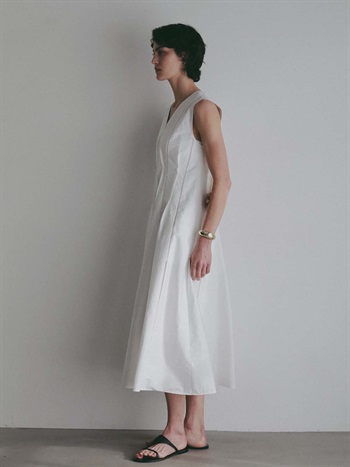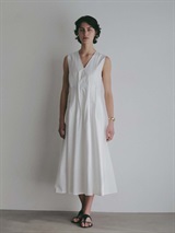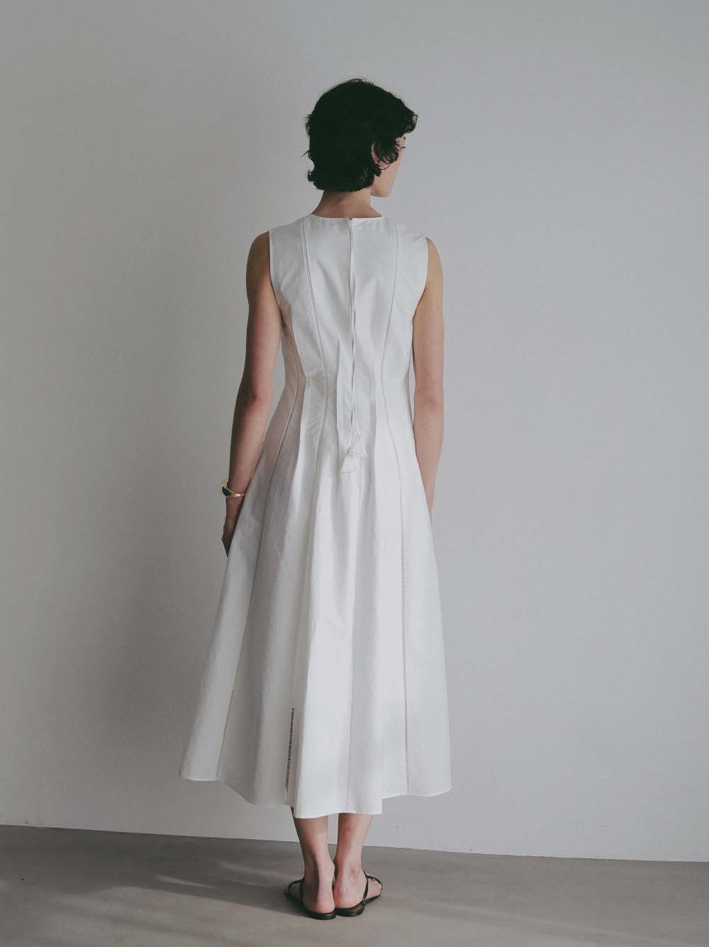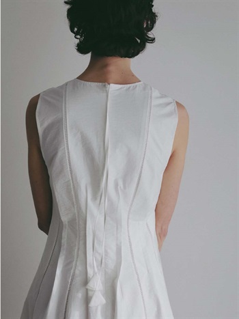 ウエストのタックとハシゴレースが印象的なノースリーブワンピース。