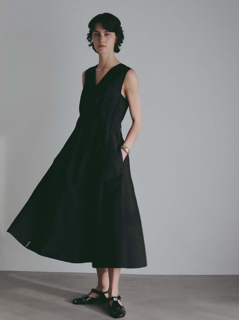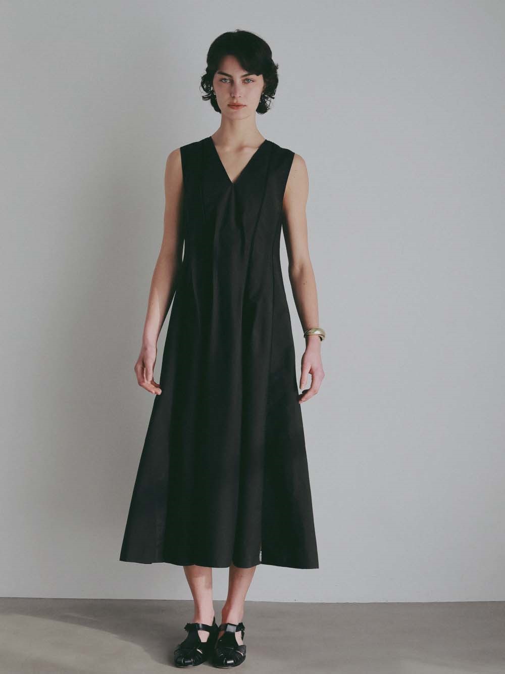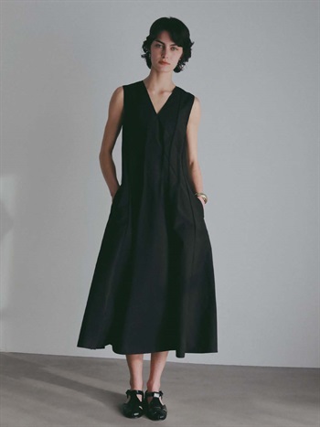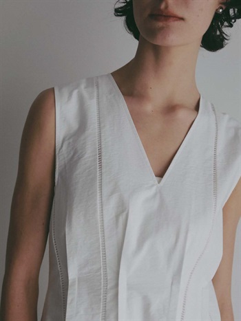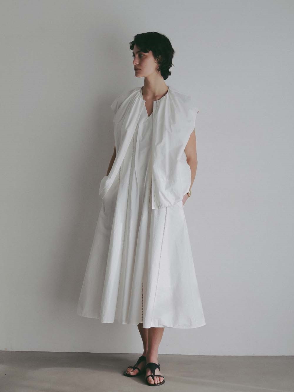 ウエストのタックとハシゴレースが印象的なノースリーブワンピース。