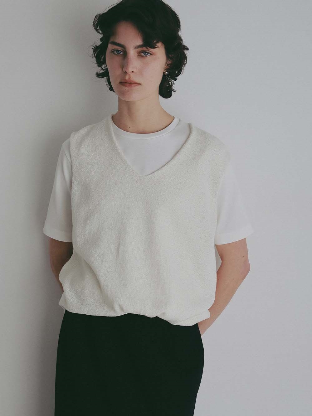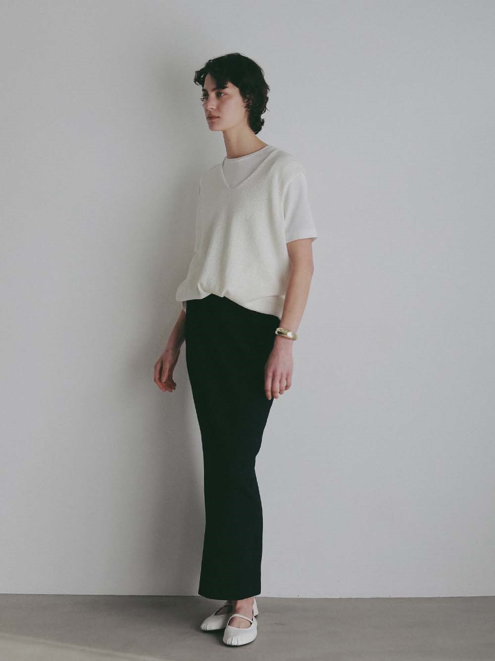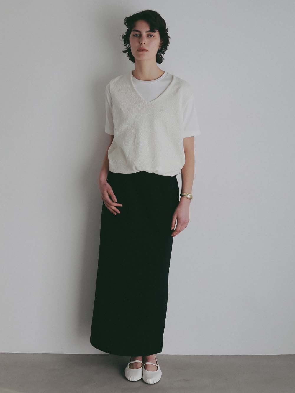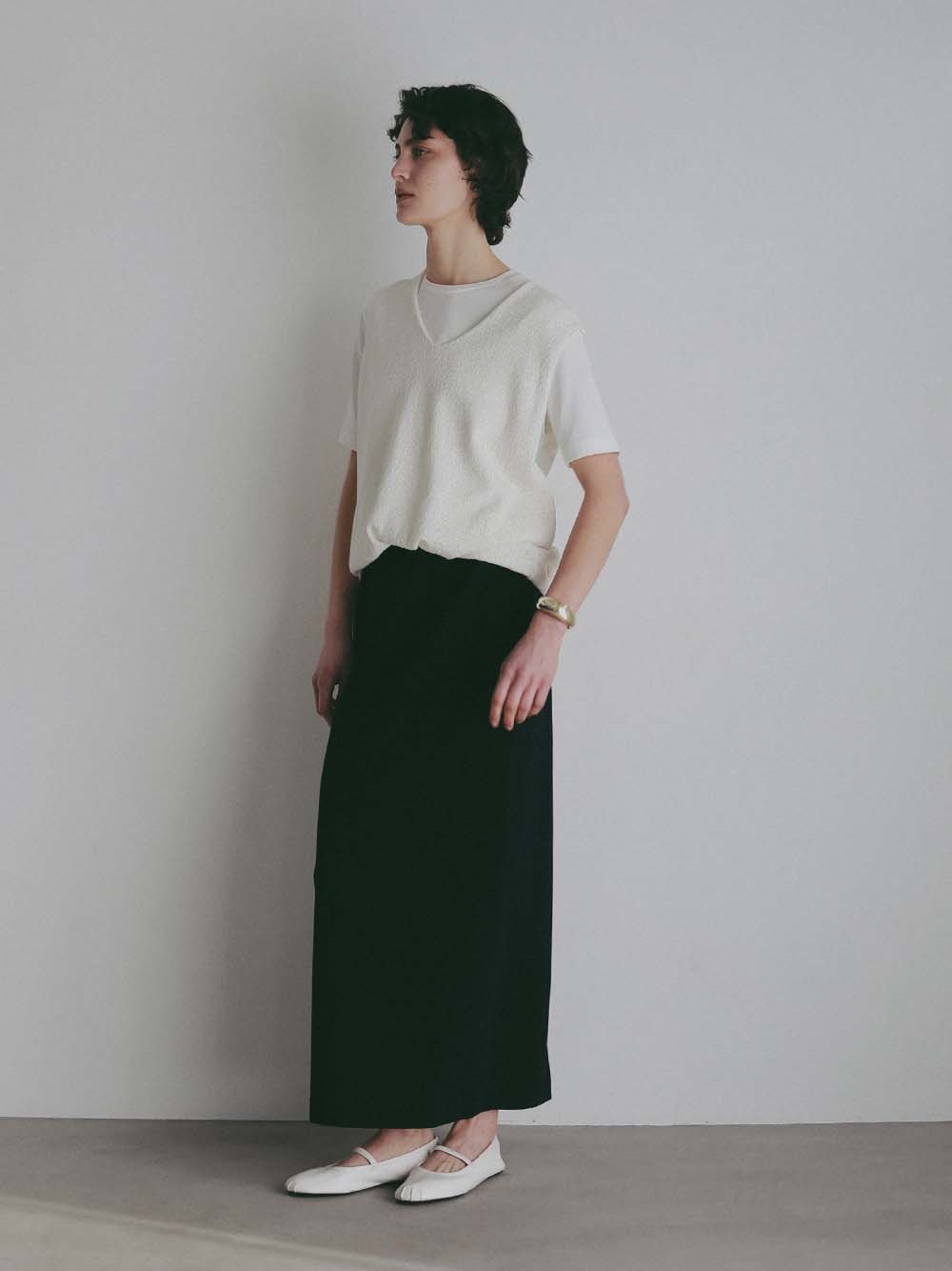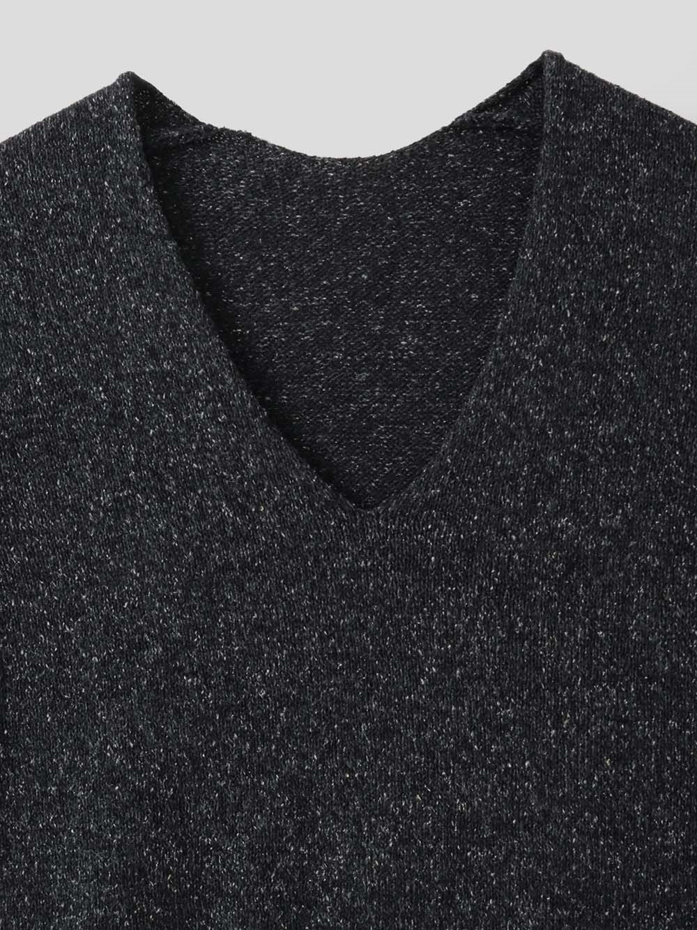 深めのVネックは顔周りをすっきり見せてくれます。