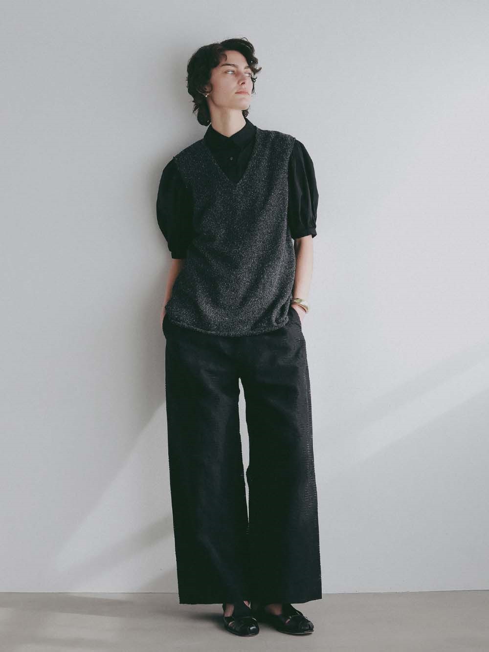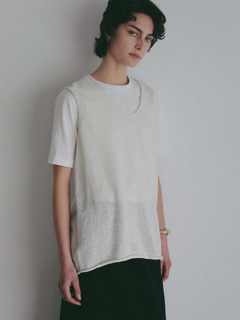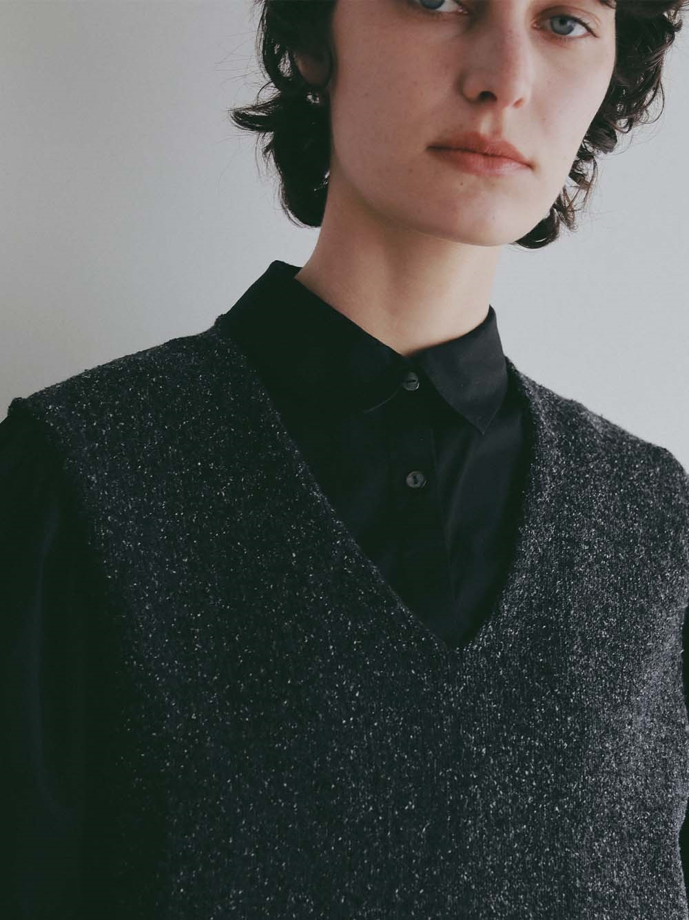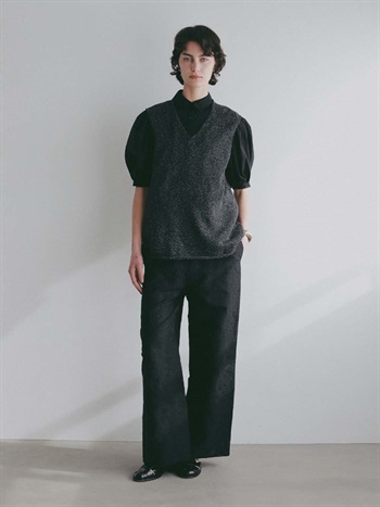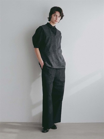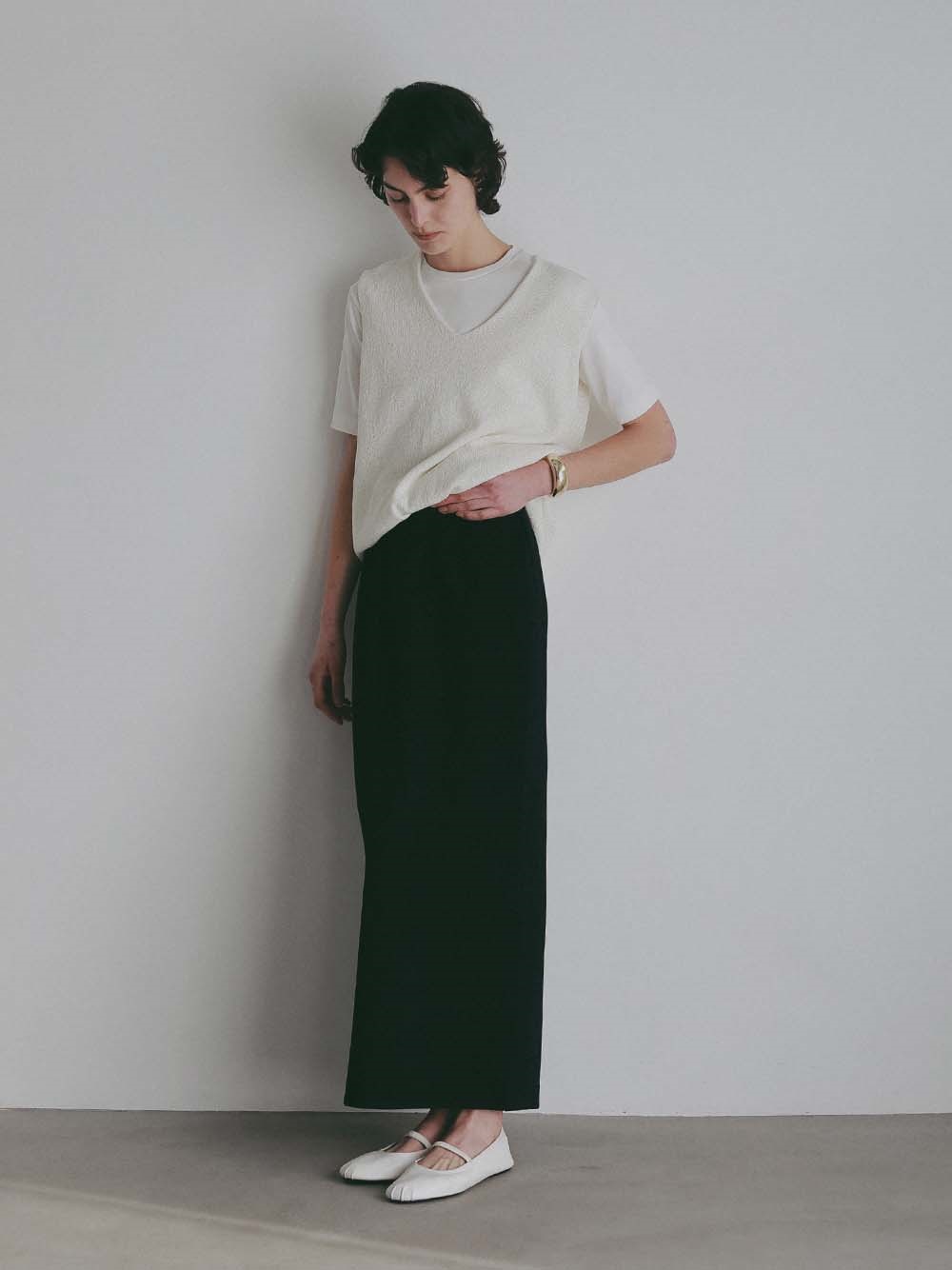 深めのVネックは顔周りをすっきり見せてくれます。