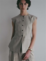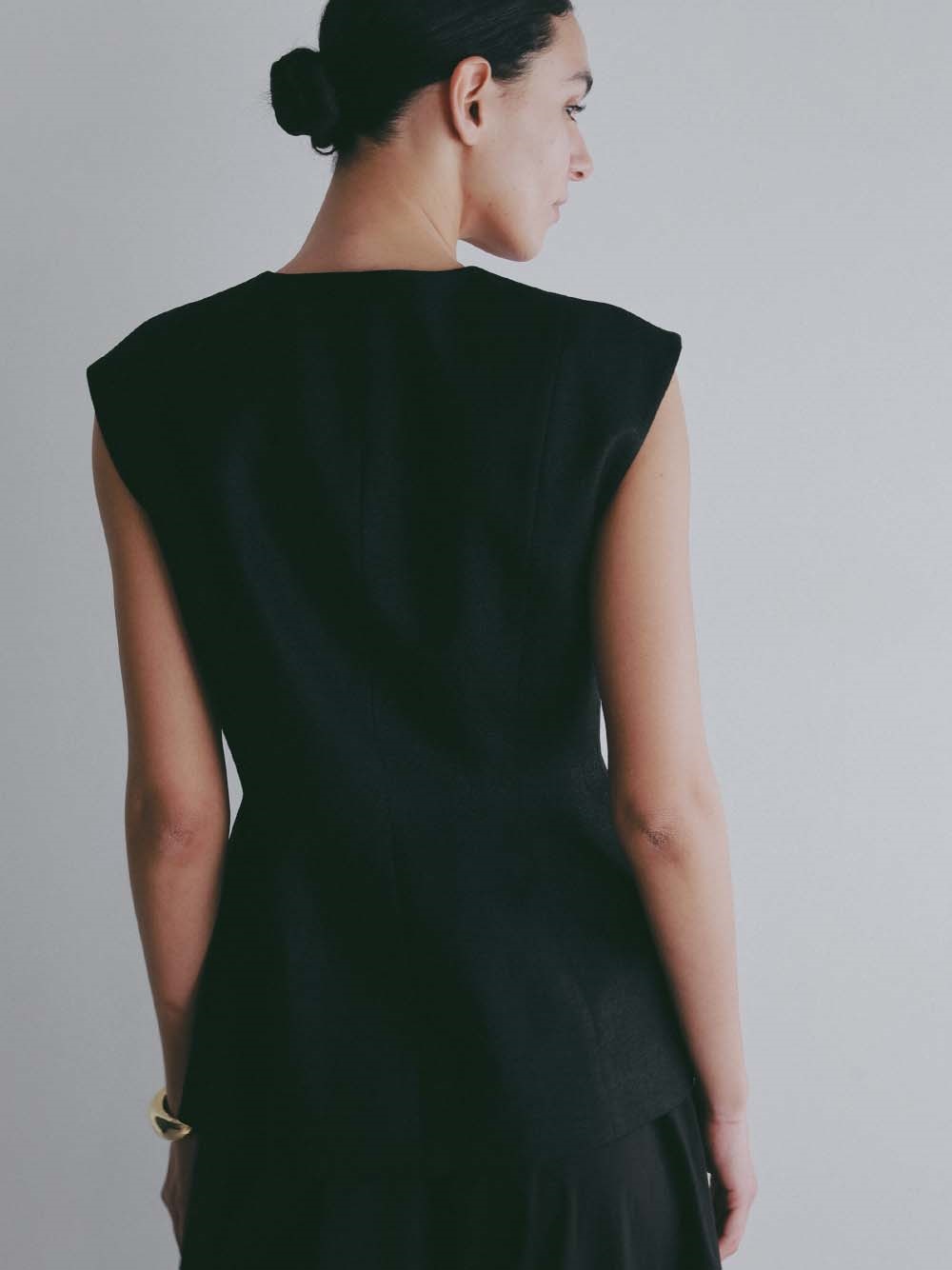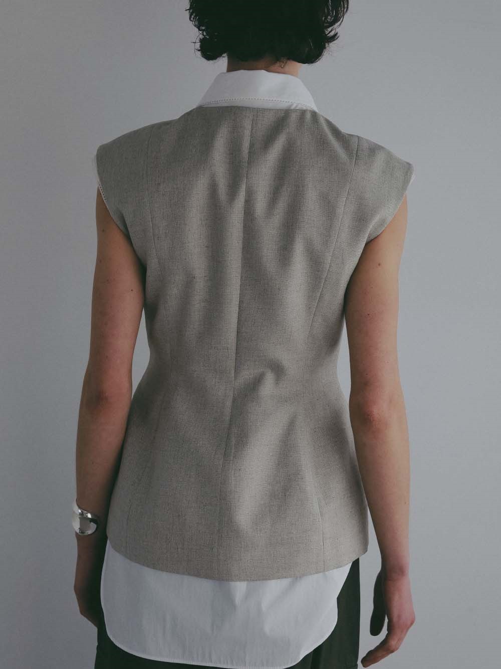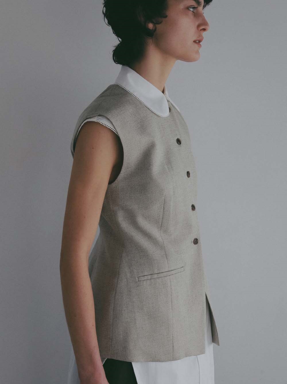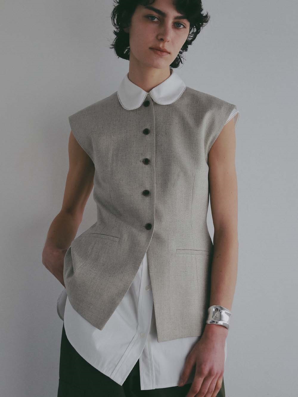 ウエストシェイプされたペプラムデザインが特徴的なリネンライク素材のベスト。