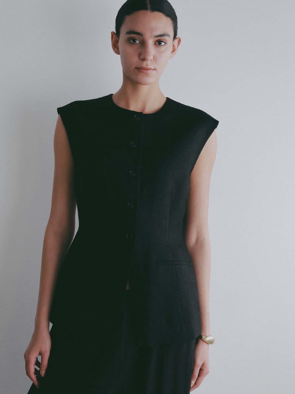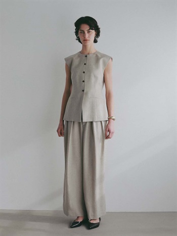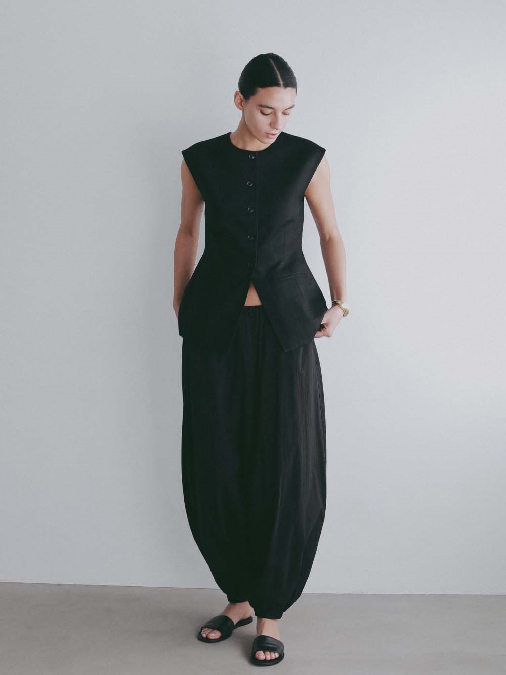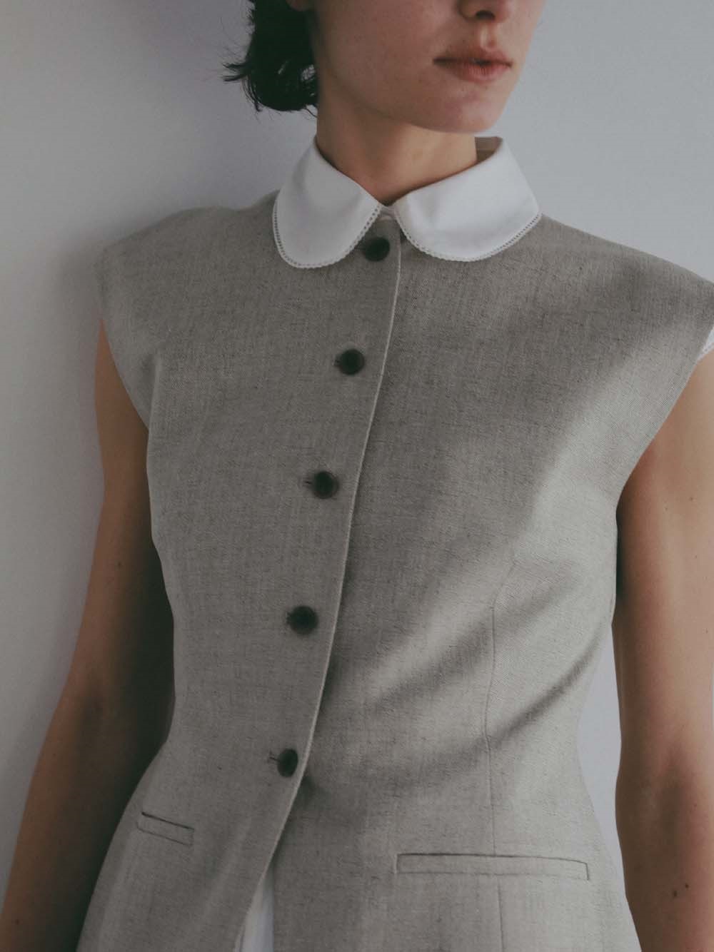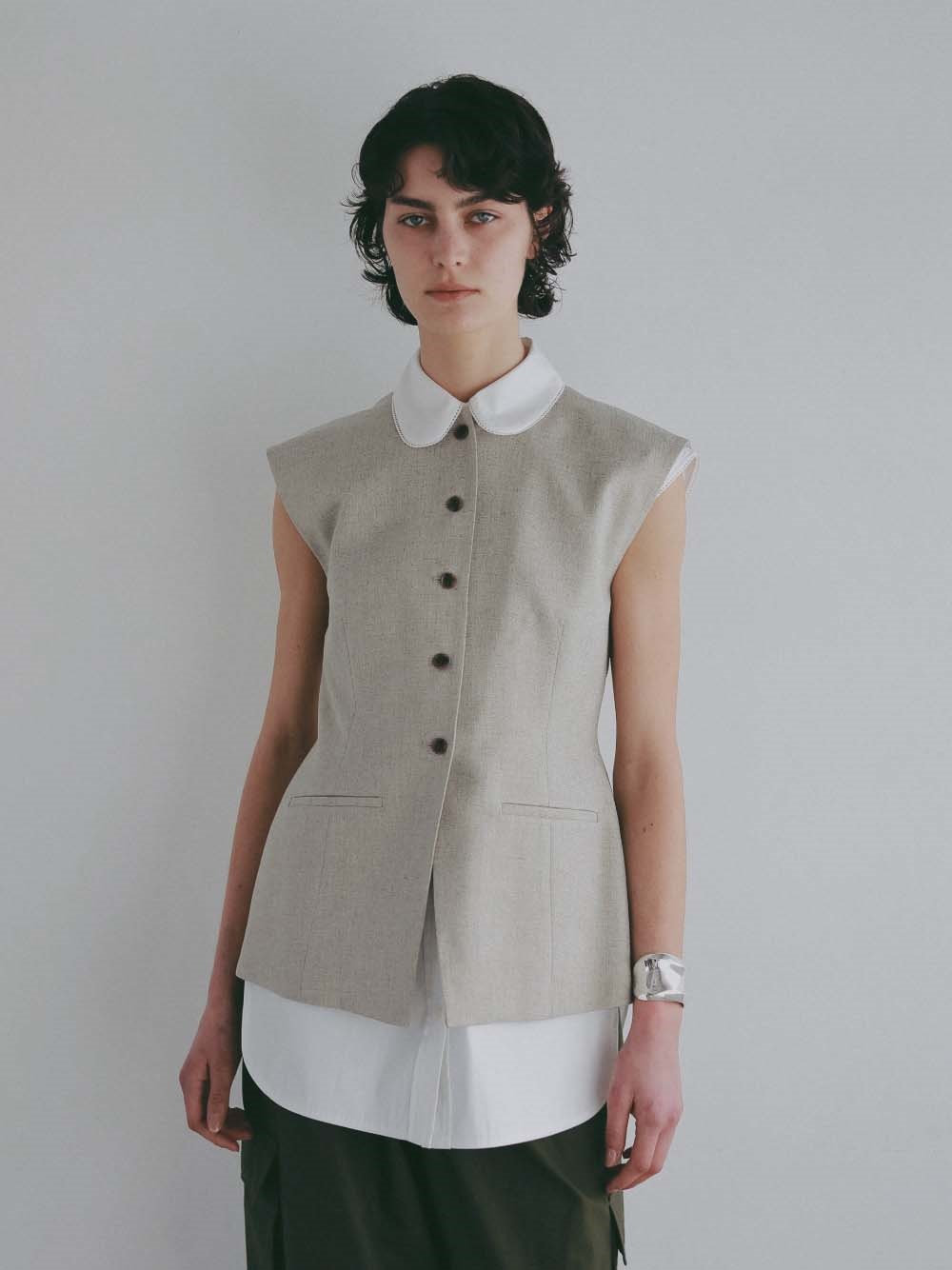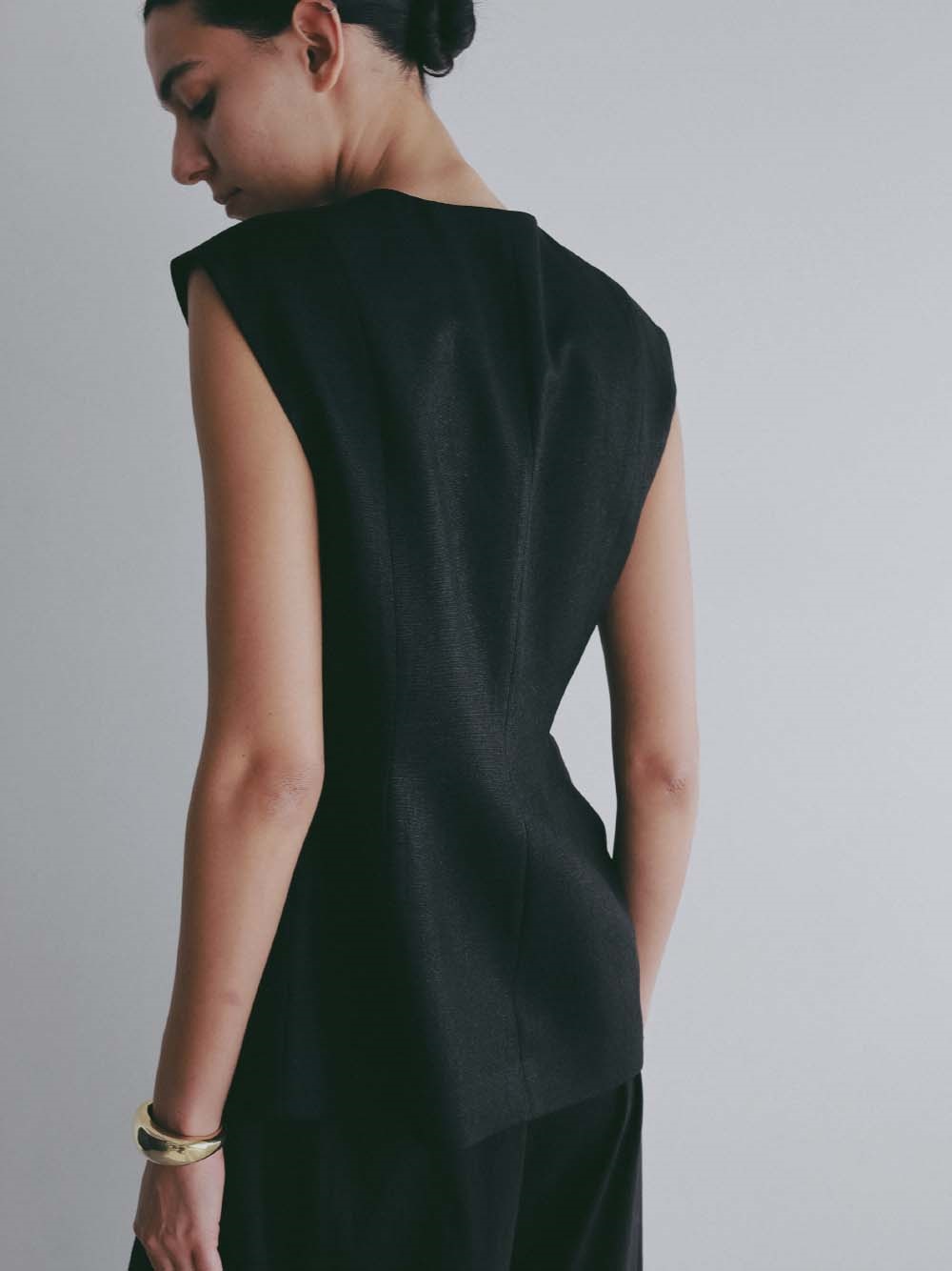 ウエストシェイプされたペプラムデザインが特徴的なリネンライク素材のベスト。