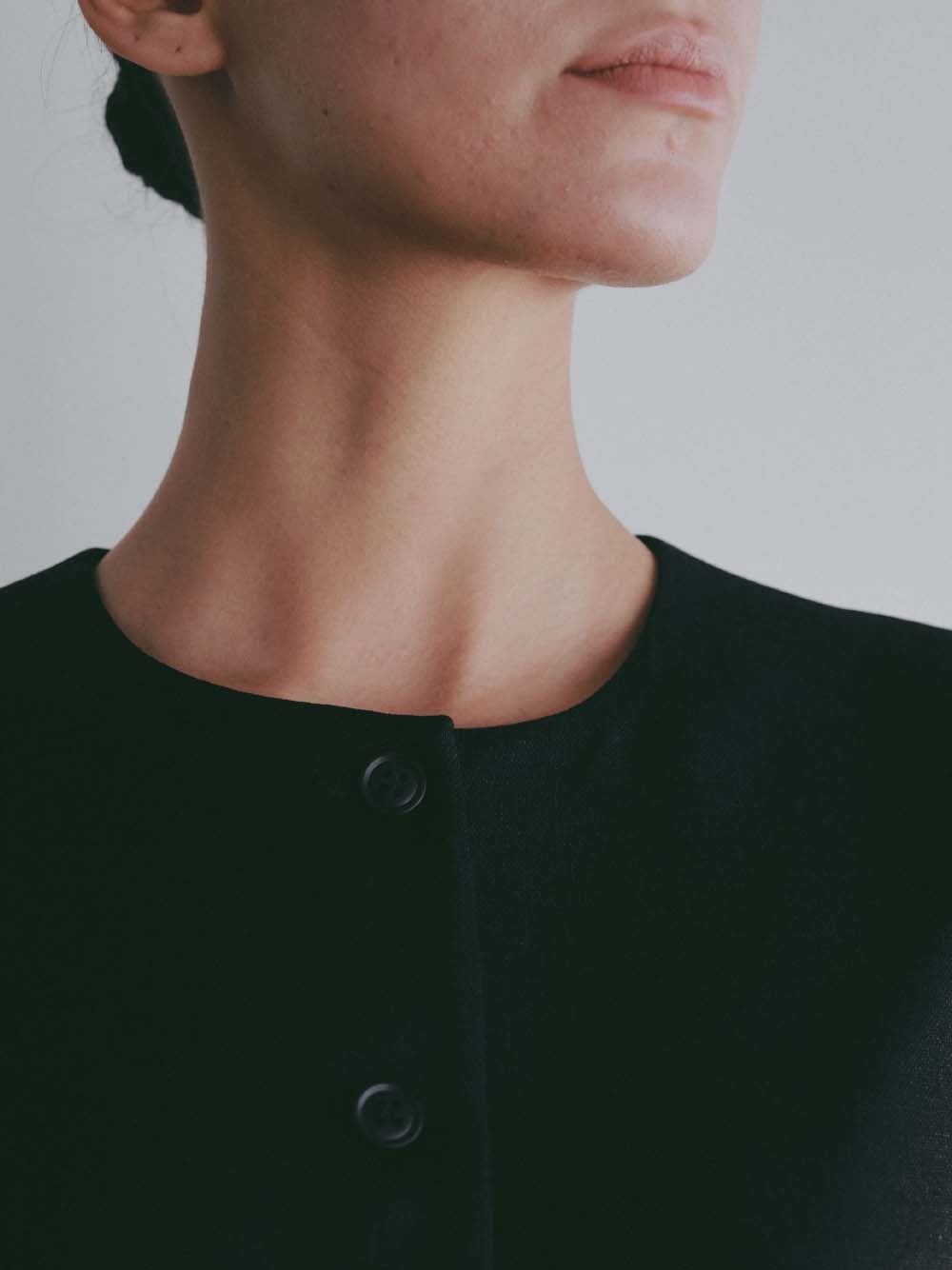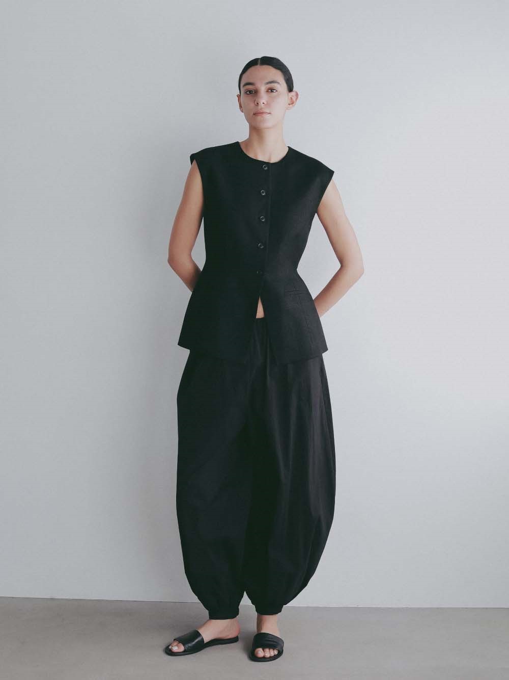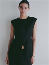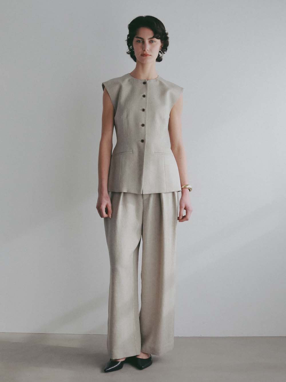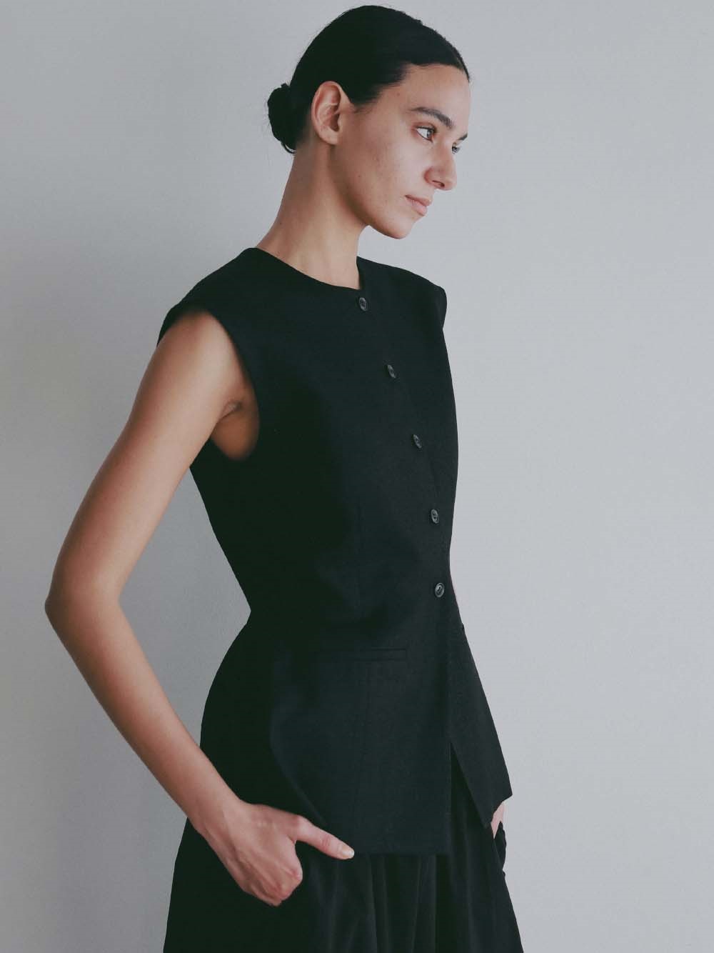 ウエストシェイプされたペプラムデザインが特徴的なリネンライク素材のベスト。