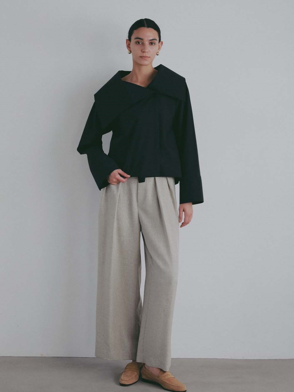 タックをとることでウエスト周りをすっきりとみせてくれスタイルアップもアシスト。