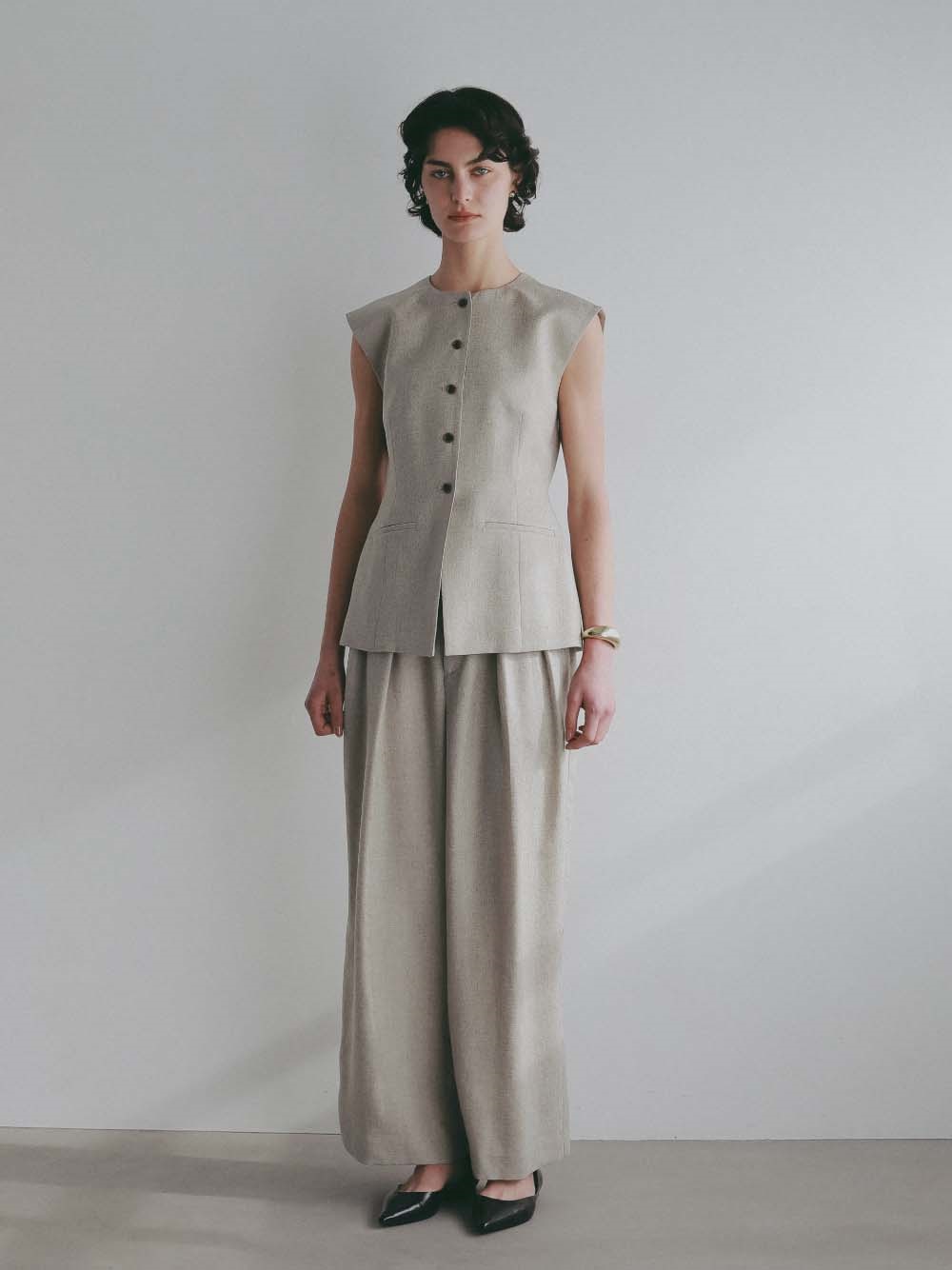 同素材のジレとのセットアップでのスタイリングもおすすめです。